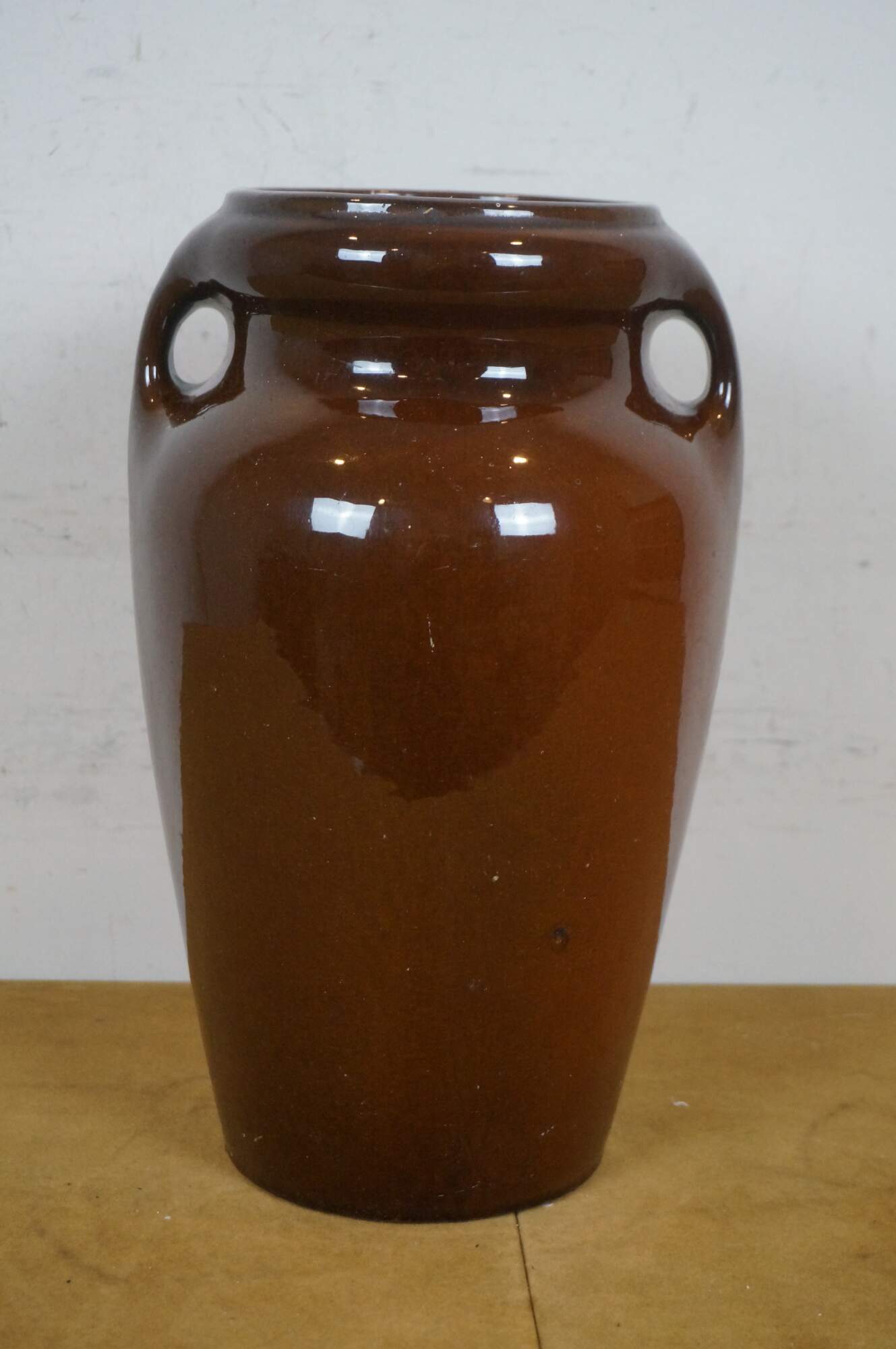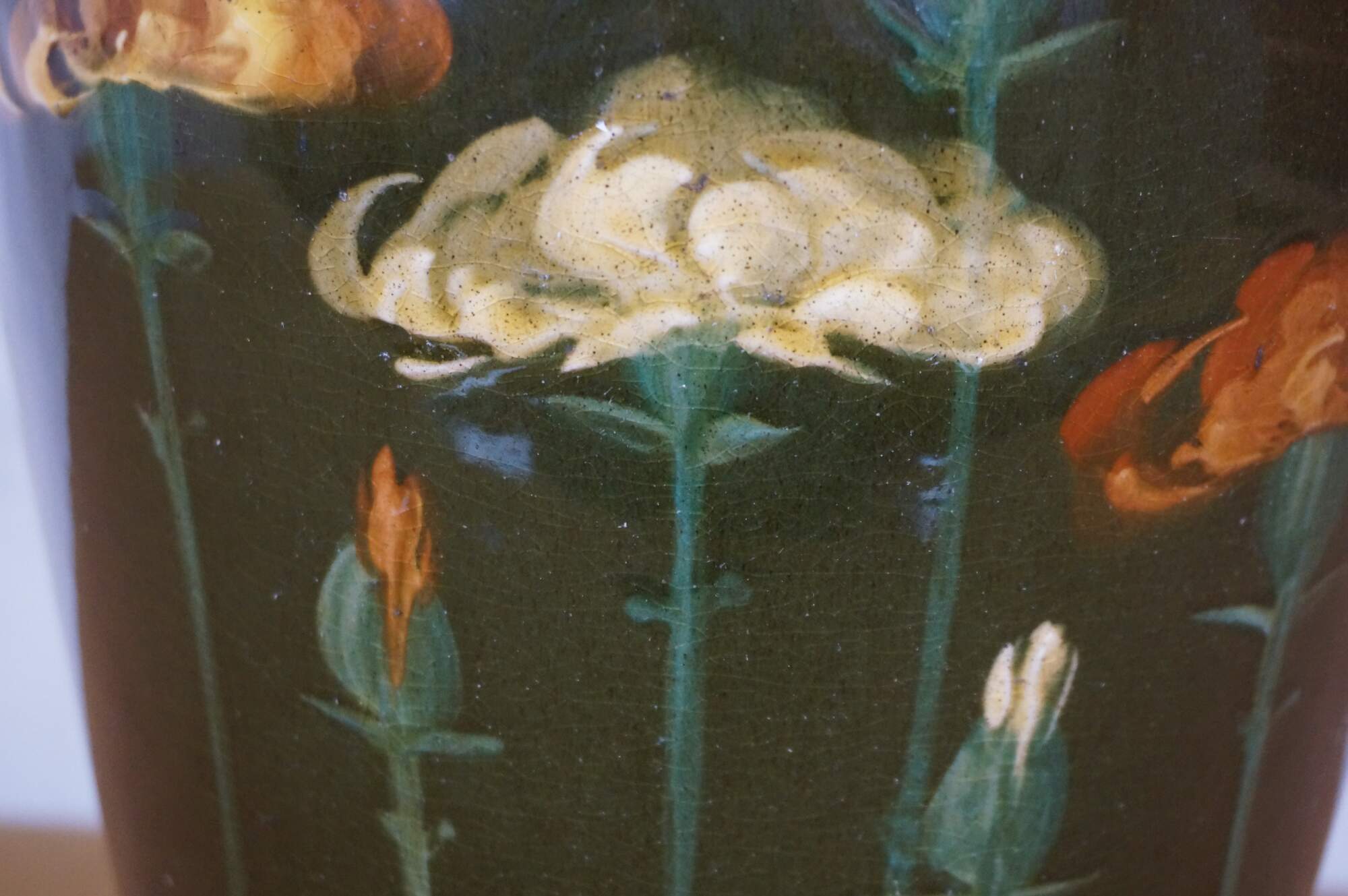 Early 20th century Loy-Nel-Art 02 vase by McCoy Pottery, first introduced sometime between 1905-1910. Cylindrical shape with slightly tapered base and low profile handles. Brown glaze with hand painted long stemmed flowers / carnations in orange and white.