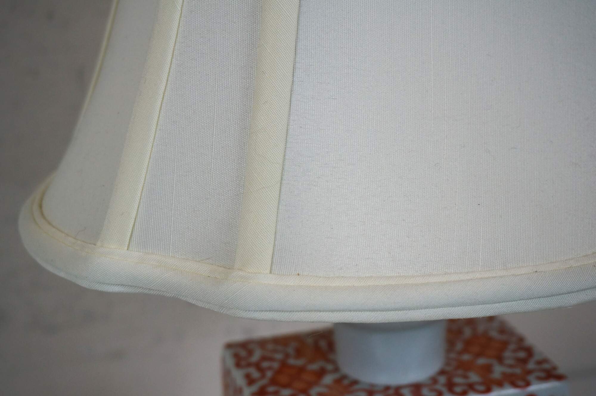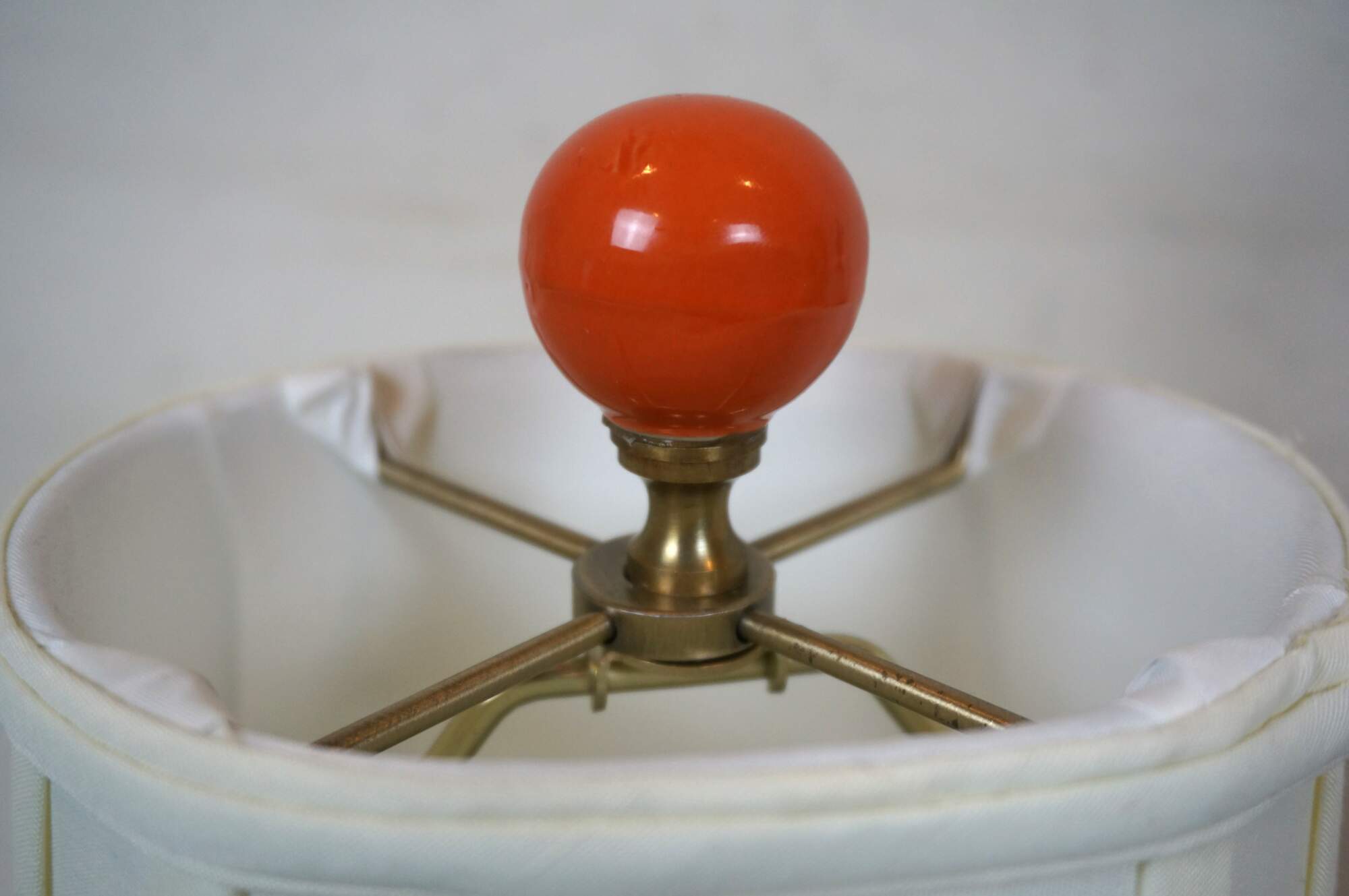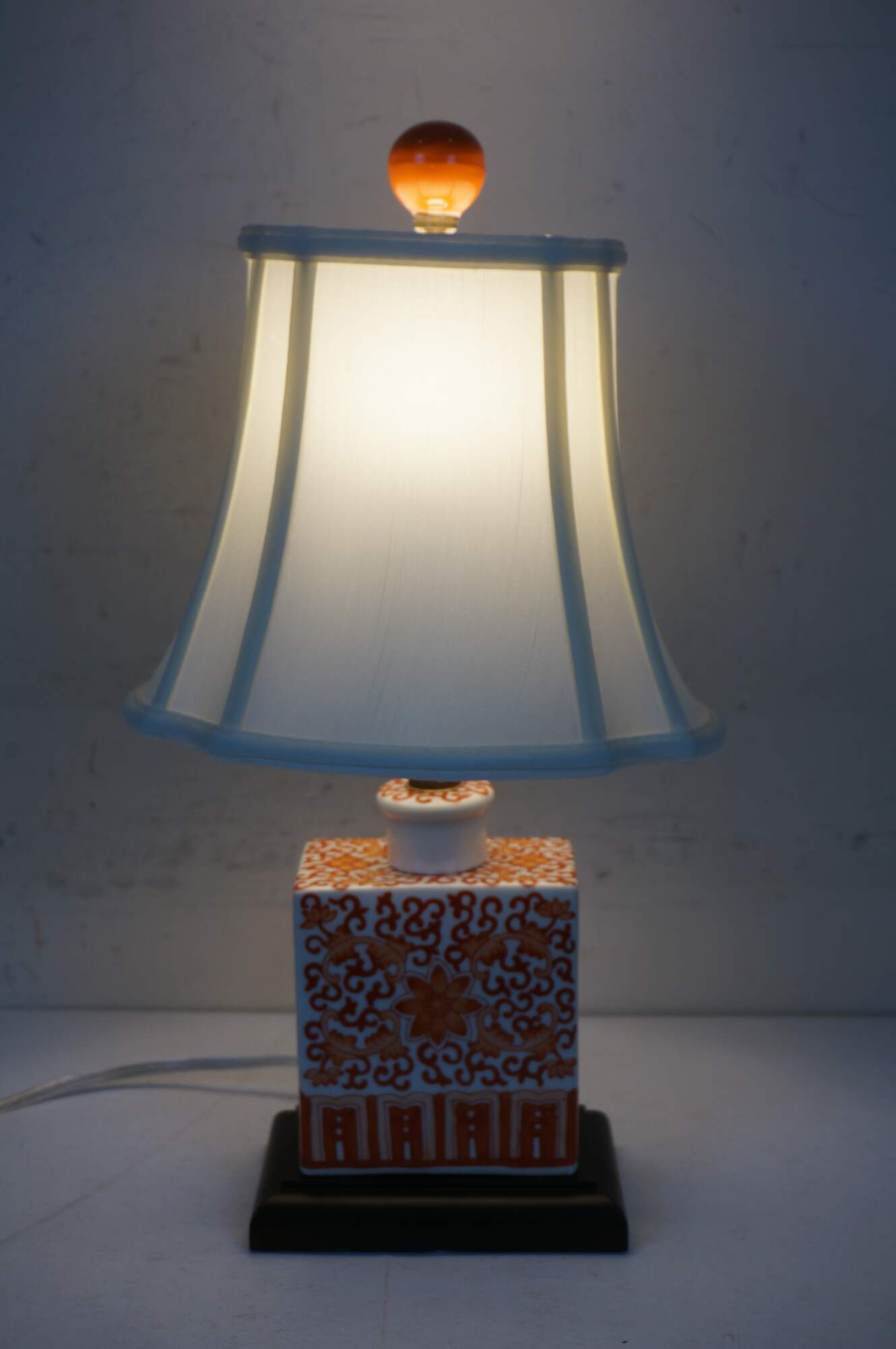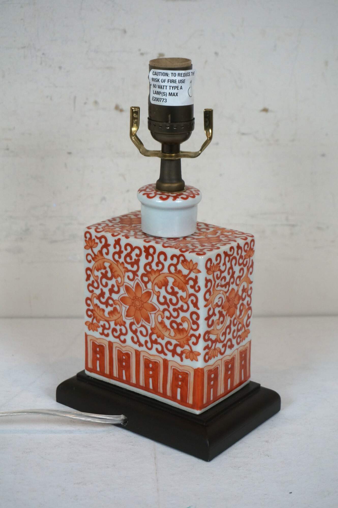 Beautiful chinoiserie table lamp crafted from an orange and white porcelain tea caddy decorated with leaves and flowers, set on a rectangular wood base. Includes harp, orange ceramic finial and white fabric shade.