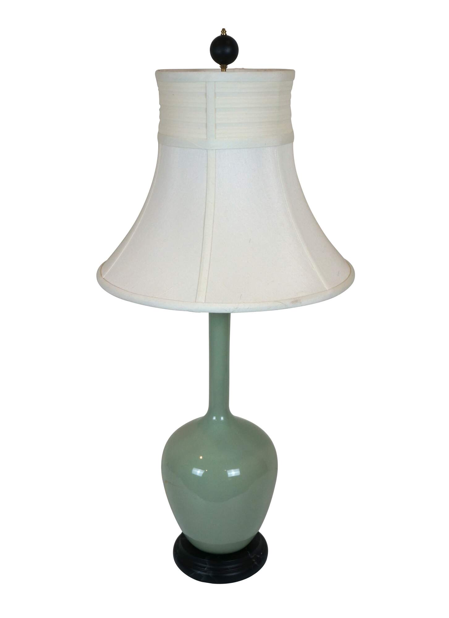 Chelsea House ceramic table lamp glazed in a soft celadon green with black faux marble base and brass hardware. Includes harp, black wood orb finial and a stylish white fabric shade. Made in China.