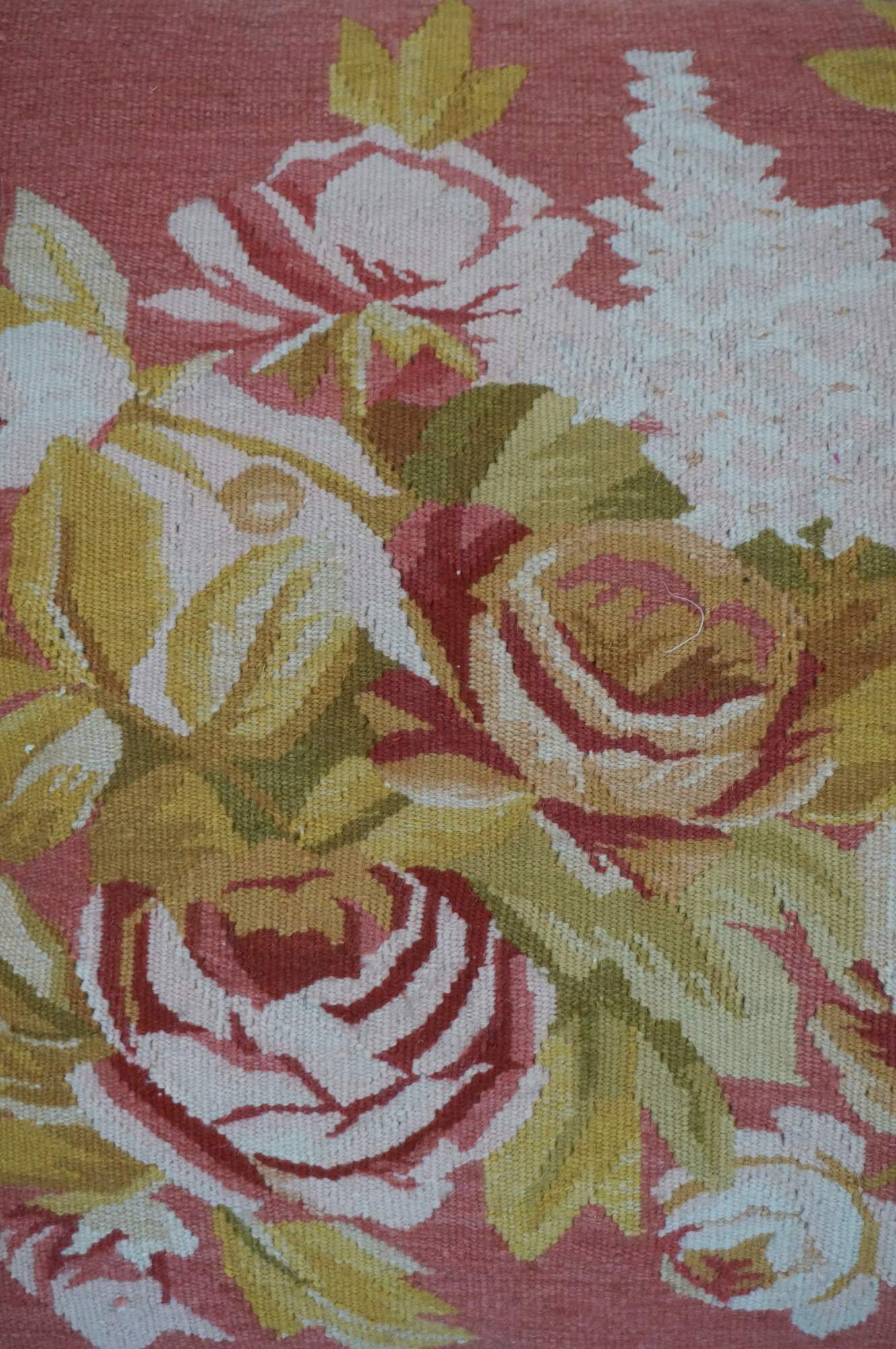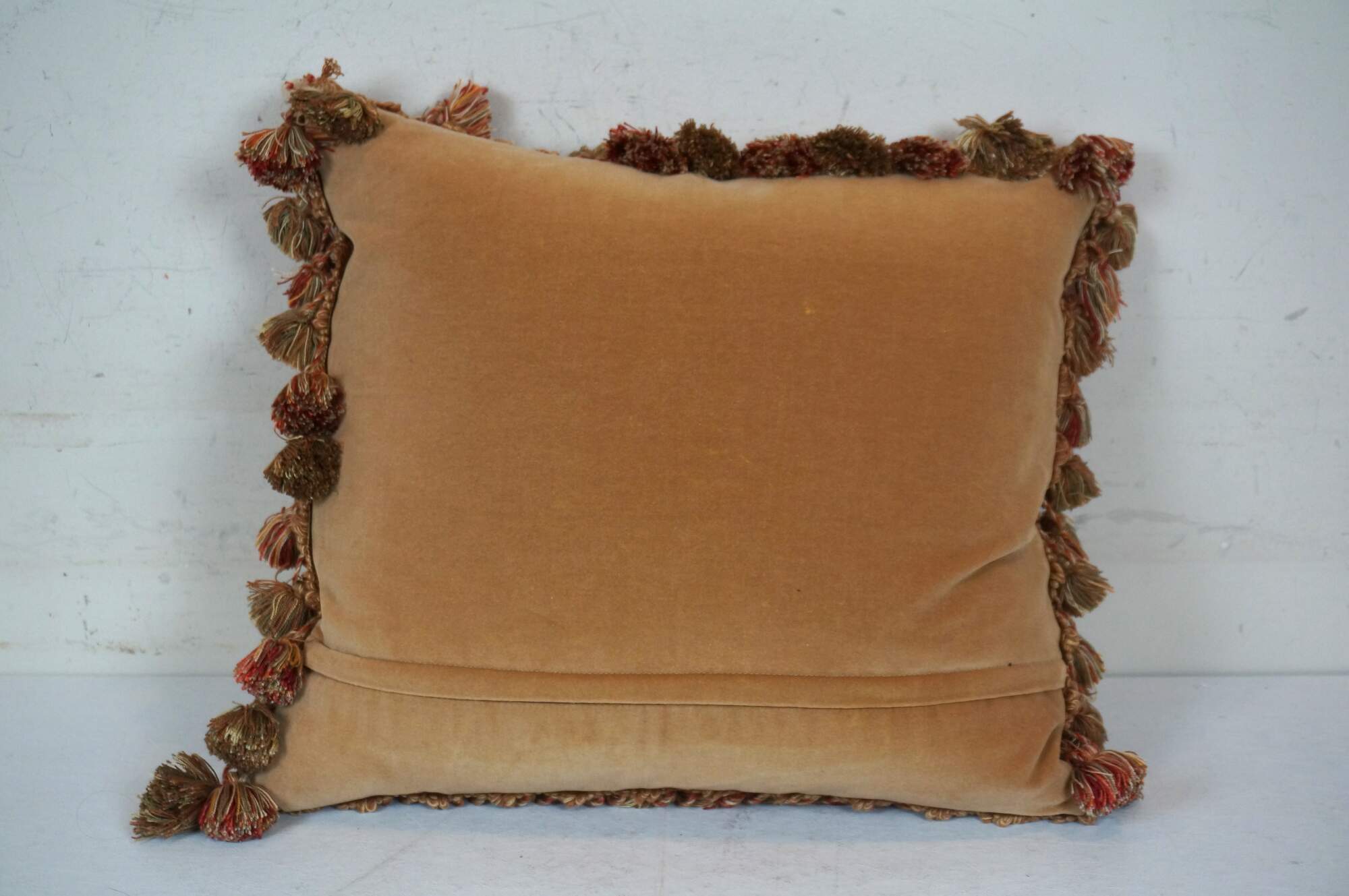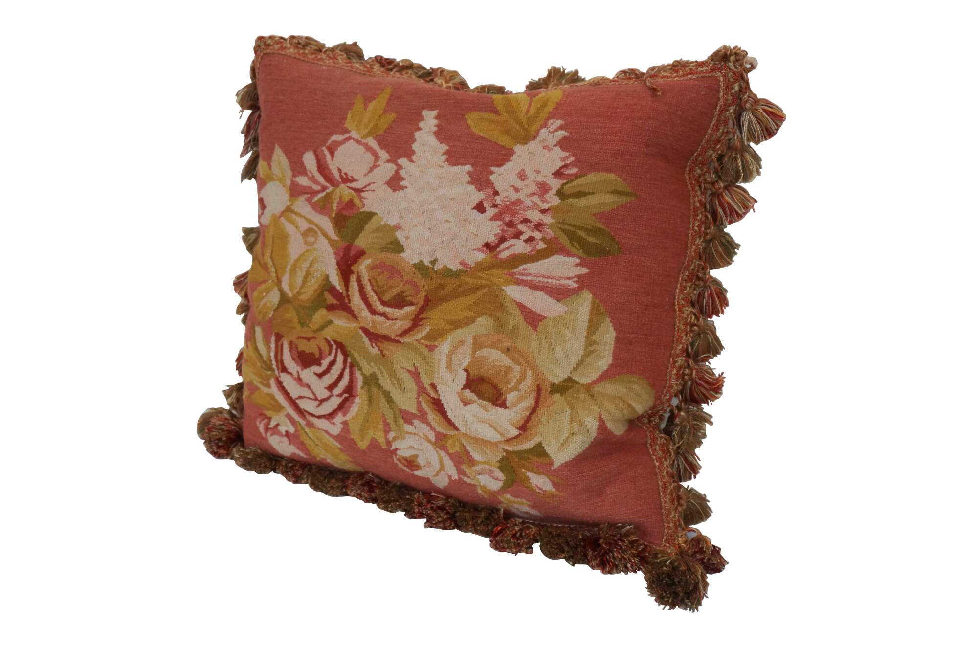 Late 20th century Capa - USA throw / lumbar pillow. 100% Wool tapestry front decorated with pink and yellow roses and lilacs on a salmon pink background. Beige 100% cotton velvet back. Rust and gold tassel trim. Zipper closure. Down fill.