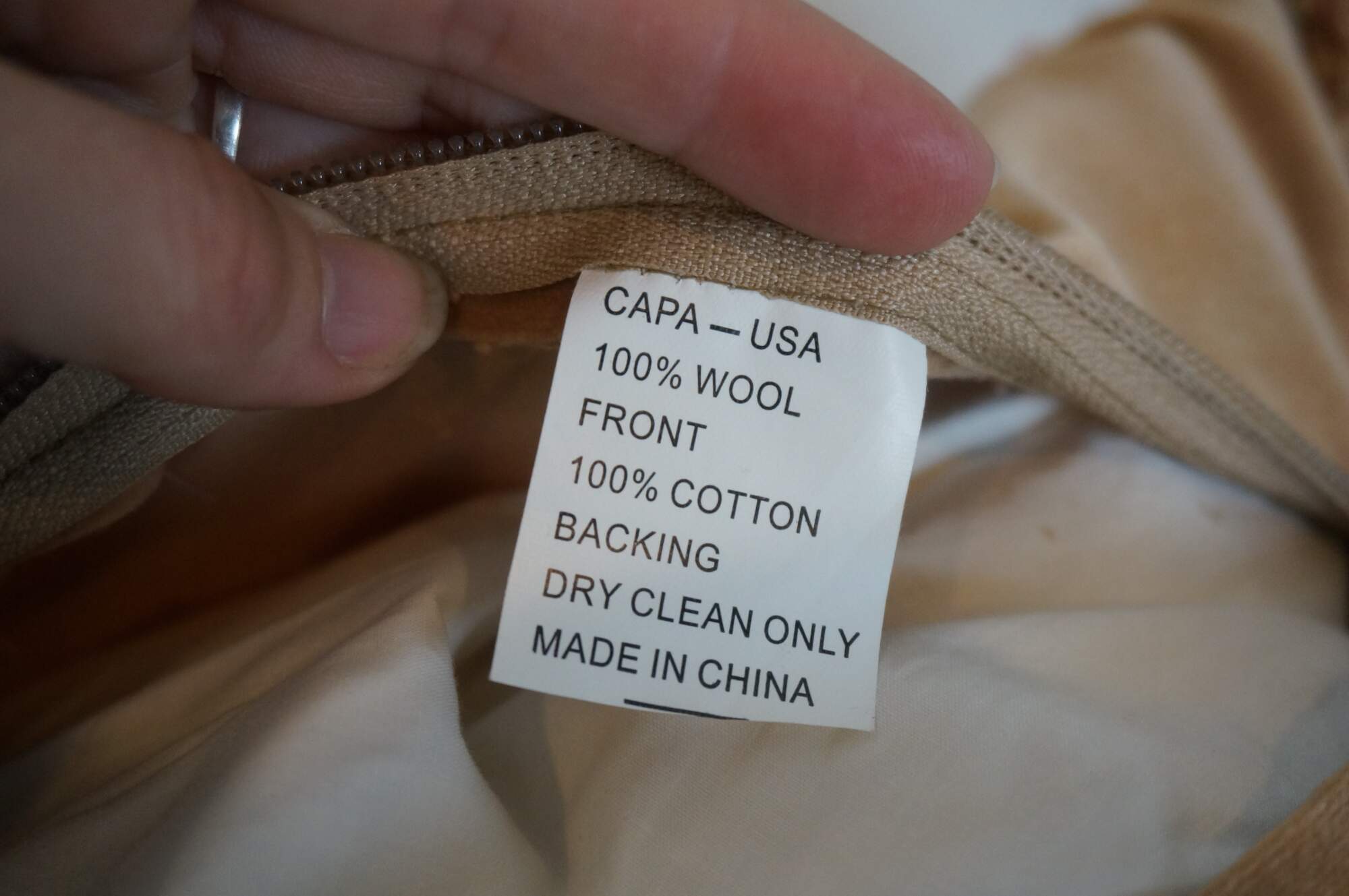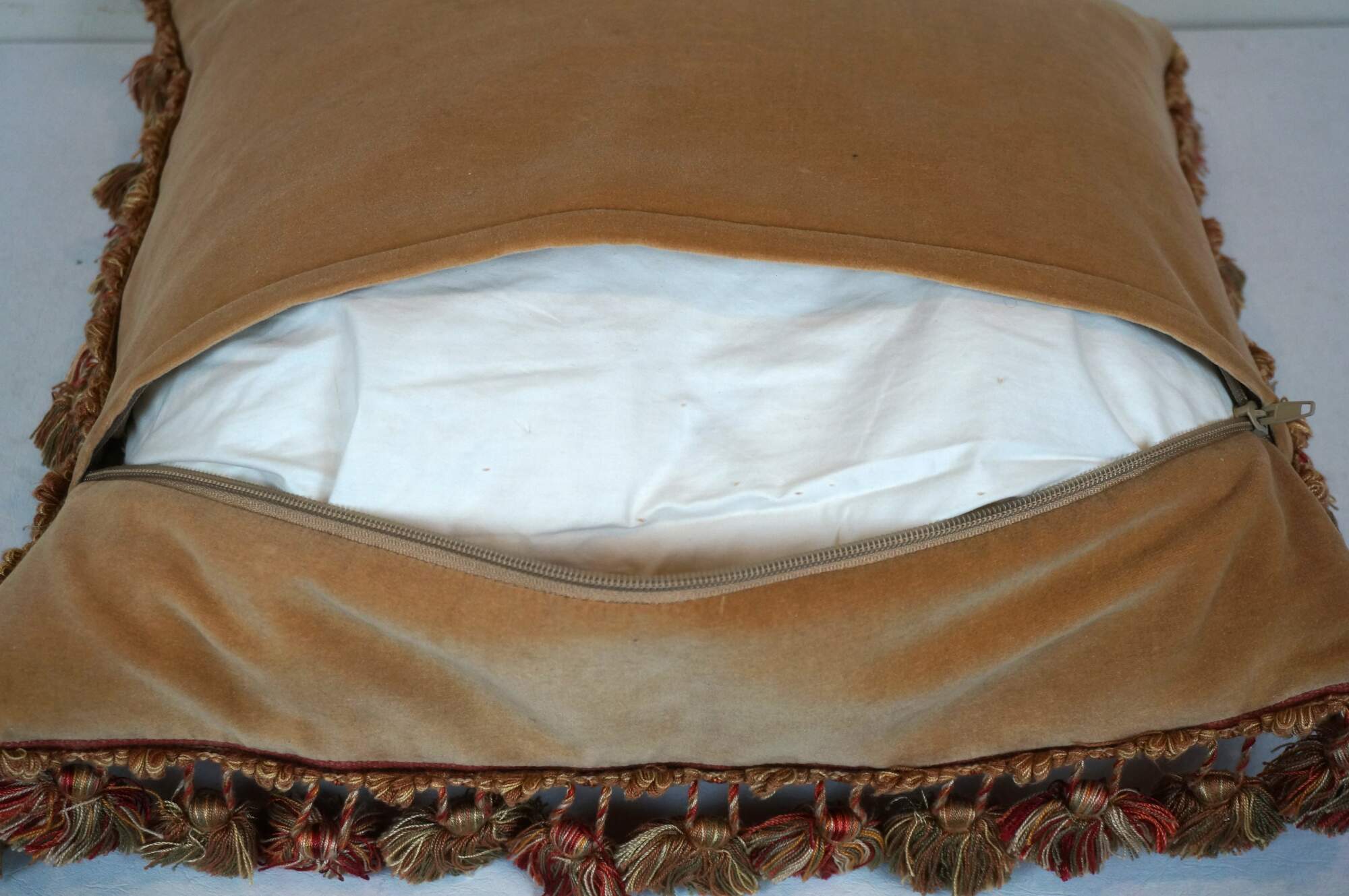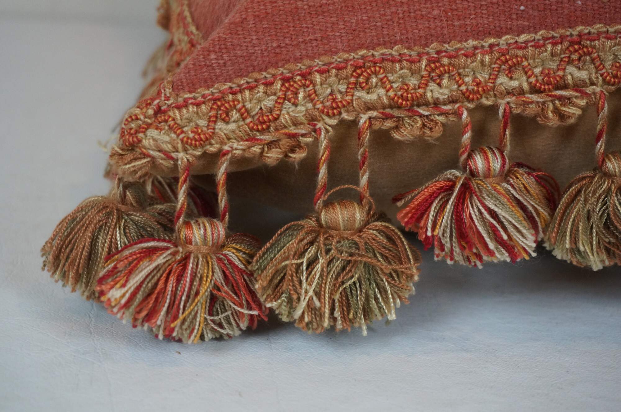 Late 20th century Capa - USA throw / lumbar pillow. 100% Wool tapestry front decorated with pink and yellow roses and lilacs on a salmon pink background. Beige 100% cotton velvet back. Rust and gold tassel trim. Zipper closure. Down fill.