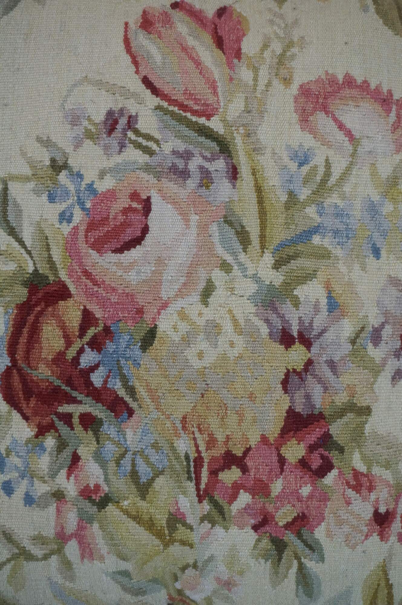 Pair of late 20th century Capa - USA throw pillows. 100% Wool tapestry fronts featuring a mixed bouquet of flowers on a light beige background. Olive and pink tassel trim. Beige 100% cotton velvet backing. Zipper closure. Down fill.