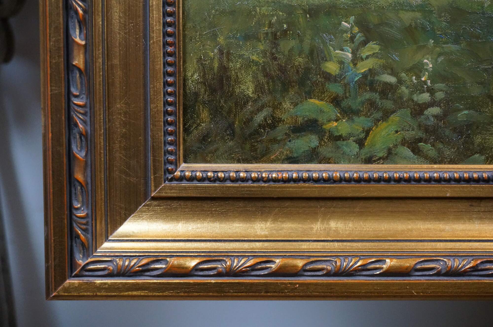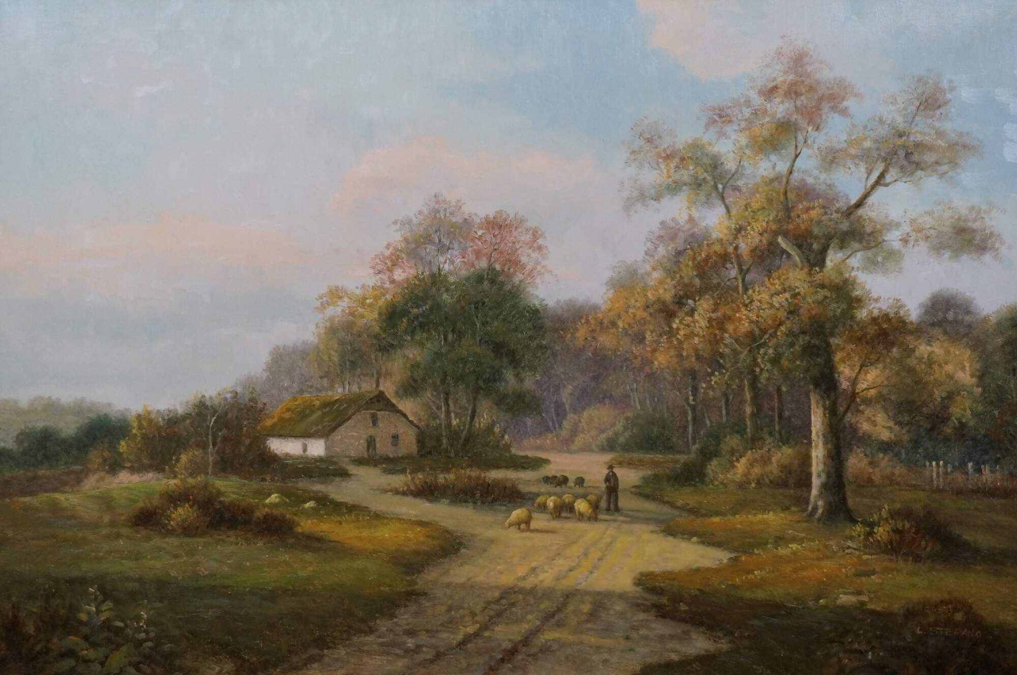 Charming 20th century impressionist pastoral landscape painting by L stepano, signed lower right. The oil painting features a European farm or cottage scene with sheep and cattle grazing along the drive with the farmer. The painting showcases beautiful color with luminous trees. The oil is on canvas and framed in wood with a gold finish.