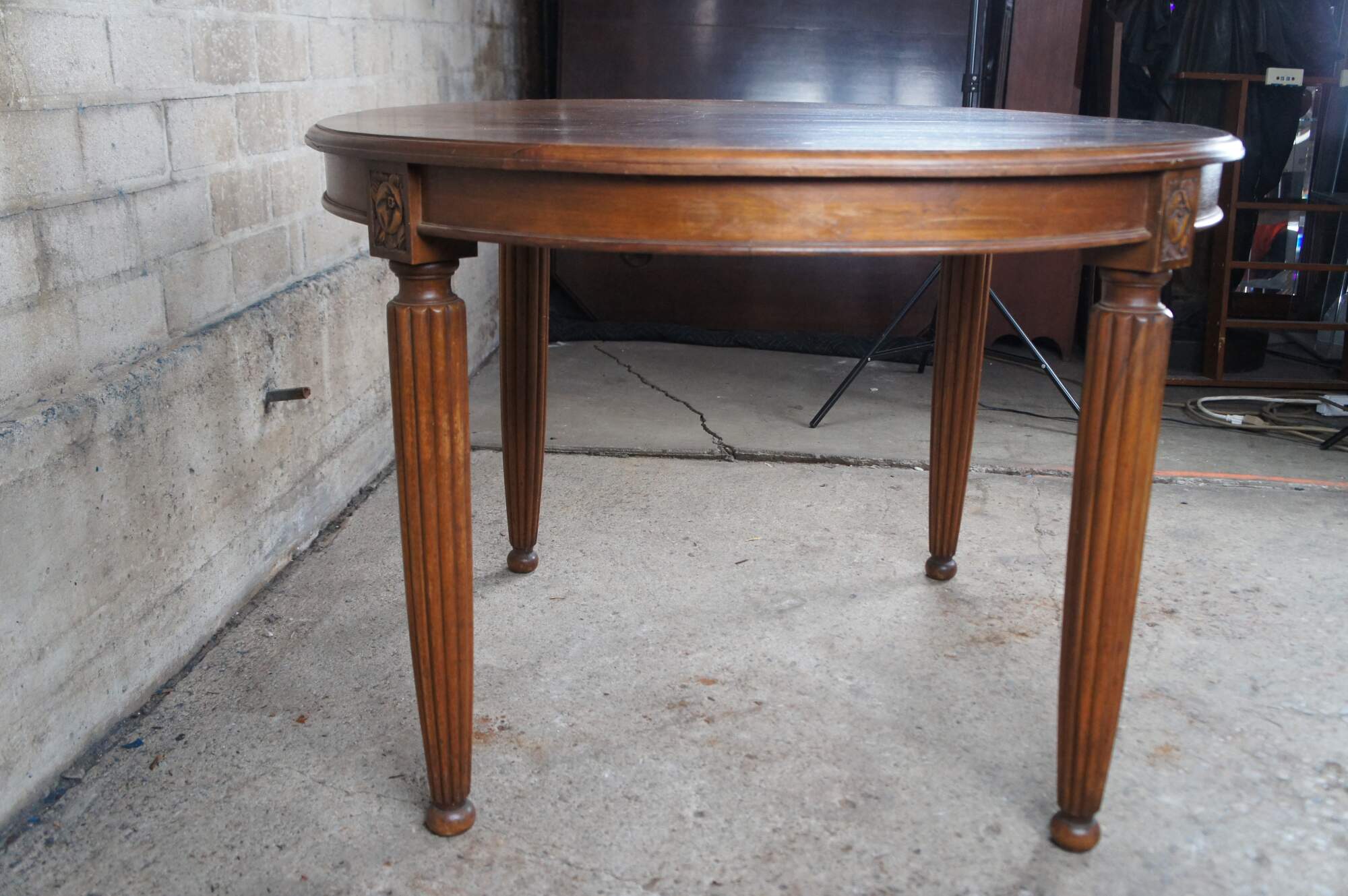 French Louis XVI style round walnut dining table. Features four reeded and tapered legs leading to a bun foot. Each legg has a carved block along the top. The table originally had leaves which are no longer with it.