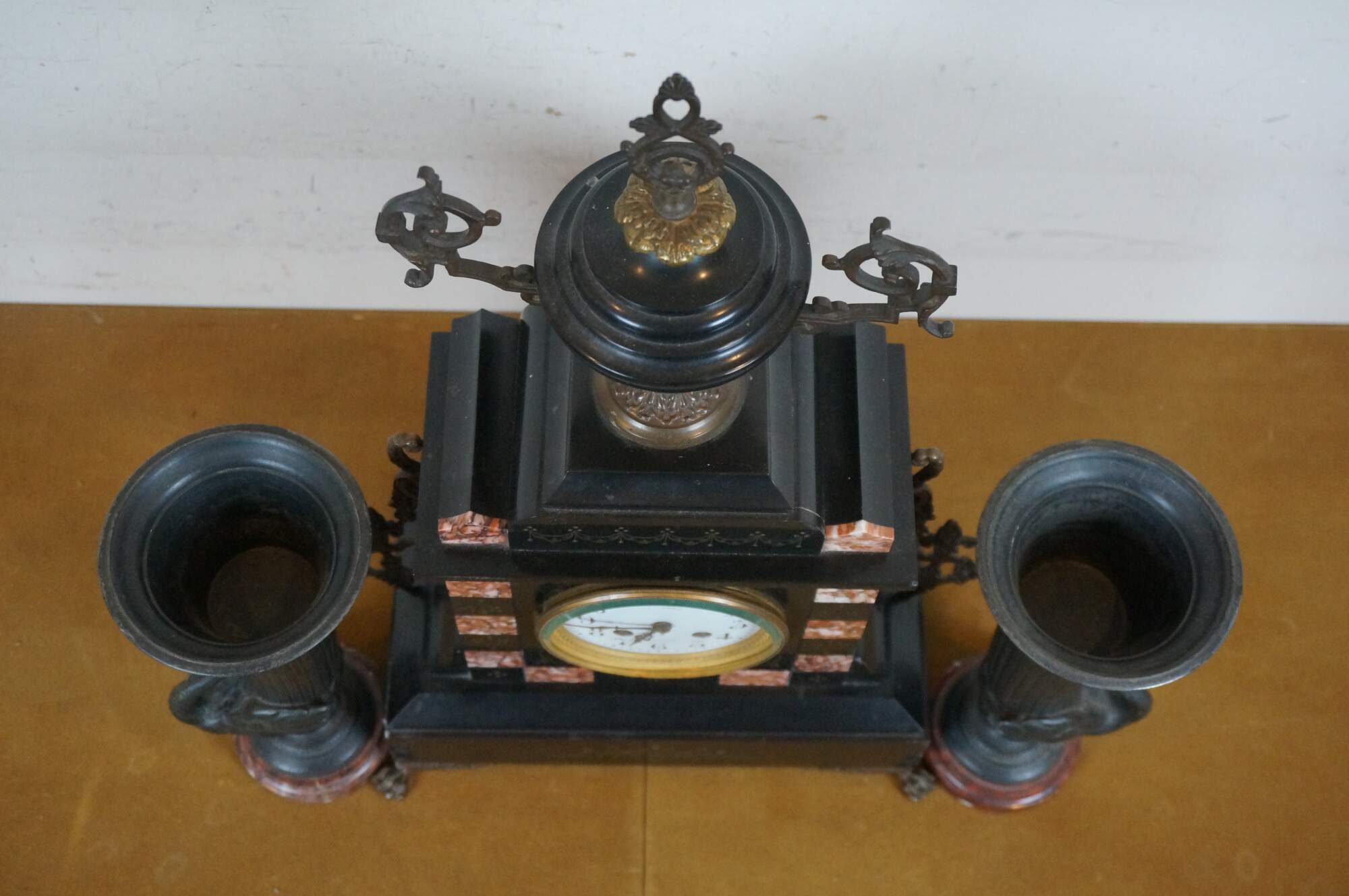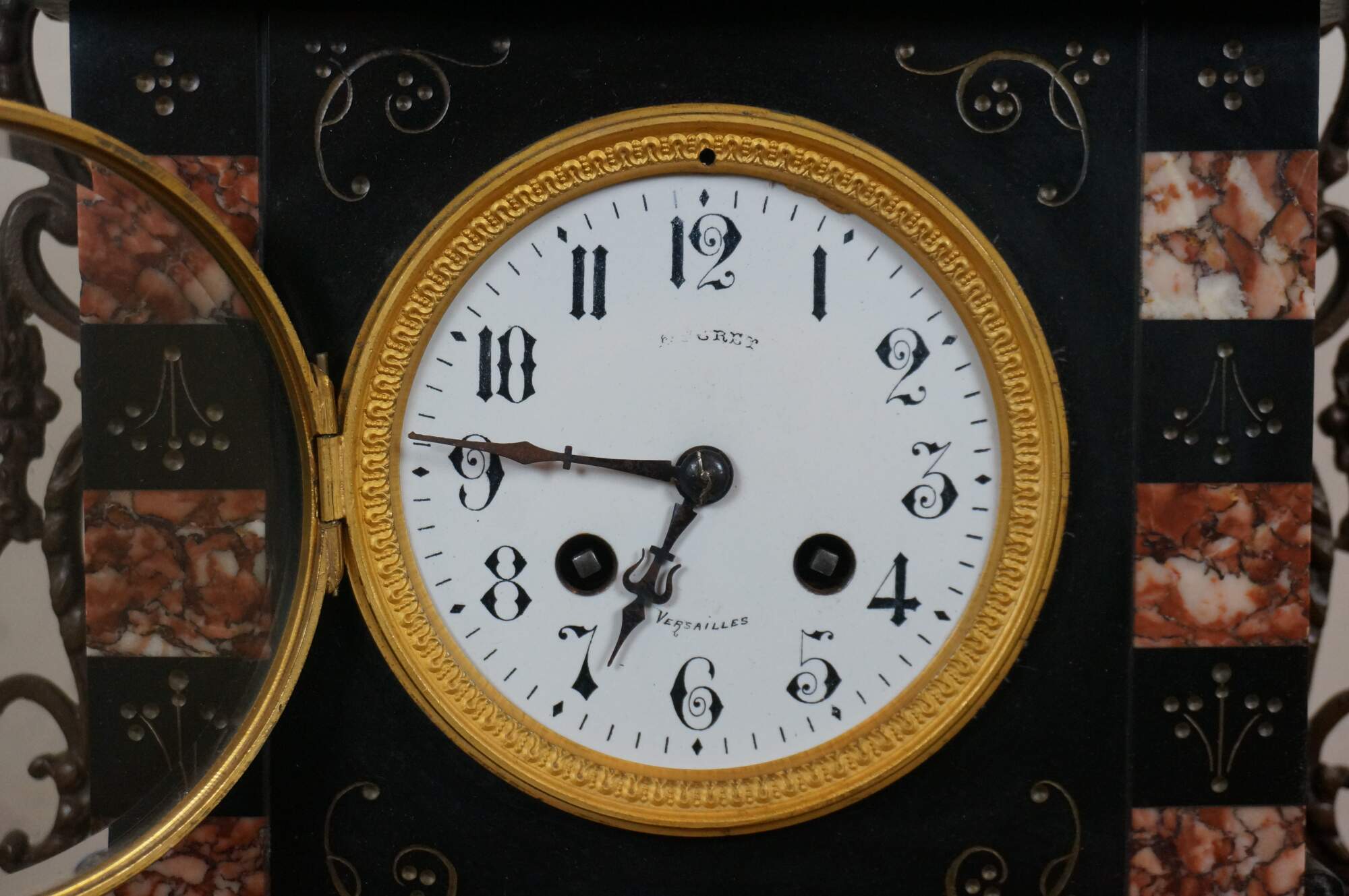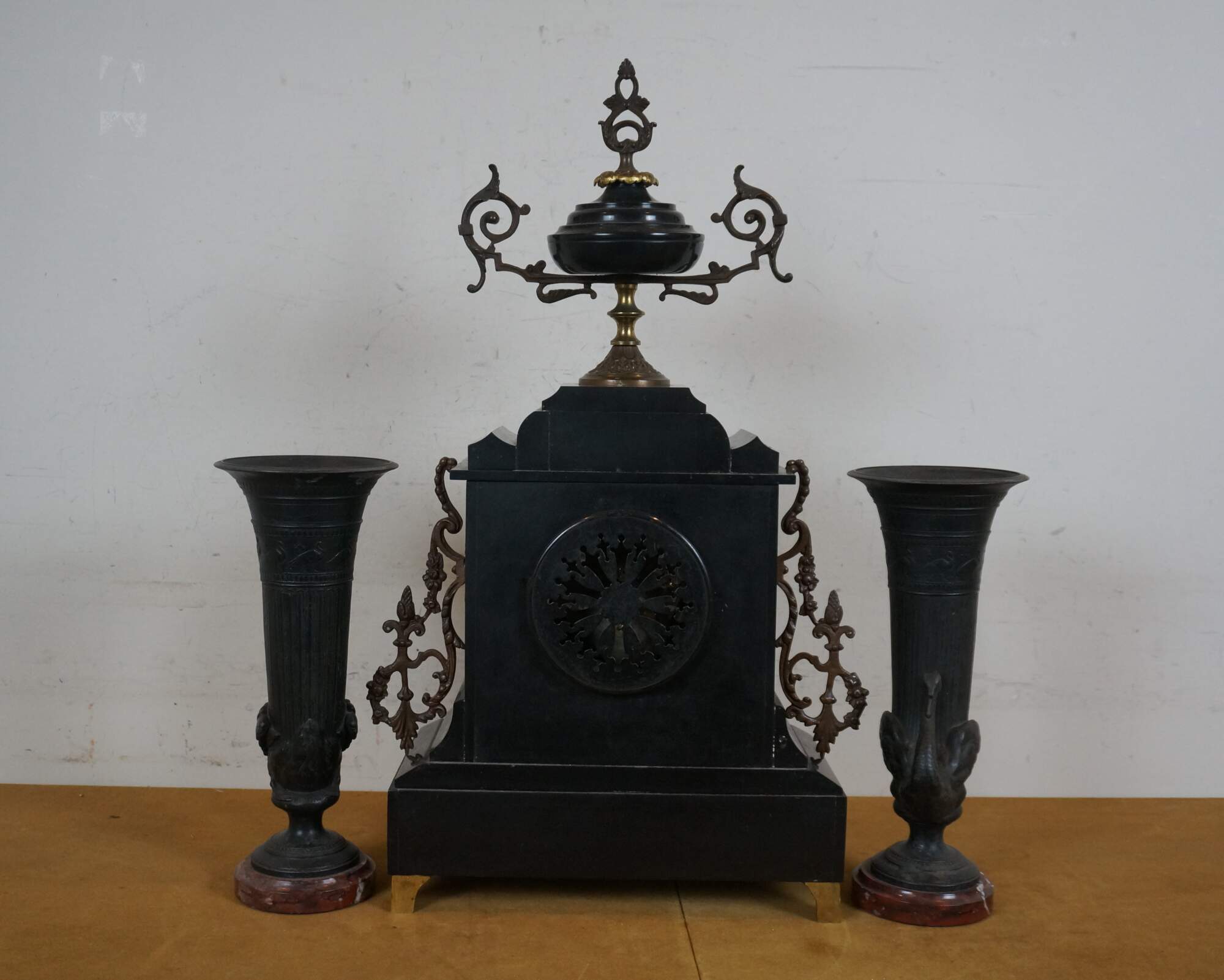 Late 19th Century L. Marti et Cie French Napoleon III style Mantel Clock & Garniture Set. The beautifully designed lcock is made from slate with filigree engraving, reuge marble panels, ornate bronze detail and a trophy urn. The face is enameled with a Roman dial and marked Versailles. The bronze figural garniture urns showcase swans at the base of the vessel with an additional scene wrapped around the mid upper section. Each garniture is footed with a Reuge Marble base. A perfect set that will display nicely along any mantel, office, library or parlor setting.