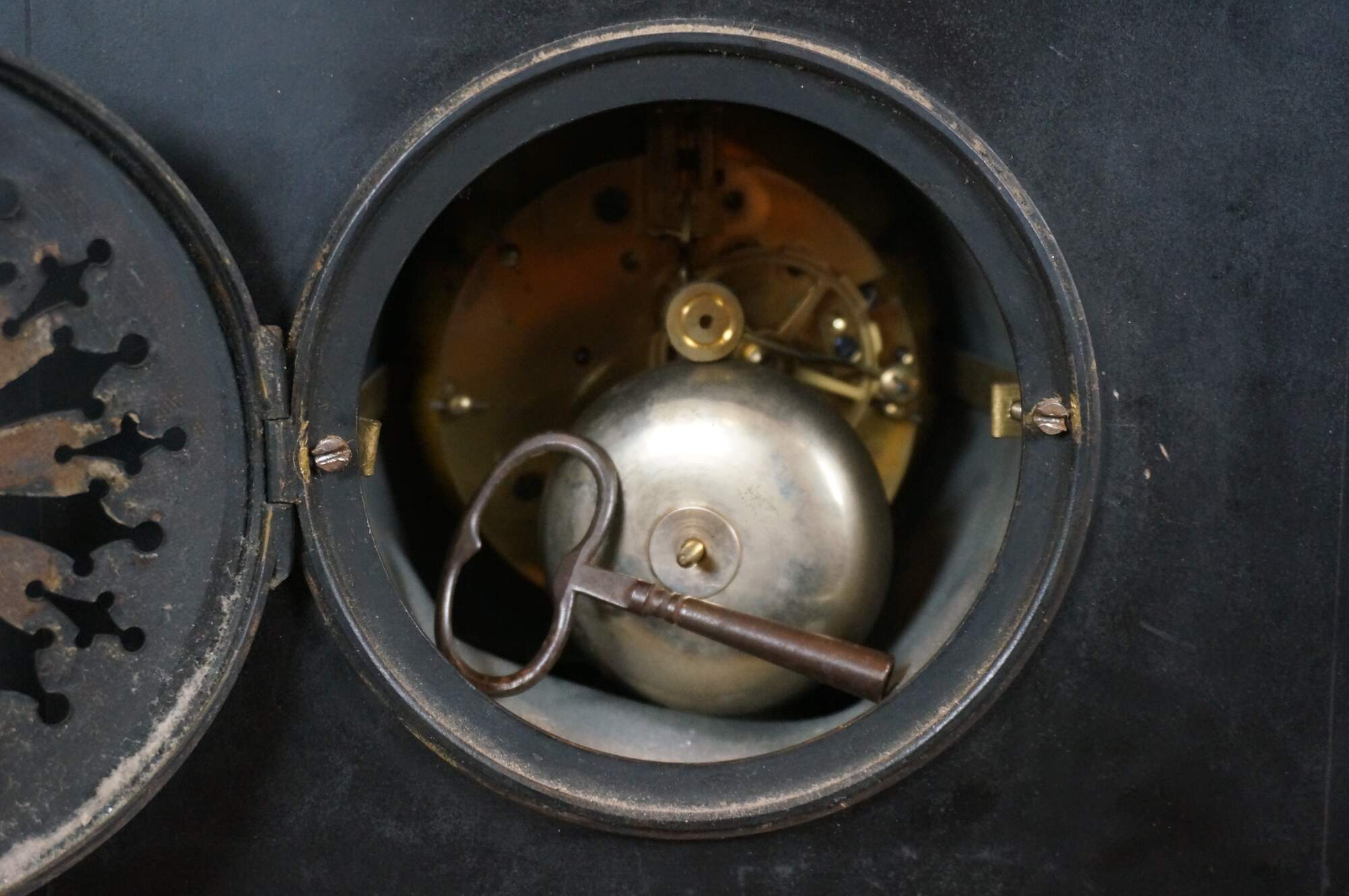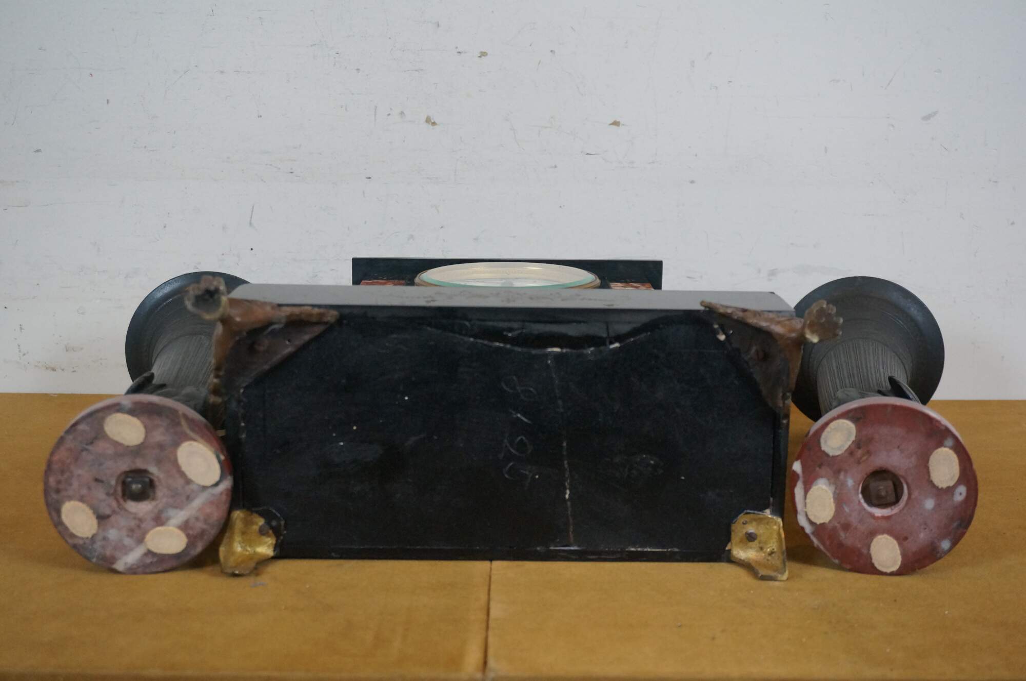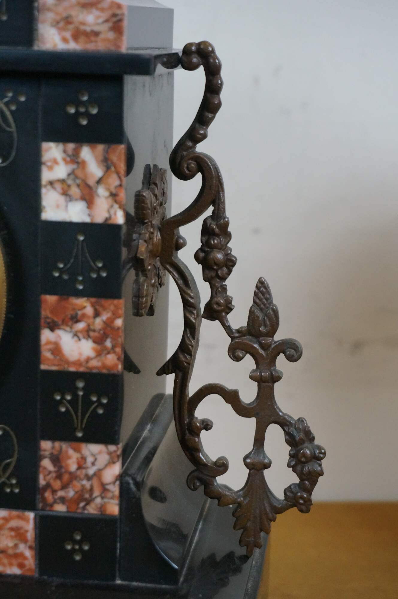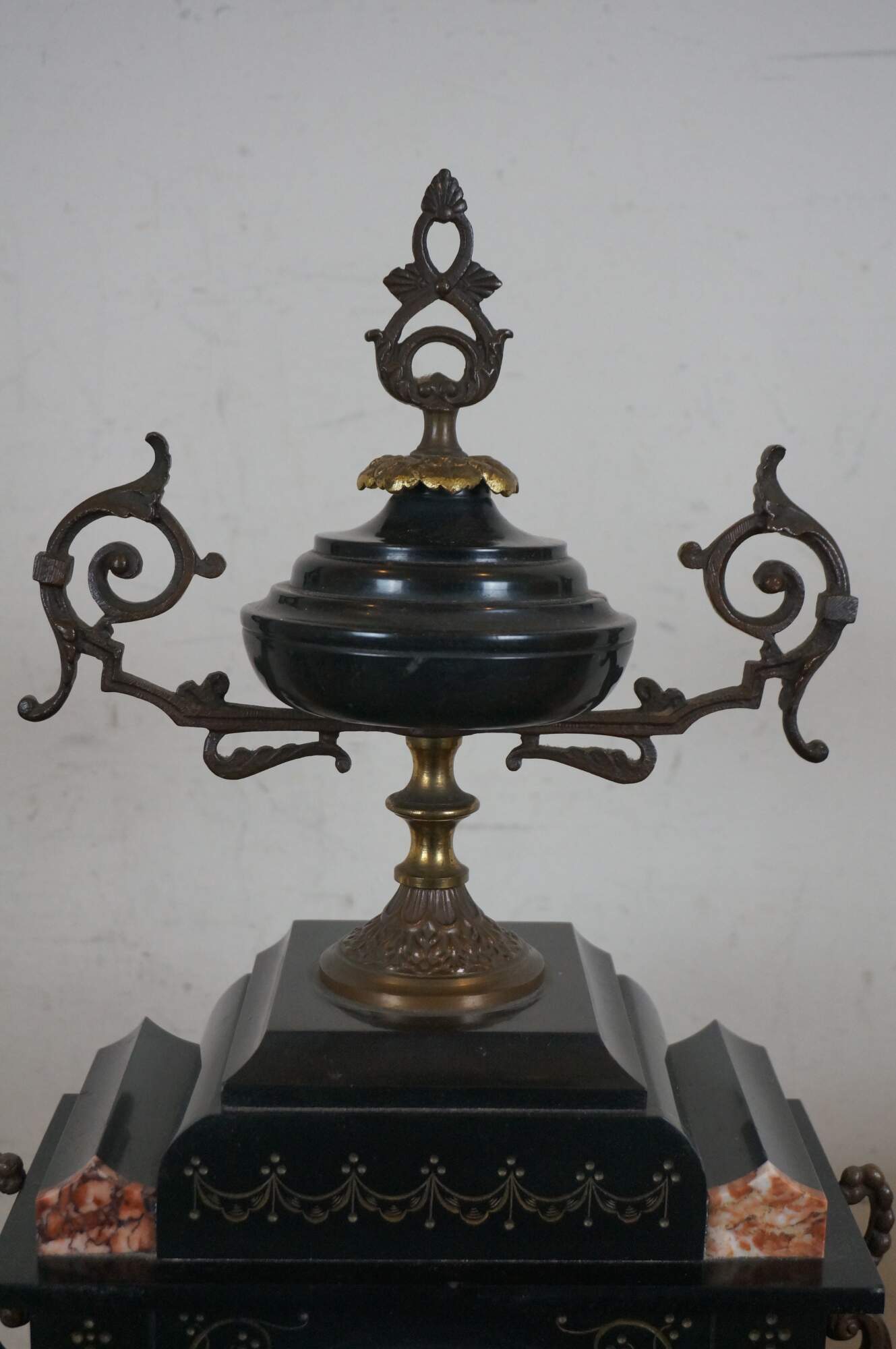Late 19th Century L. Marti et Cie French Napoleon III style Mantel Clock & Garniture Set. The beautifully designed lcock is made from slate with filigree engraving, reuge marble panels, ornate bronze detail and a trophy urn. The face is enameled with a Roman dial and marked Versailles. The bronze figural garniture urns showcase swans at the base of the vessel with an additional scene wrapped around the mid upper section. Each garniture is footed with a Reuge Marble base. A perfect set that will display nicely along any mantel, office, library or parlor setting.