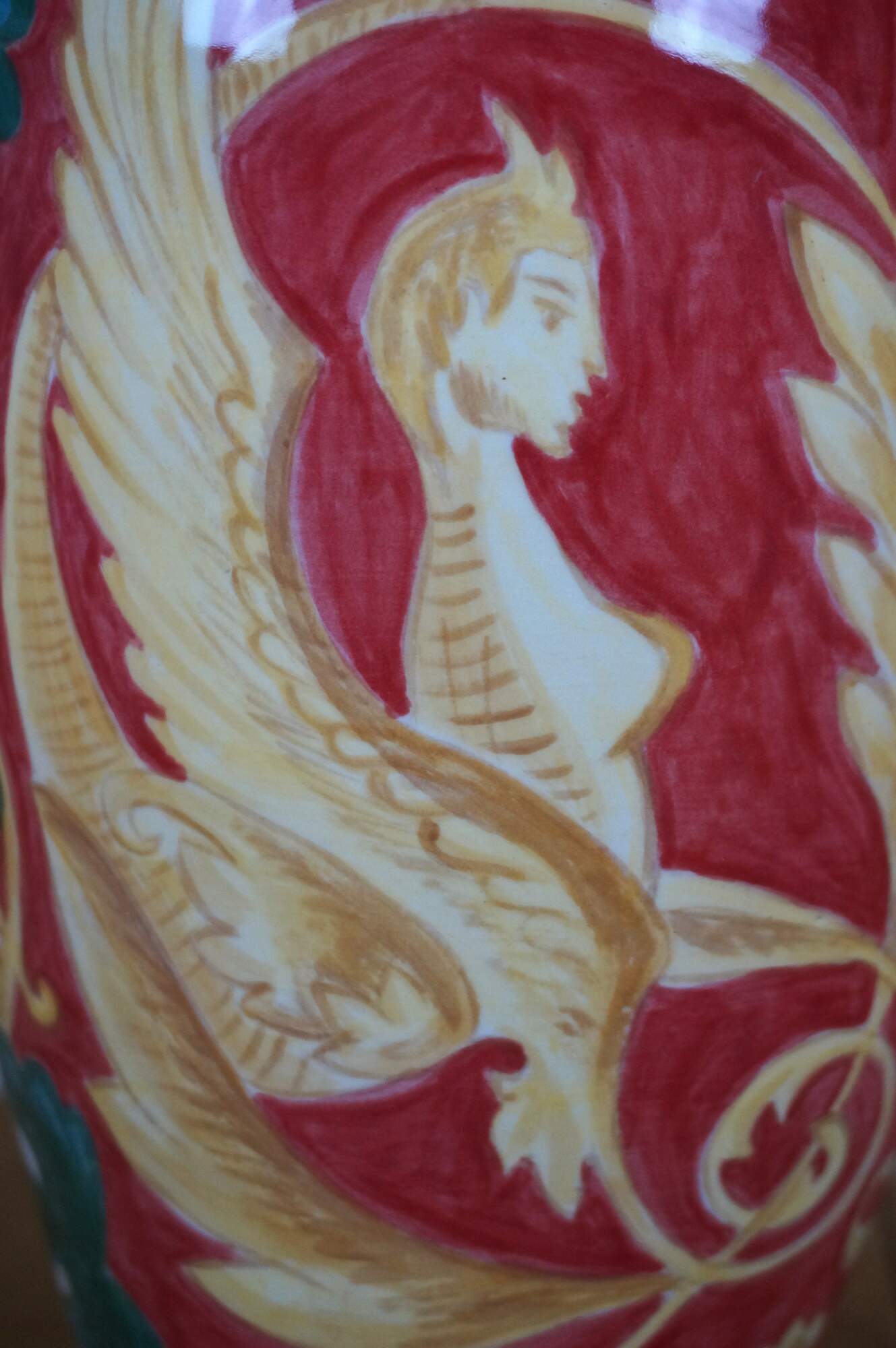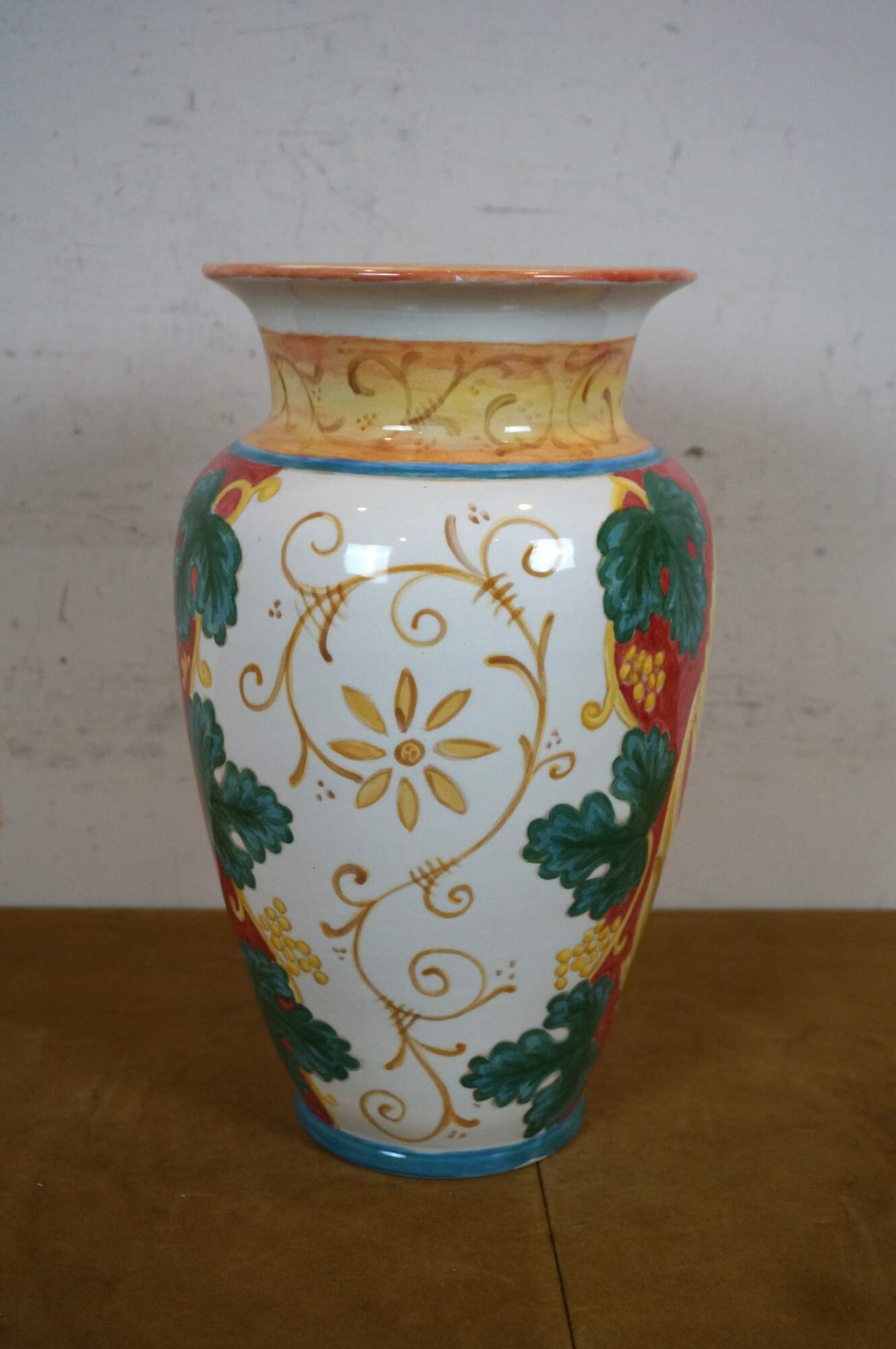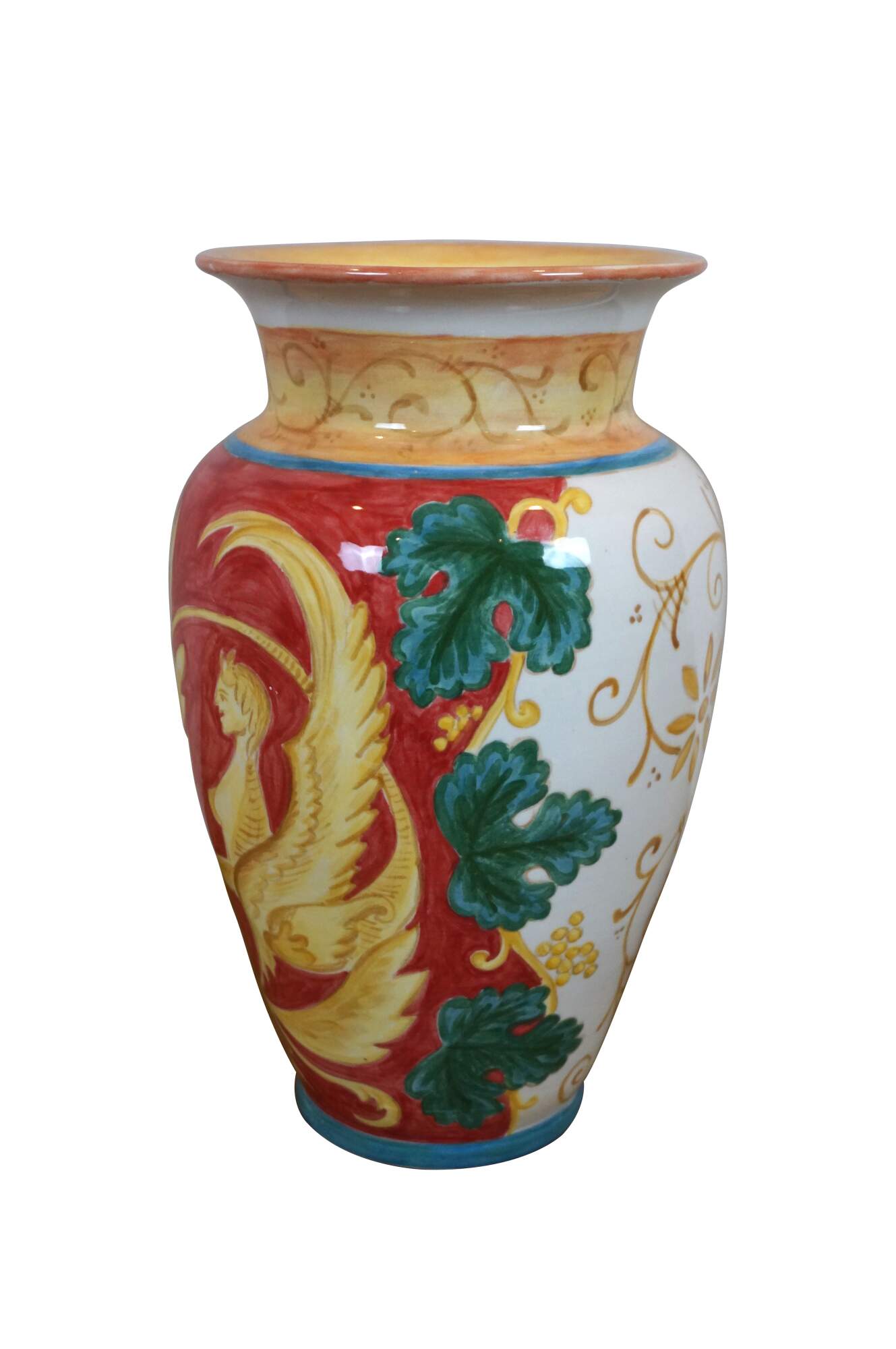 A colorful handpainted Deruta Style Italian Ceramic Figured Art Pottery Flower Vase. Features regal foliate, figures, flowers, filigree and acanthus detail.