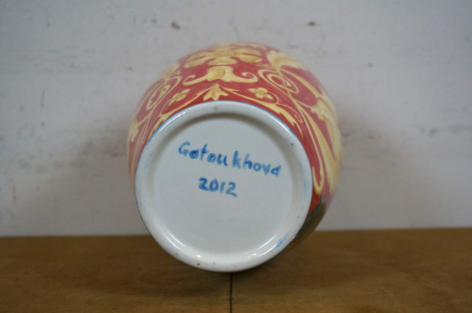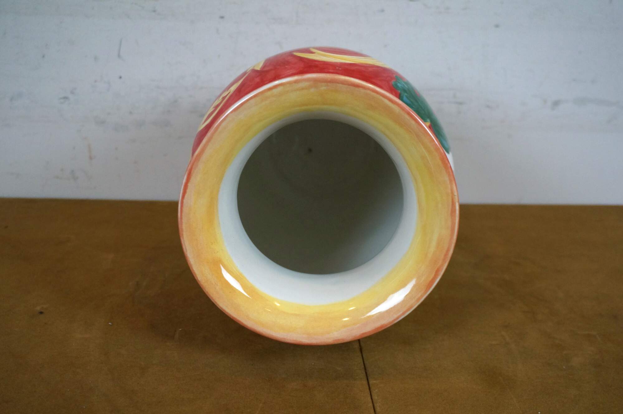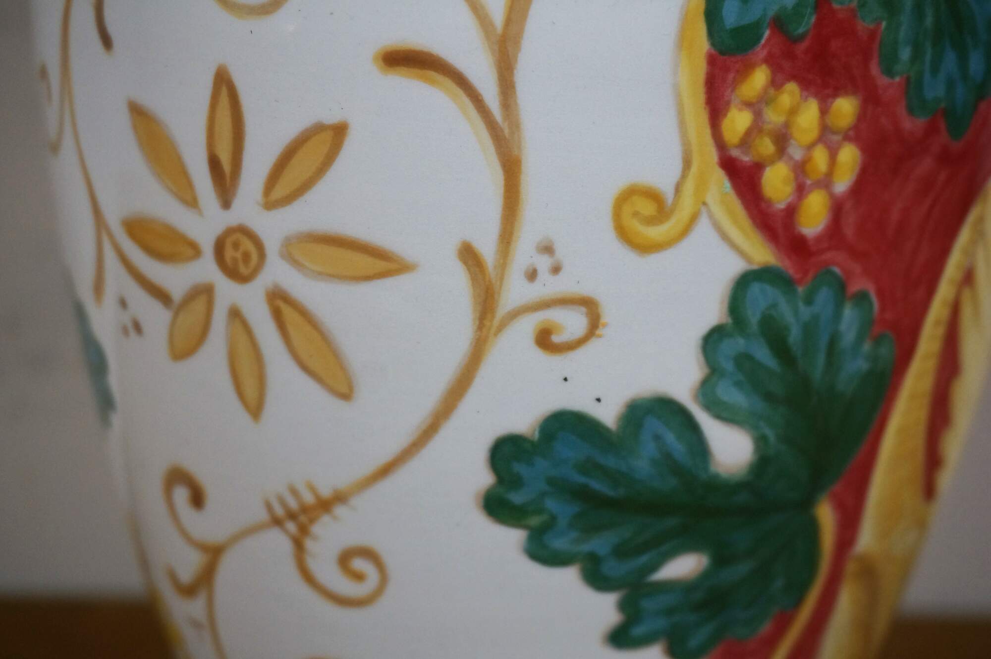 A colorful handpainted Deruta Style Italian Ceramic Figured Art Pottery Flower Vase. Features regal foliate, figures, flowers, filigree and acanthus detail.