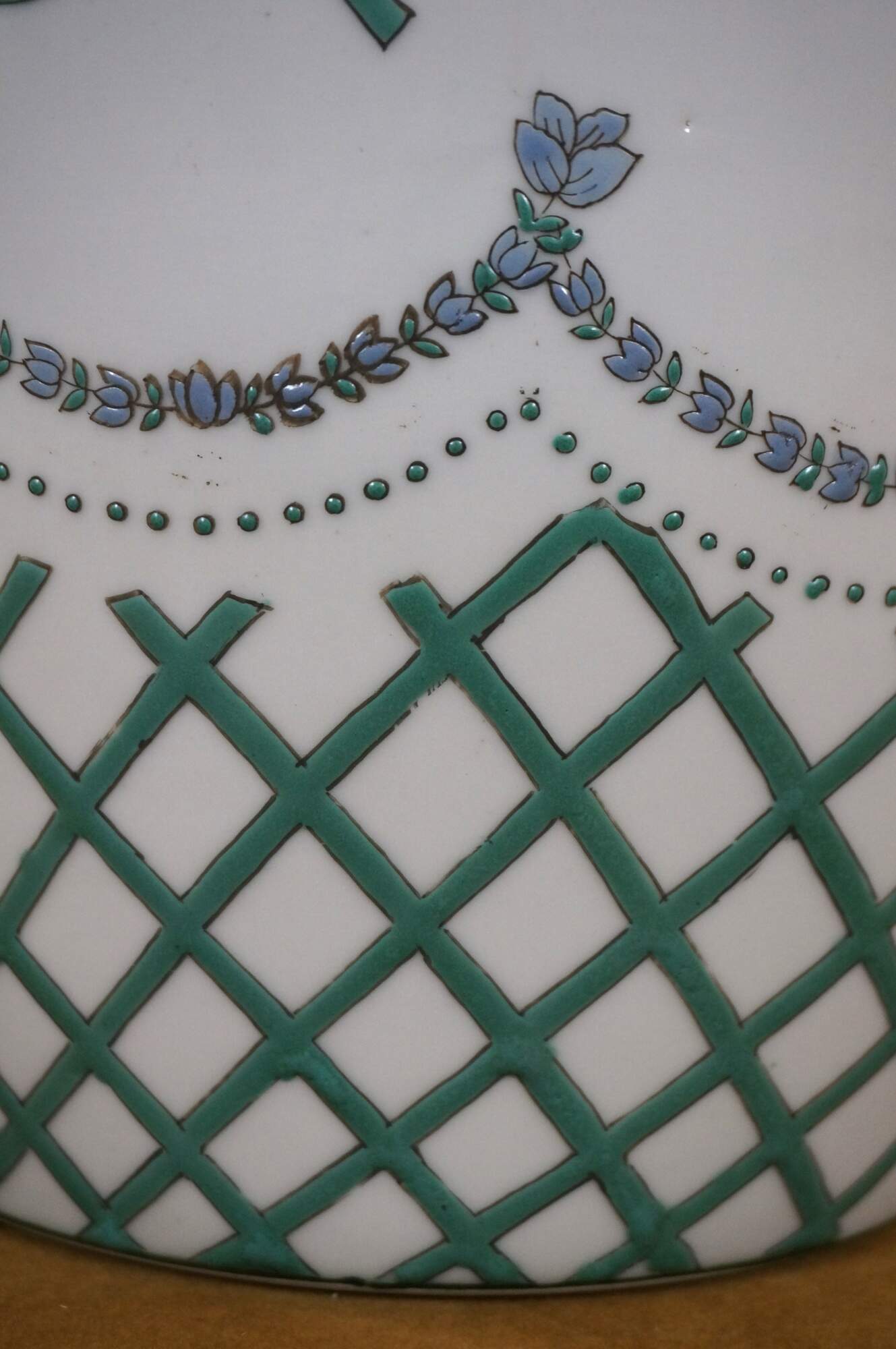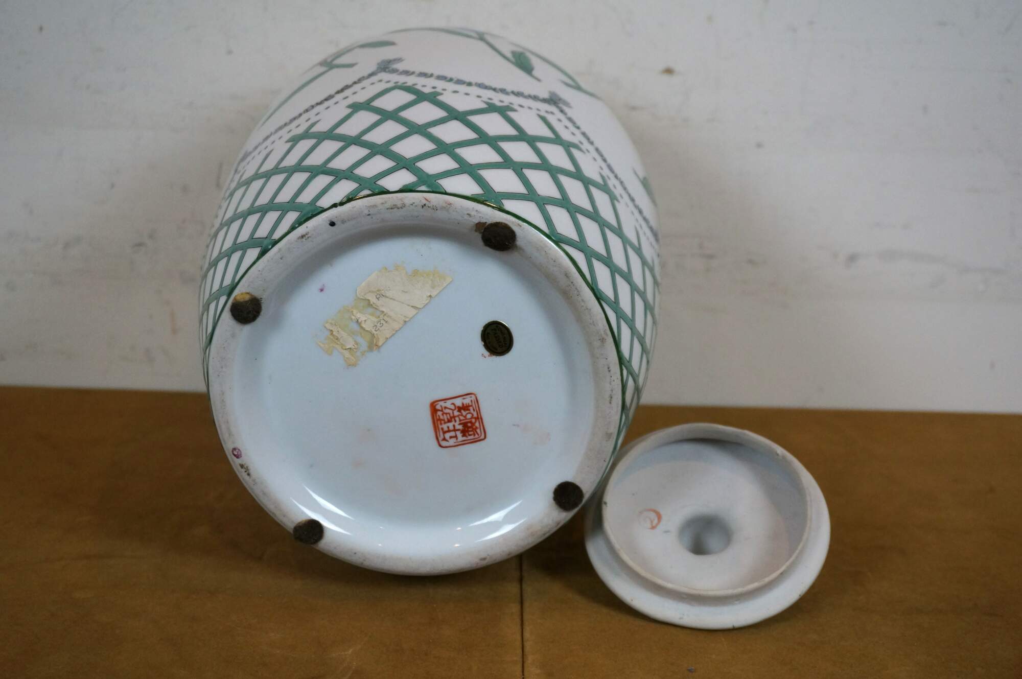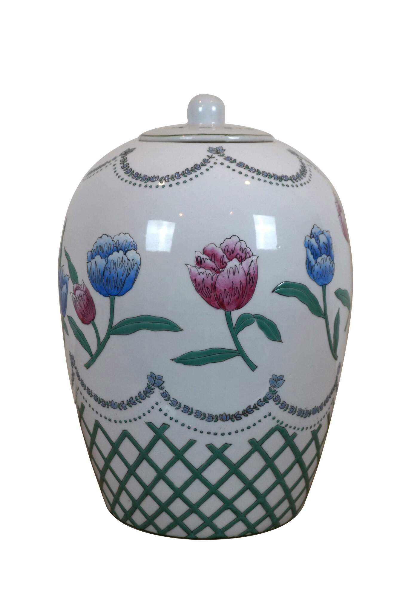 Vintage Chinese Ginger Jar. Features a white background with a green lattice-wrapped base, floral swags, and roses.