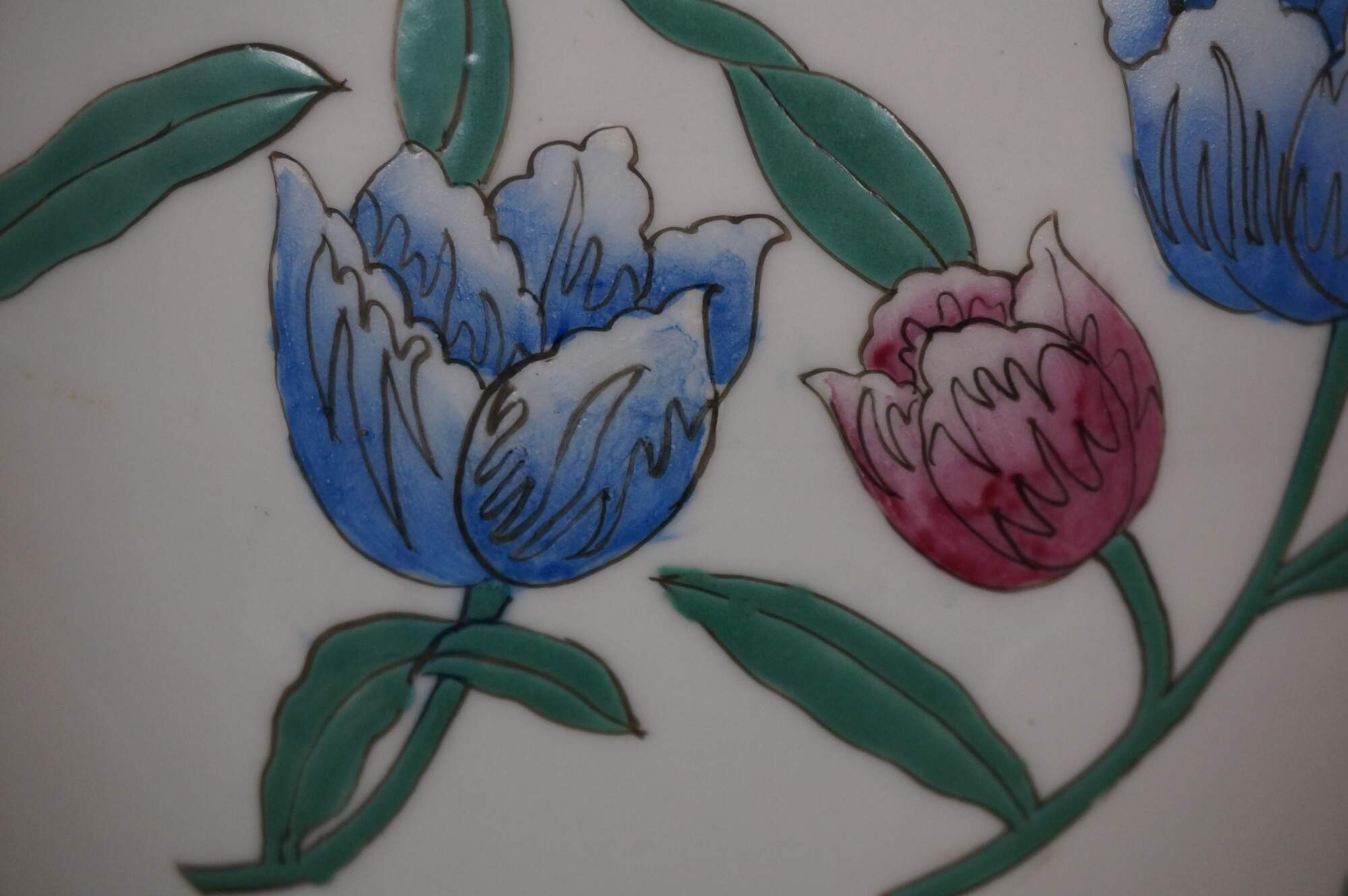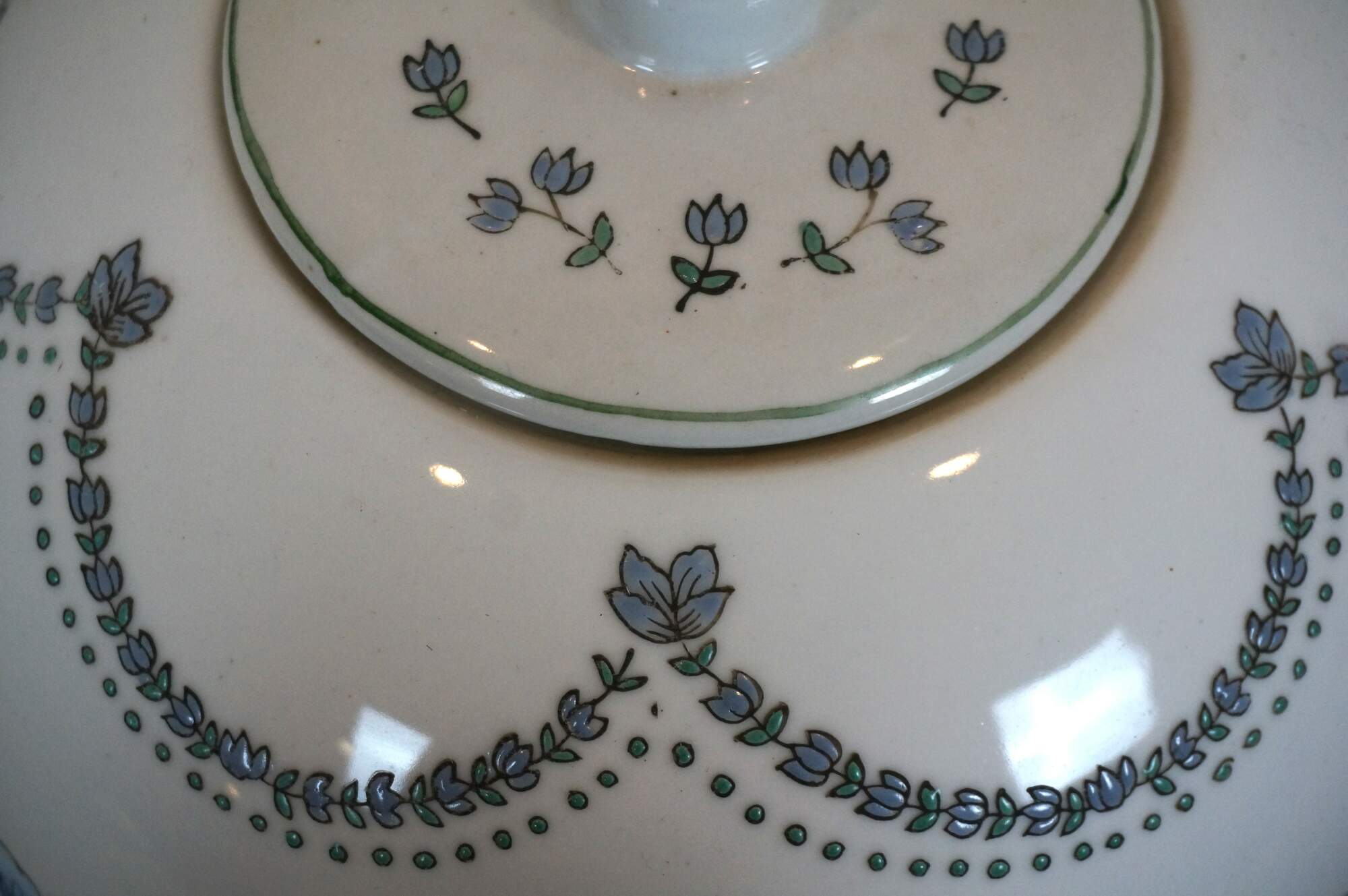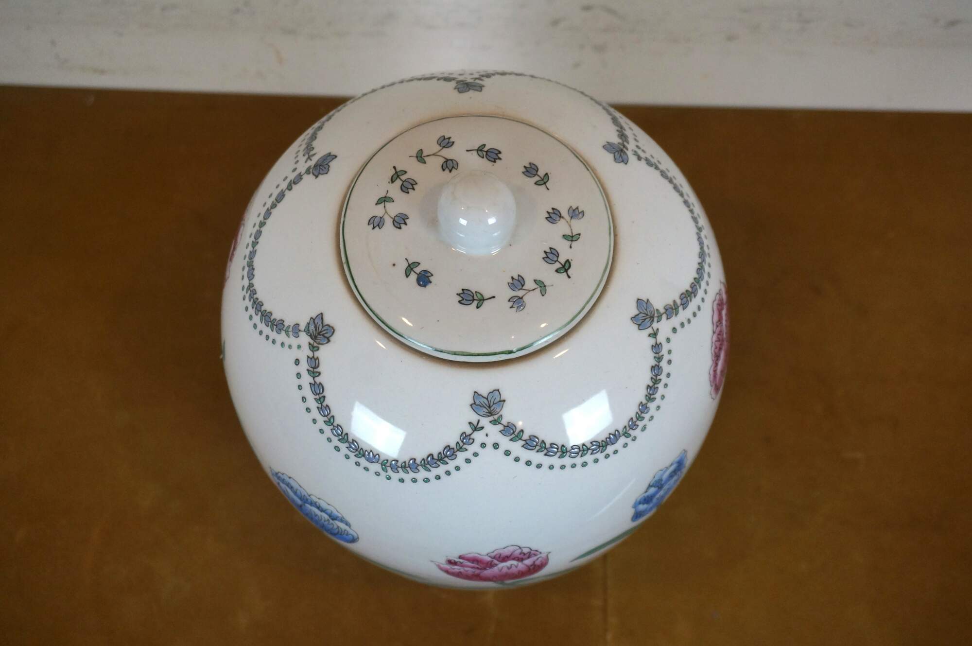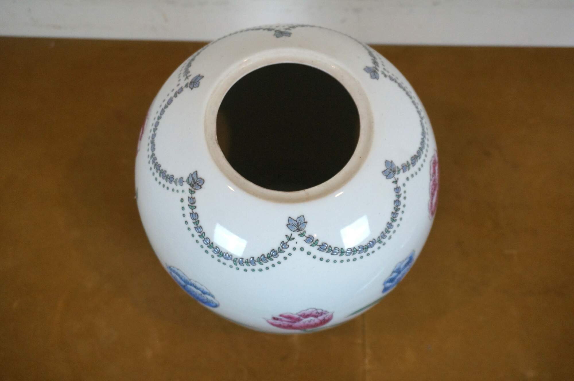 Vintage Chinese Ginger Jar. Features a white background with a green lattice-wrapped base, floral swags, and roses.