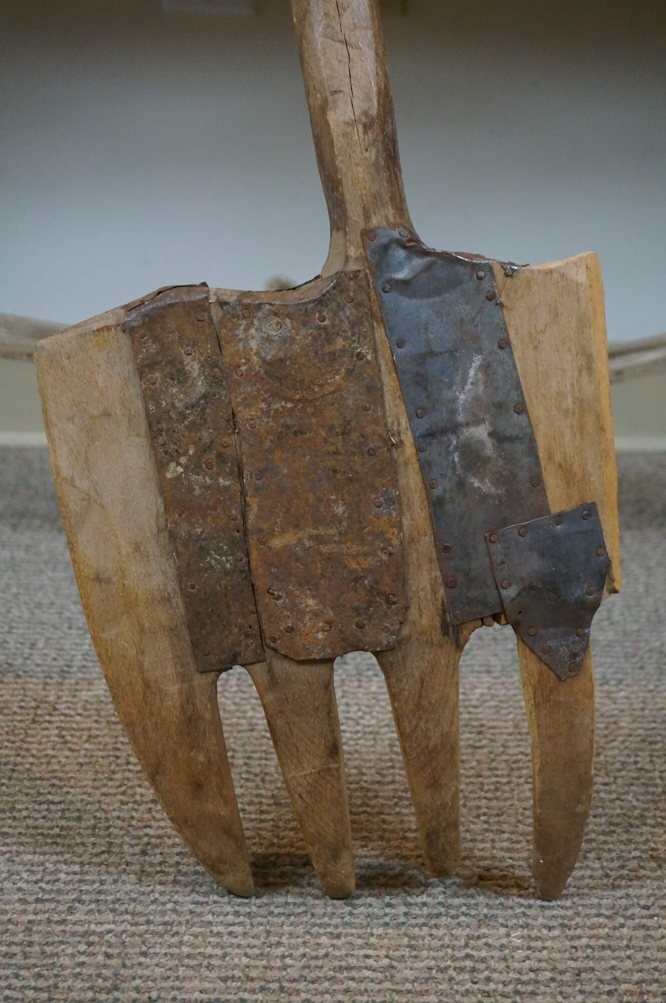 Set of 3 vintage handmade farm tools. Includes two hay forks and one coal shovel. Great for display