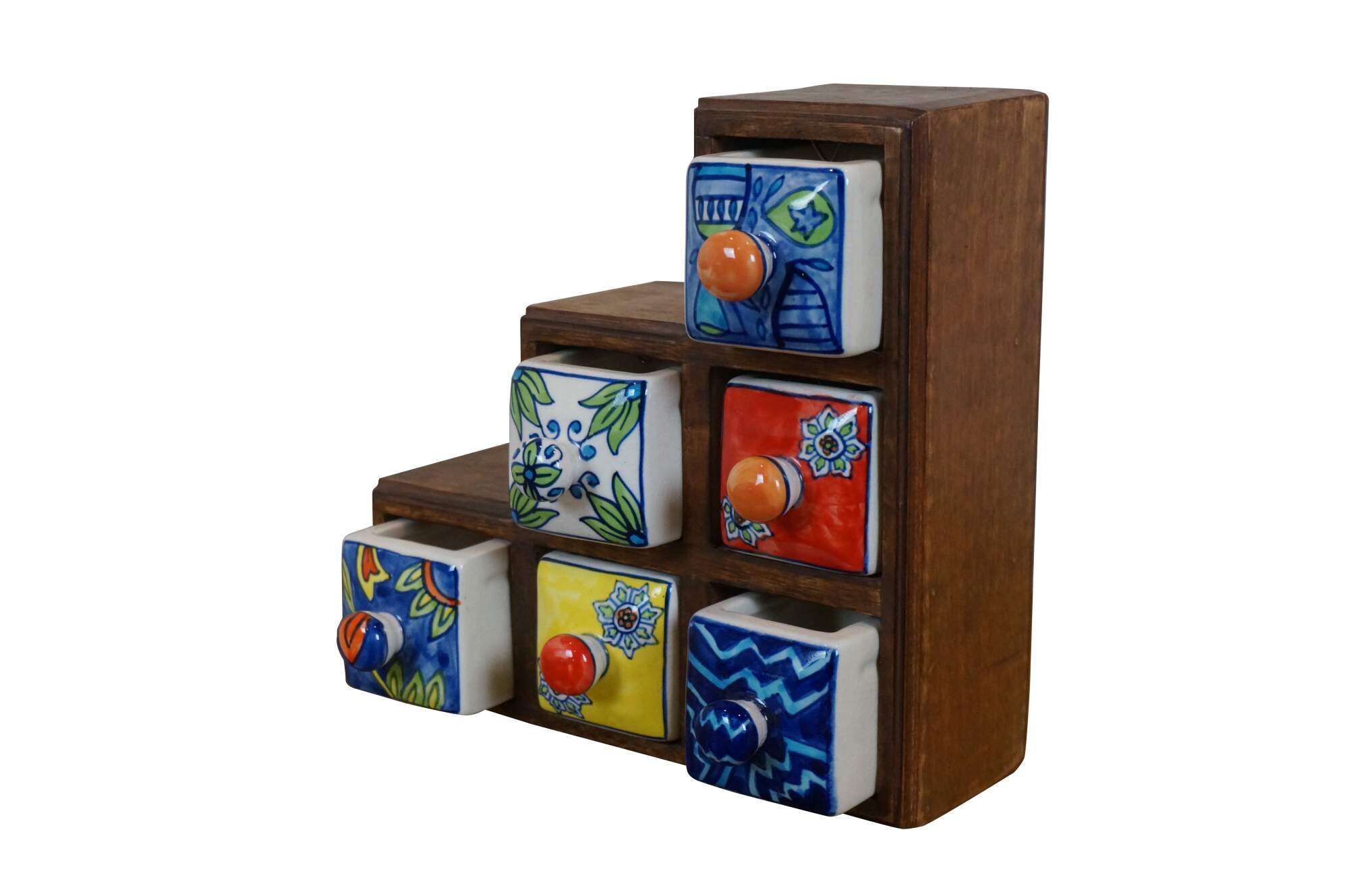 Mango wood Miniature stepped storage chest or spice rack. Features coloful ceramic art pottery drawers. Great for jewelry, trinkets or spices.
