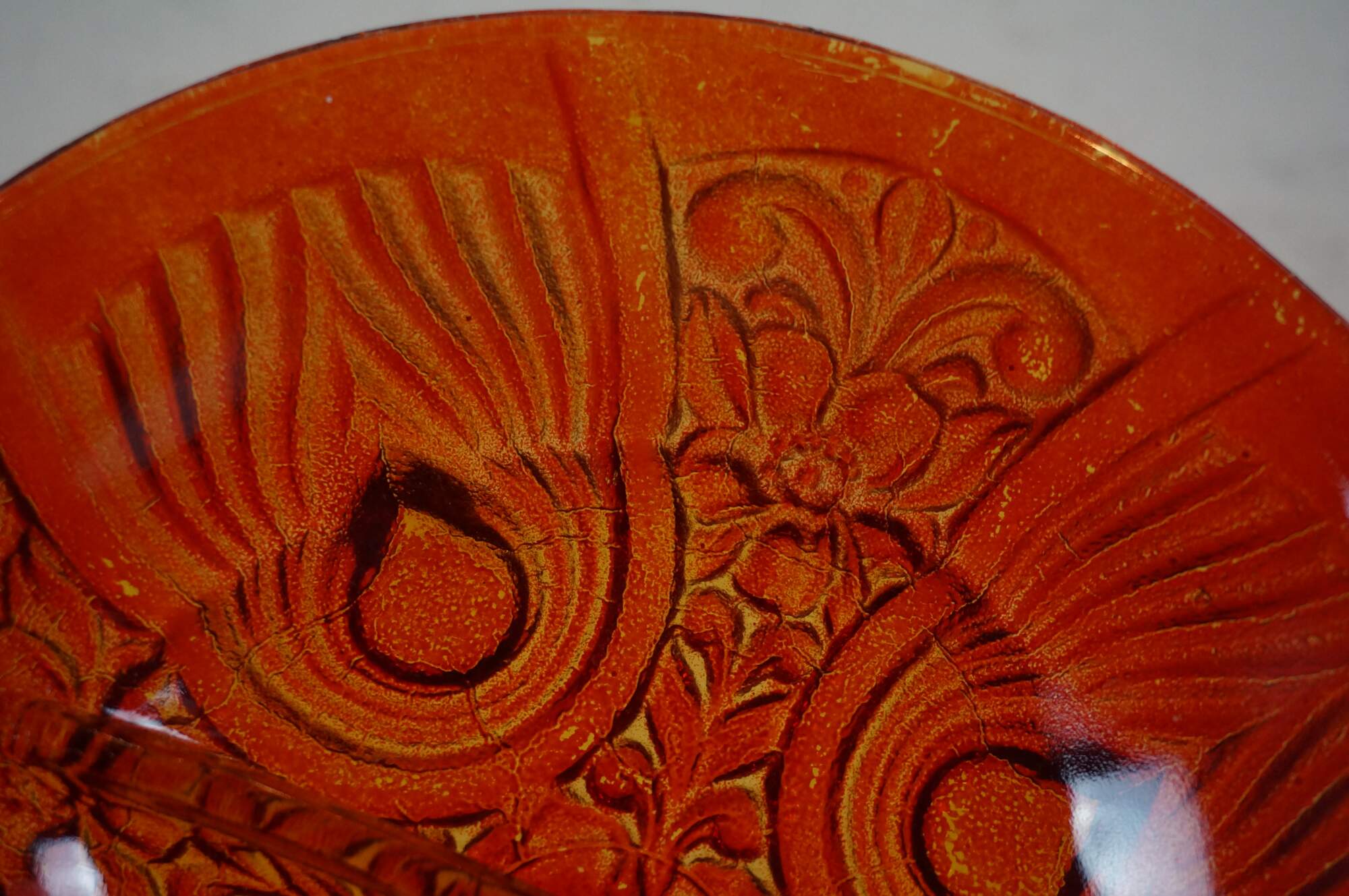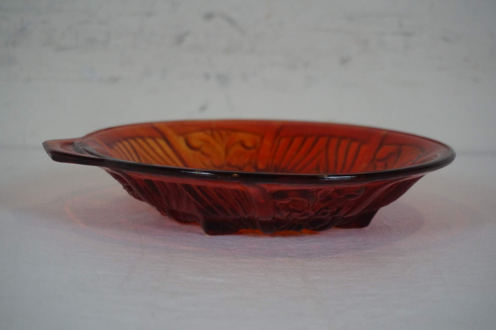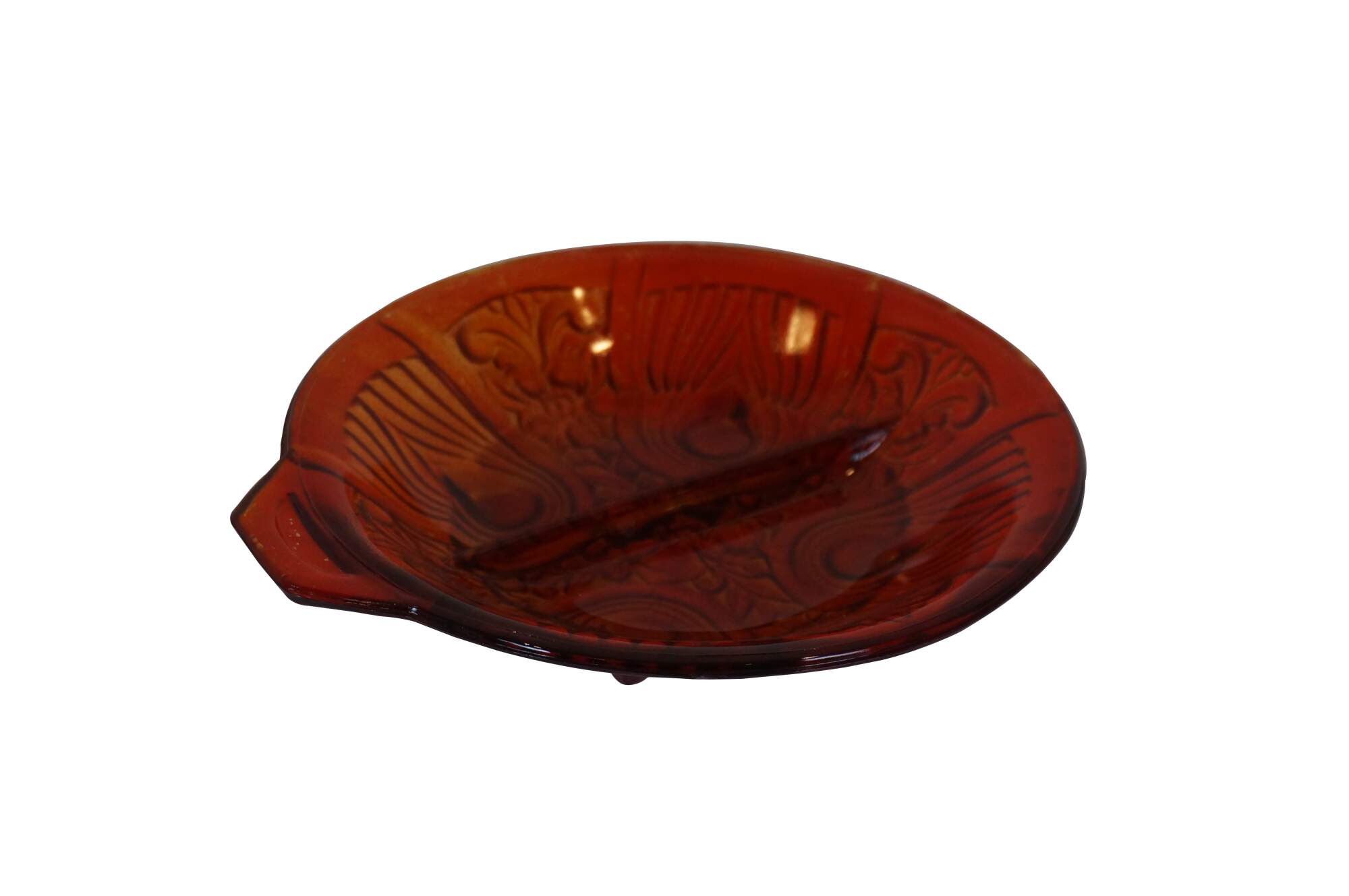 Vintage ruby red pressed glass divided dish featuring a fleur de lis and floral design.