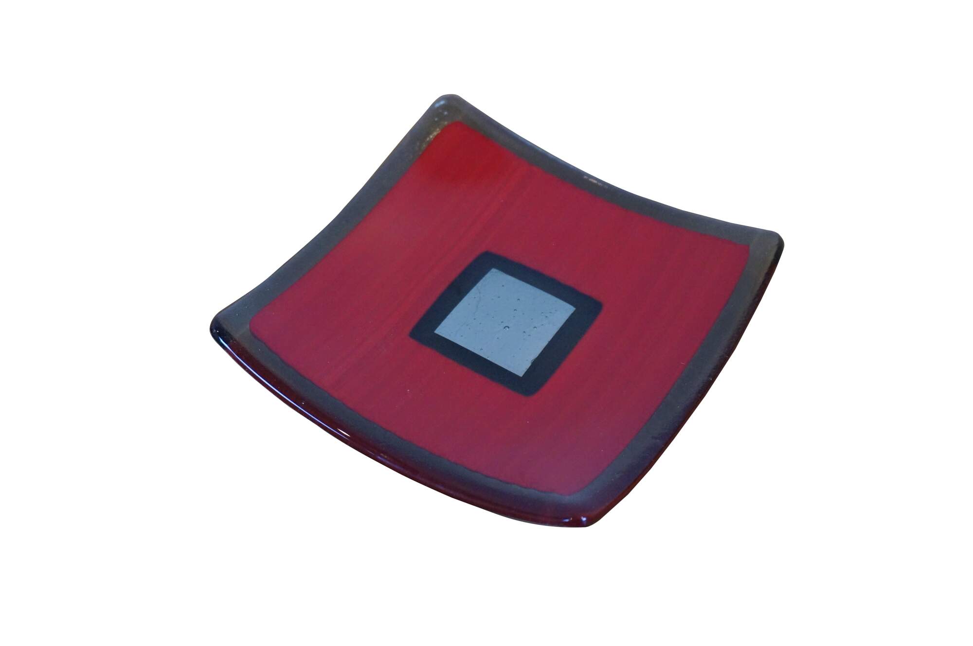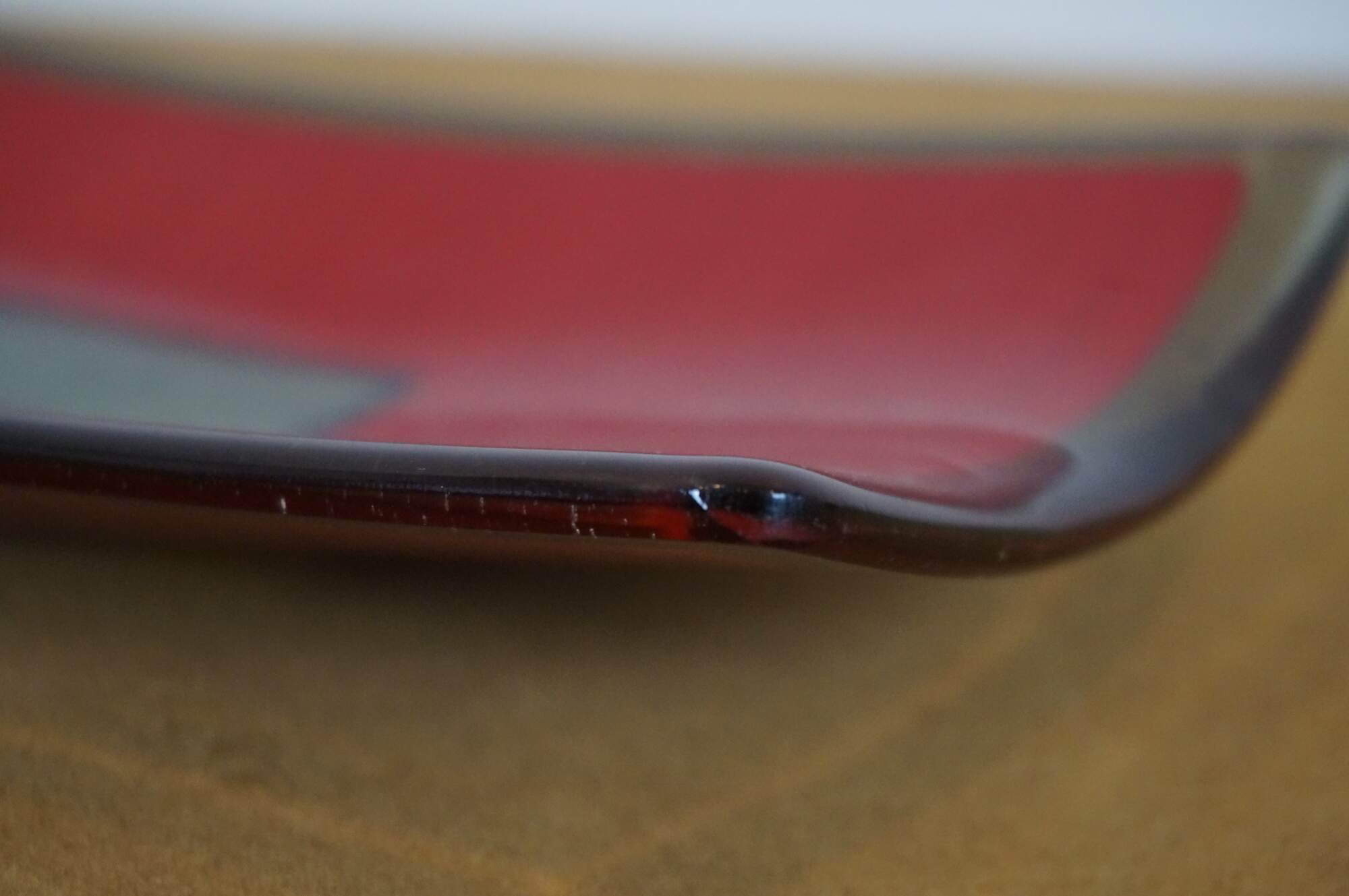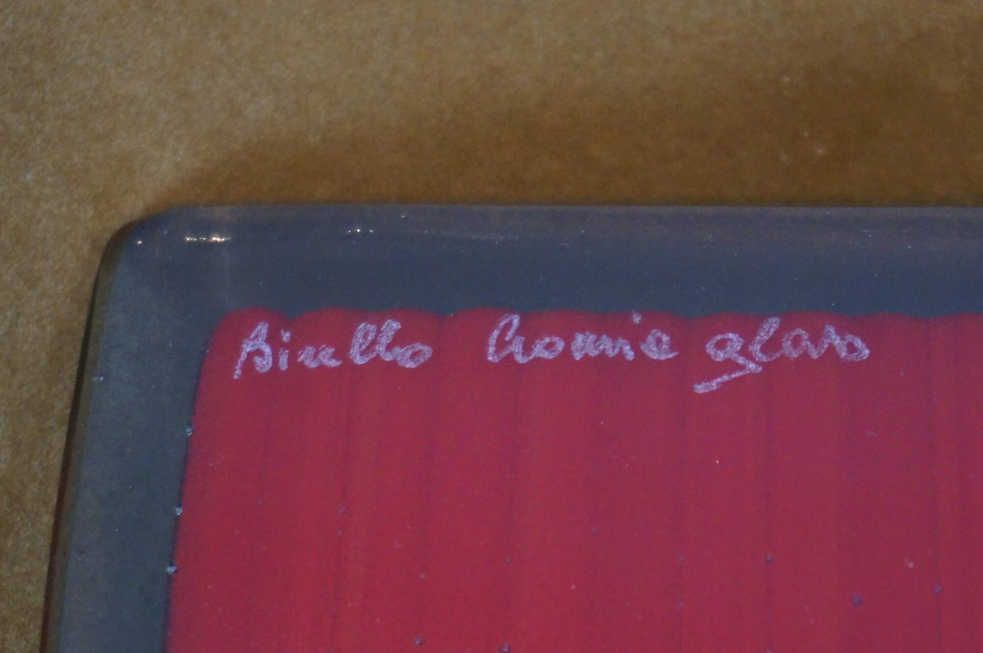 Two vintage Stefano Birello Venetian Murano Studio Art Glass tray / dish / plates featuring a modern red and silver Cromia glass design. Stefano is an artist born in Italy in 1966.