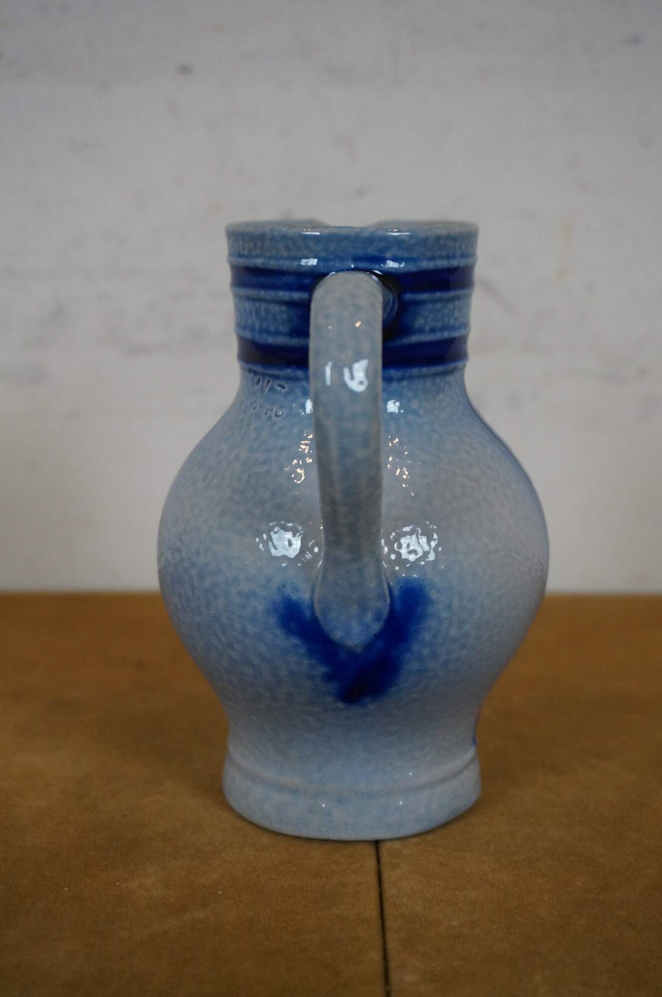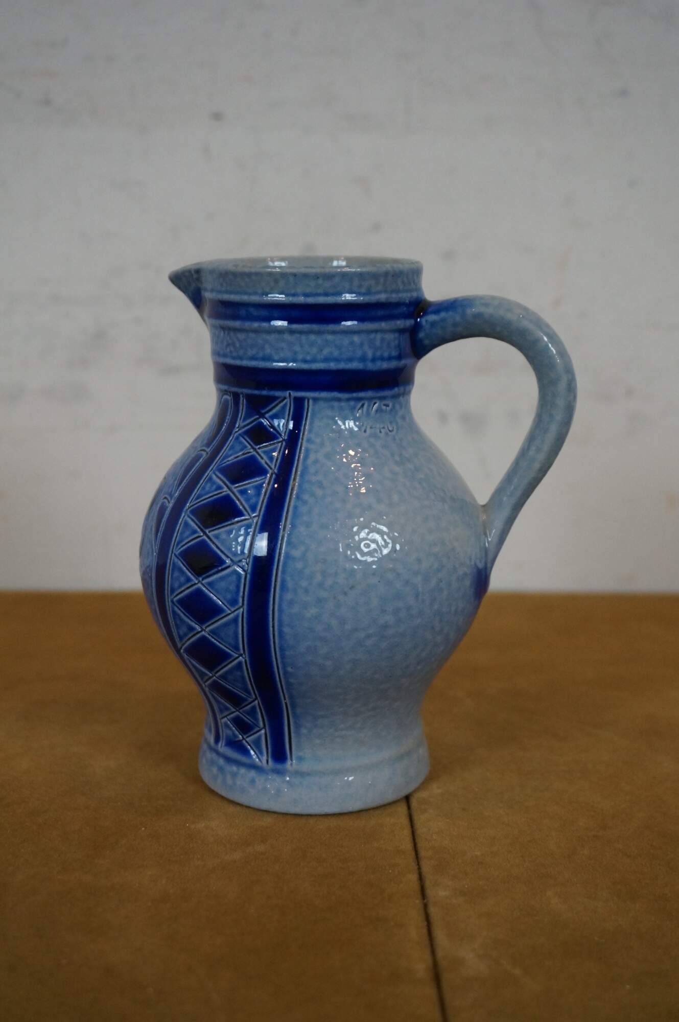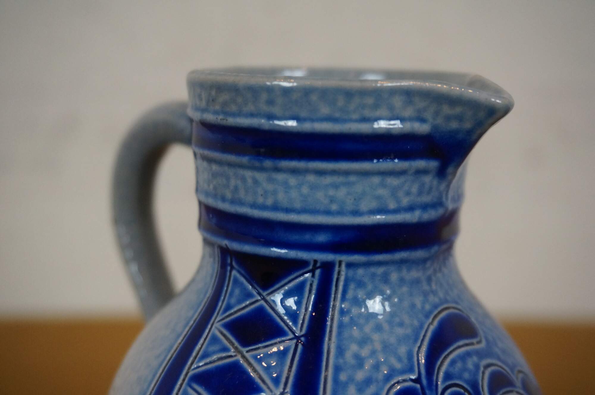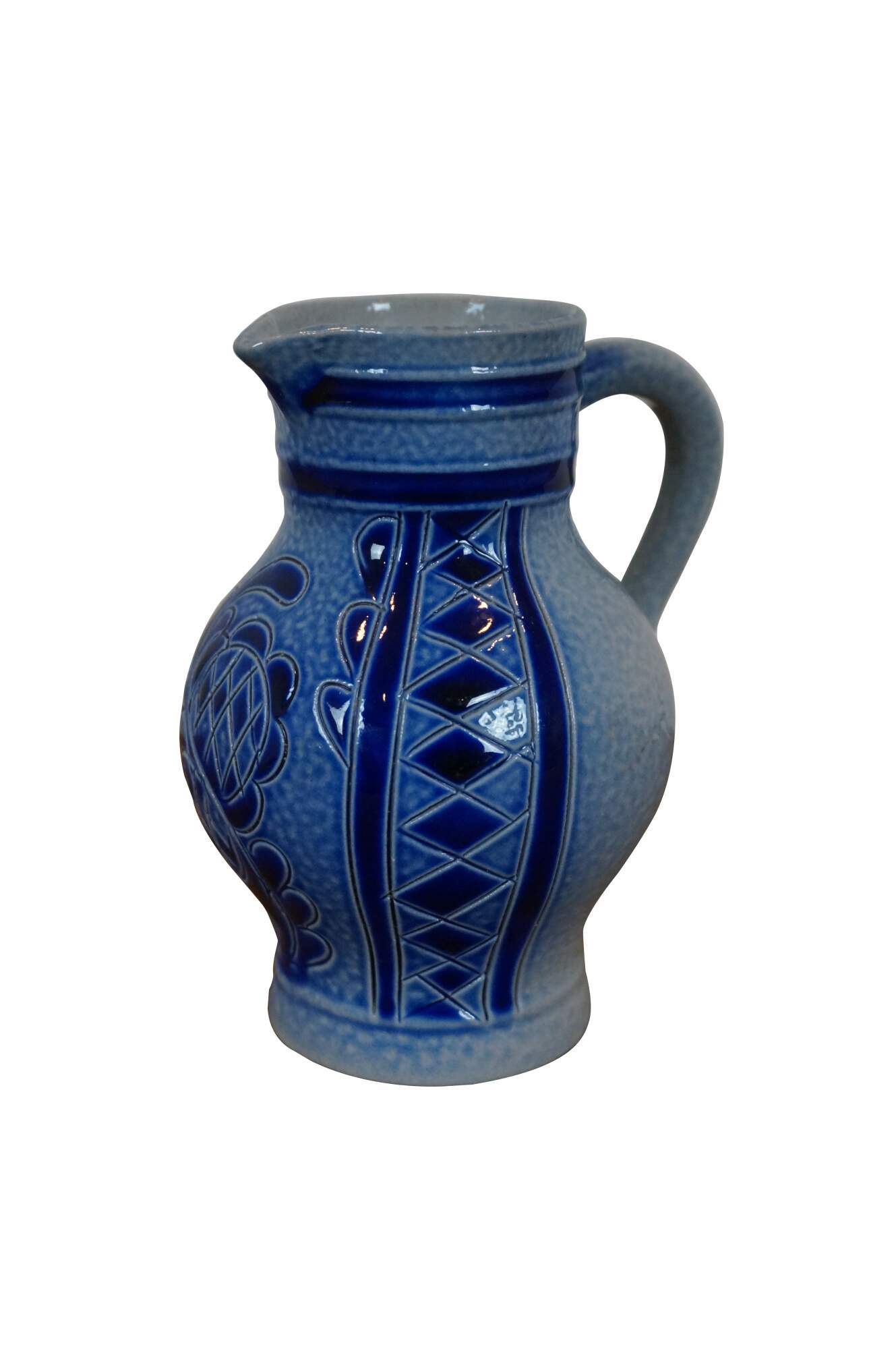 Gres D'Alsace Betschdorf France salt glaze pitcher featuring a cobalt blue floral and geometric Art Nouveau theme.