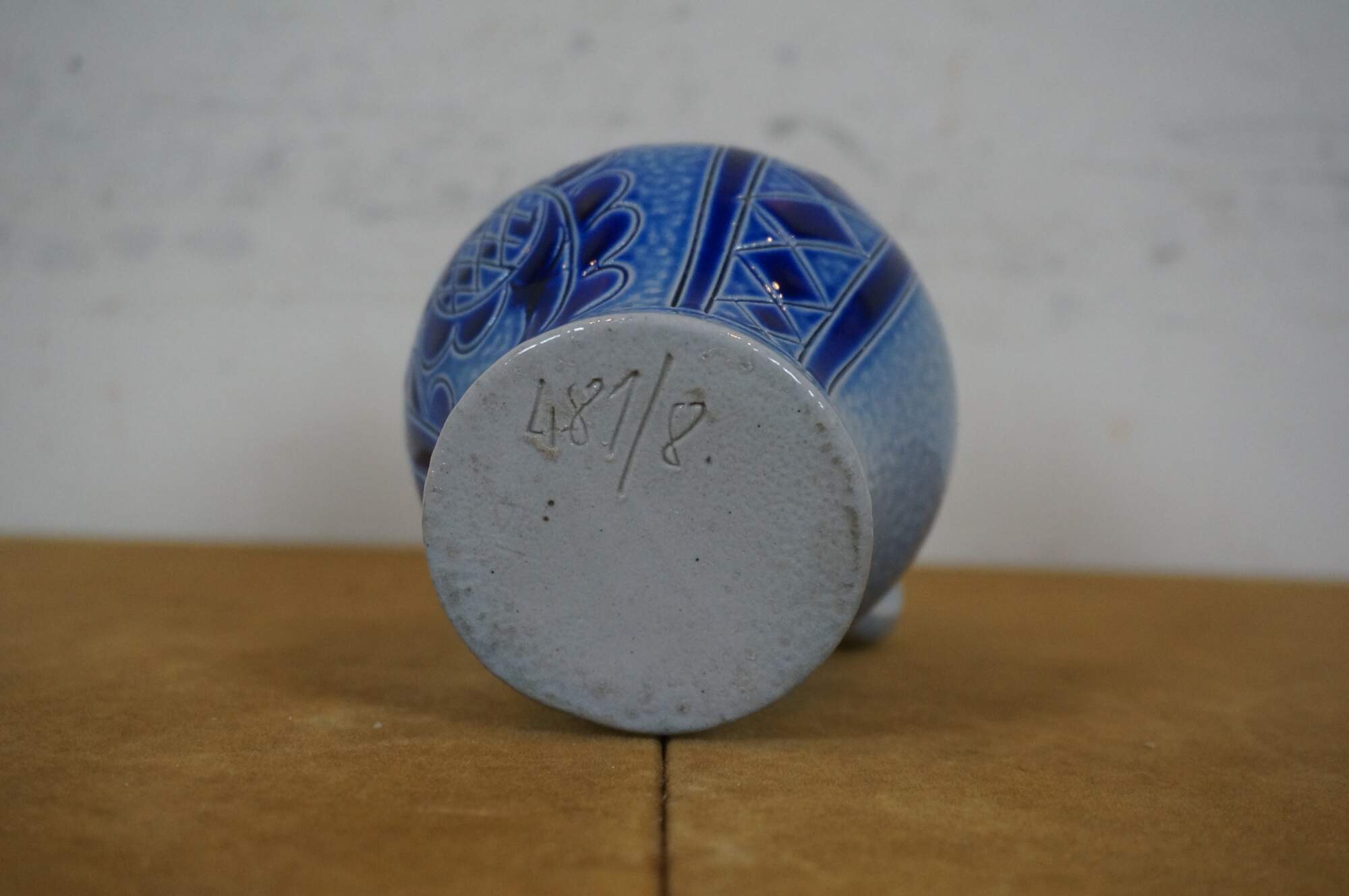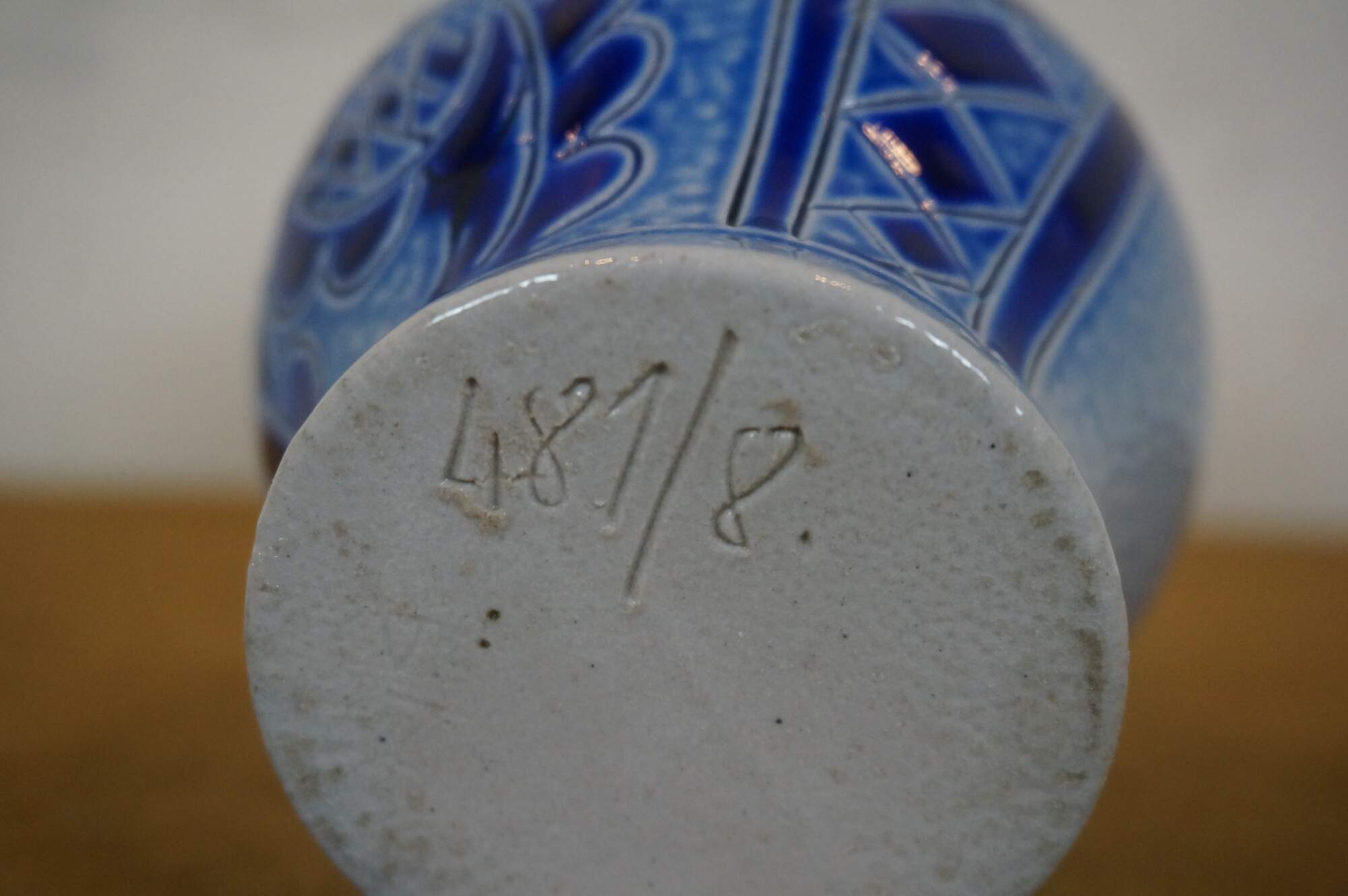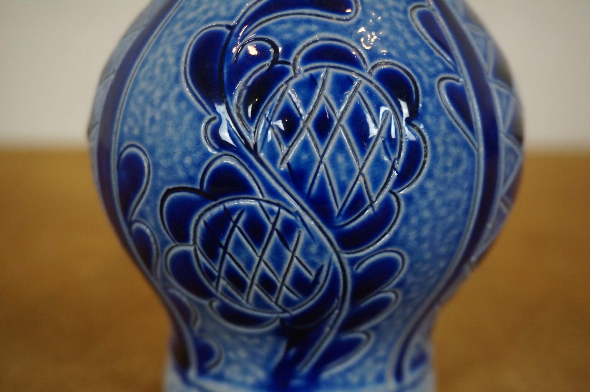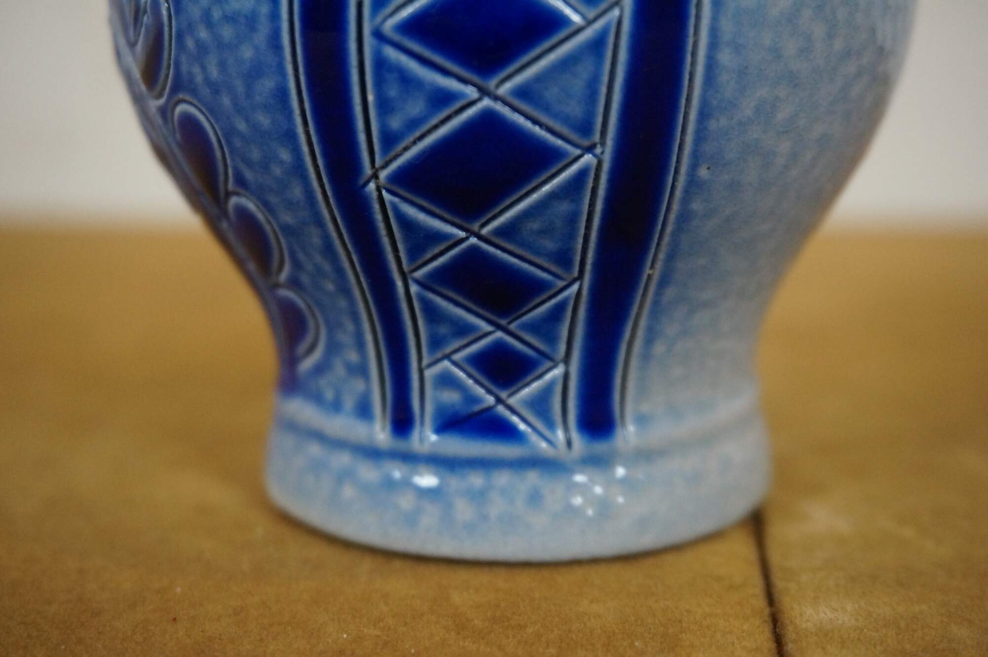 Gres D'Alsace Betschdorf France salt glaze pitcher featuring a cobalt blue floral and geometric Art Nouveau theme.