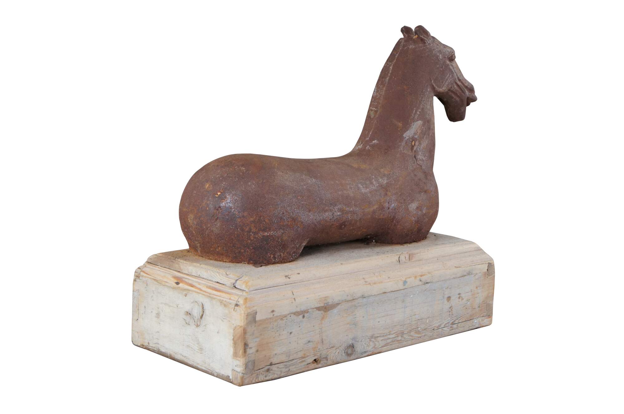 20th-century cast iron sculpture or hitching post of a Han (or Tang) Dynasty-style horse with muscular cheeks, open mouth, and no legs. Mounted on a hollow, dovetailed, unfinished wood base.