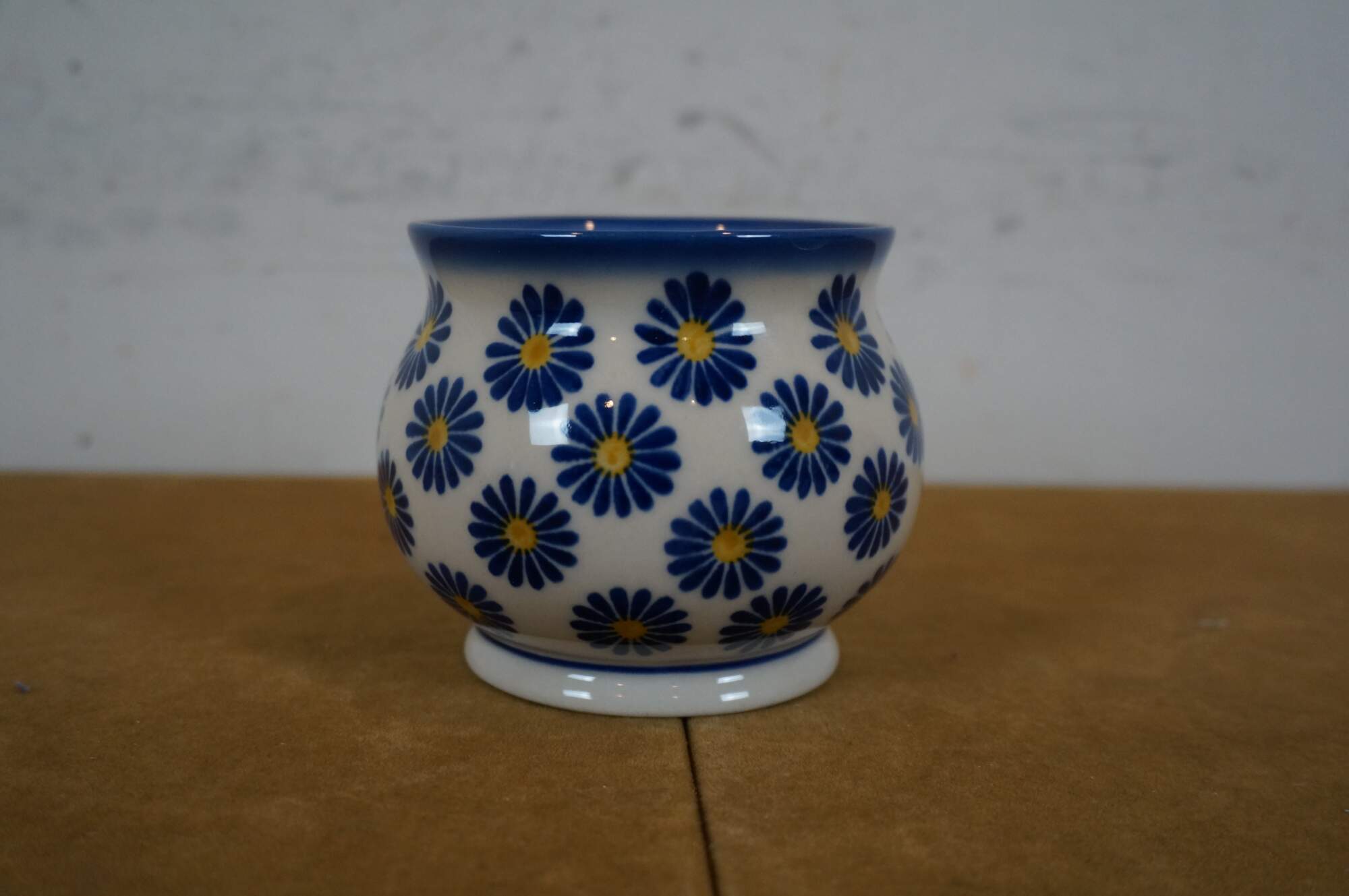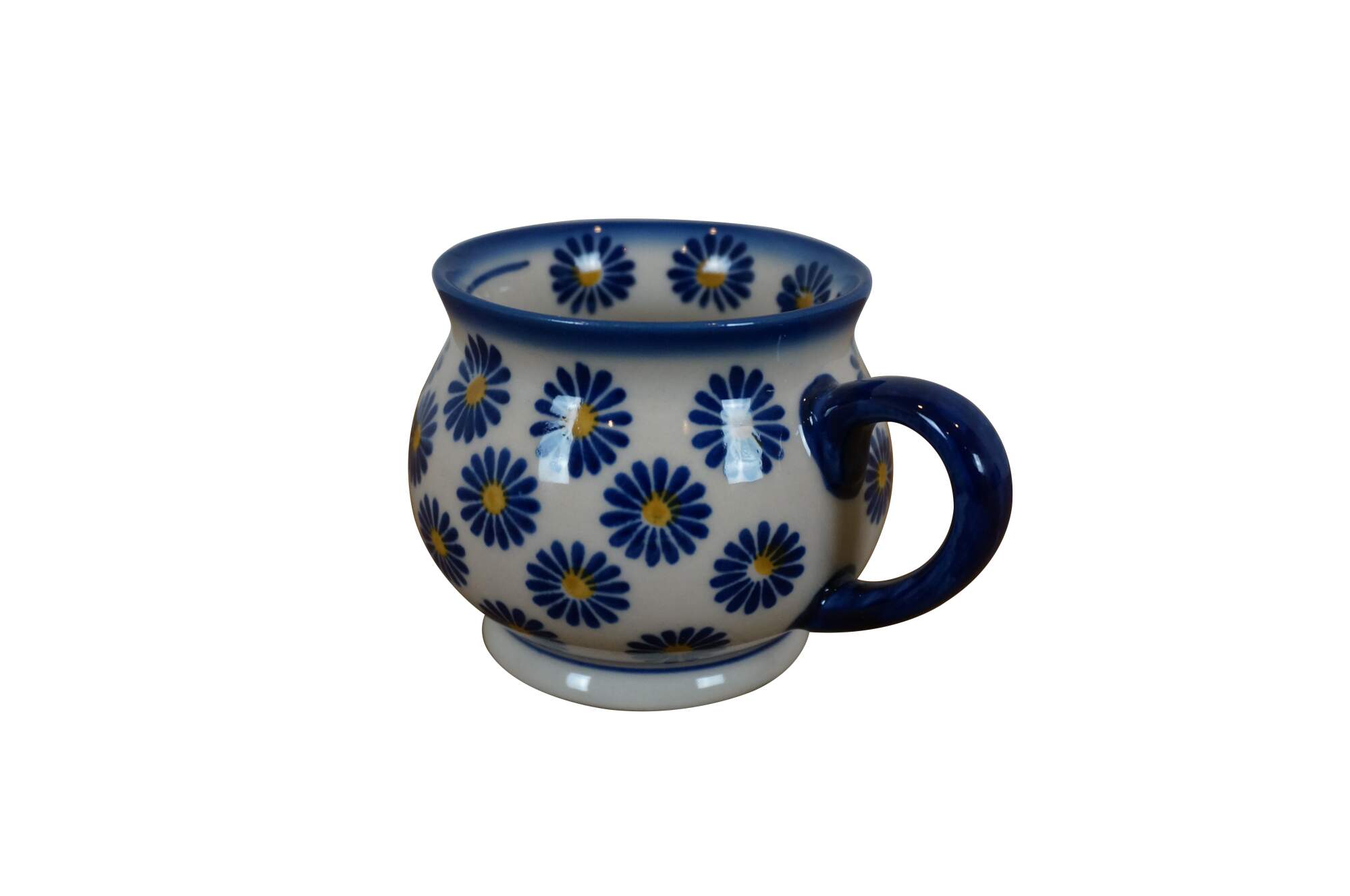 Vintage Andy Polish / Poland / Boleslawiec tea or coffee mug / cup featuring a blue daisy pattern Signed on base Patacka. Made in Poland, Unikat.