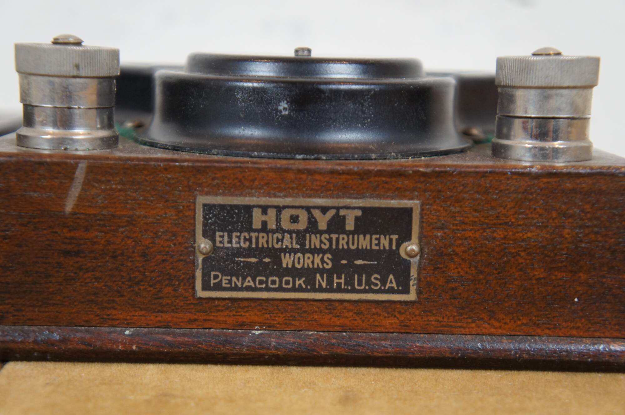 Circa 1910-1920s, Produced by the Hoyt Electrical Instrument Works of Penacook, NH. Adrian Hoyt started the company in 1904 in Penacook, NH. Douglass Hoyt is the grandson of the founder. The actual address is still Hoyt Electrical Instrument Works, Inc., 19 Linden St., P.O. Box 6183, Penacook, NH 03303. In the 1920s, Burton-Rogers Company in Boston was the sales department for Hoyt Electrical Instruments.