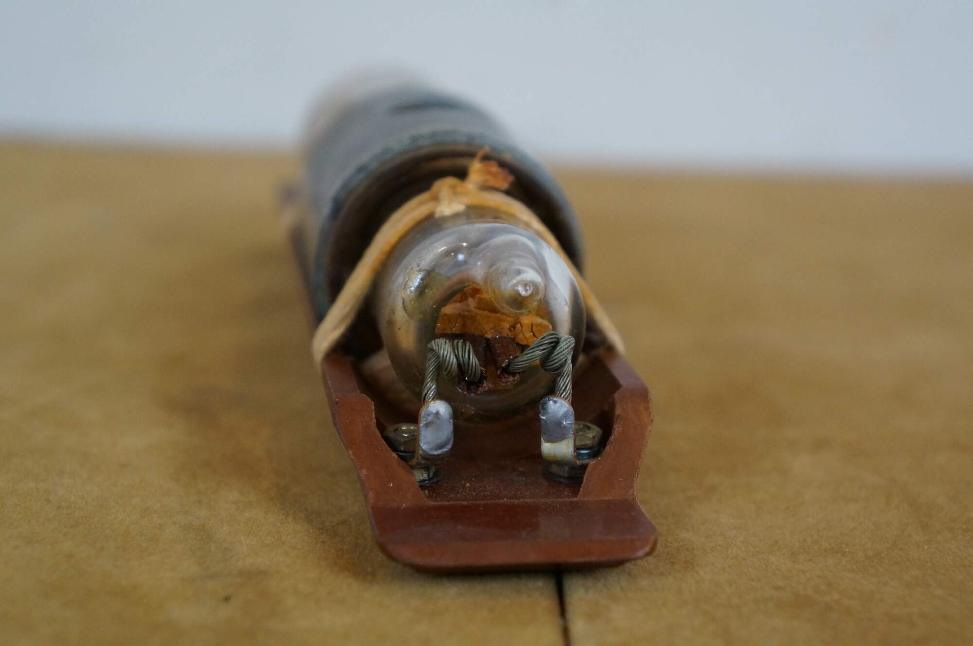Vintage 20th century glass tube vacuum relay, lashed with cord to a wall hanging wooden base. Marked CYP 115199.