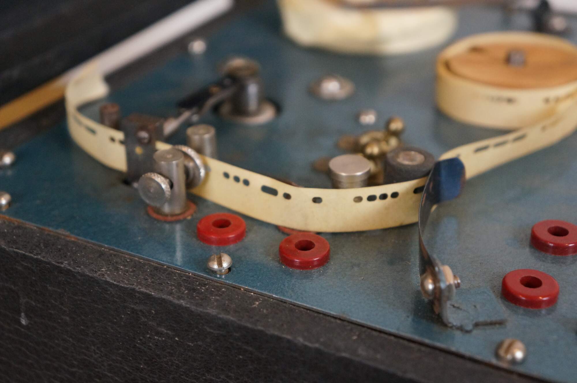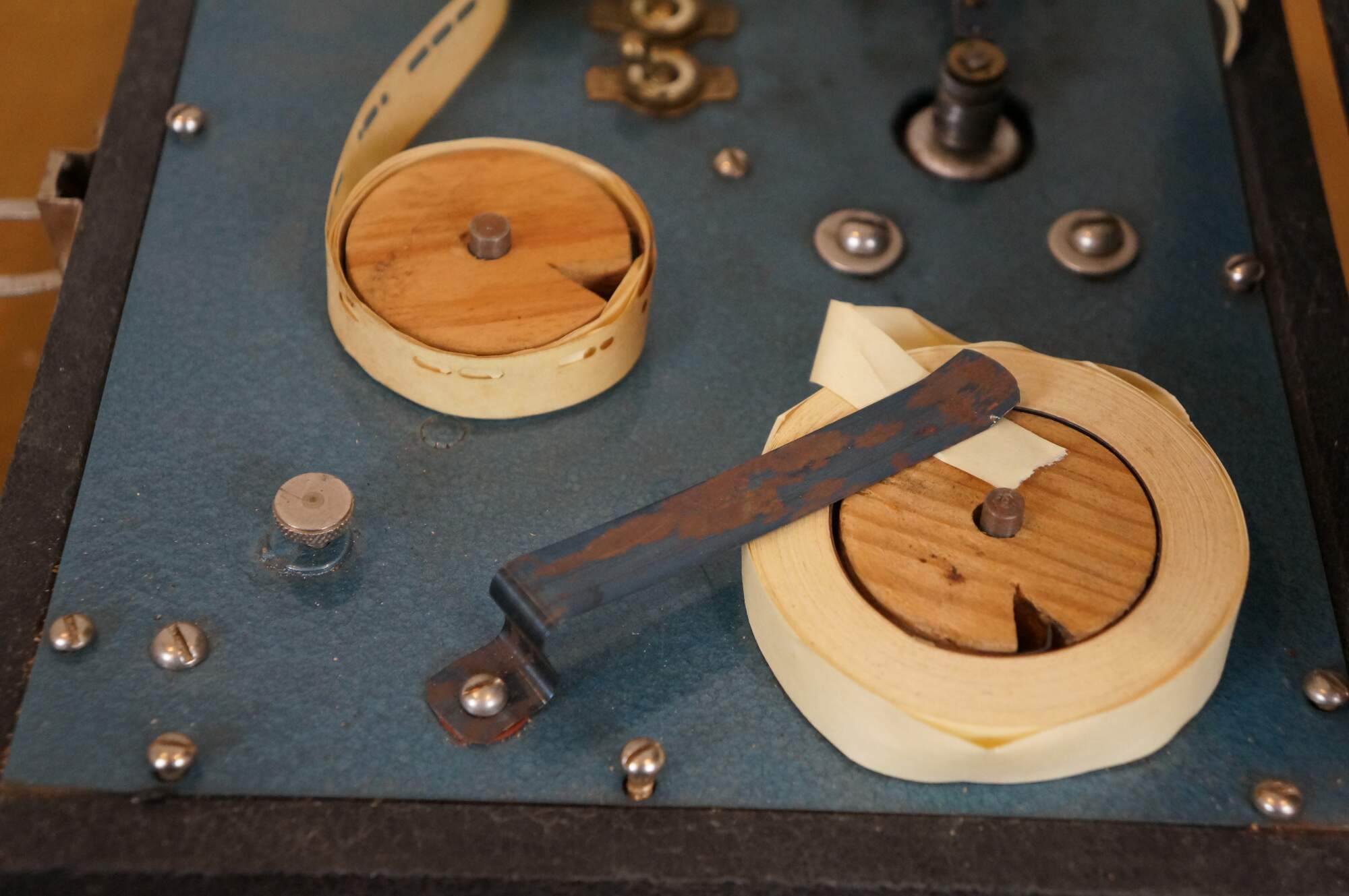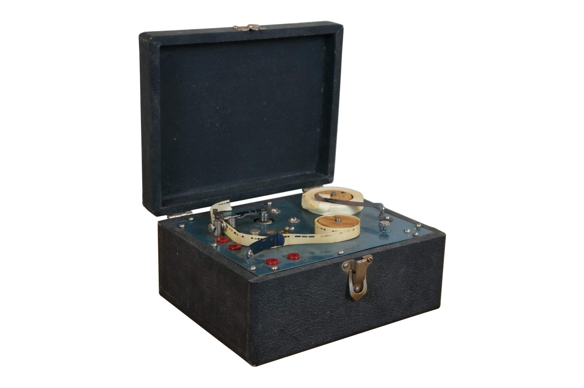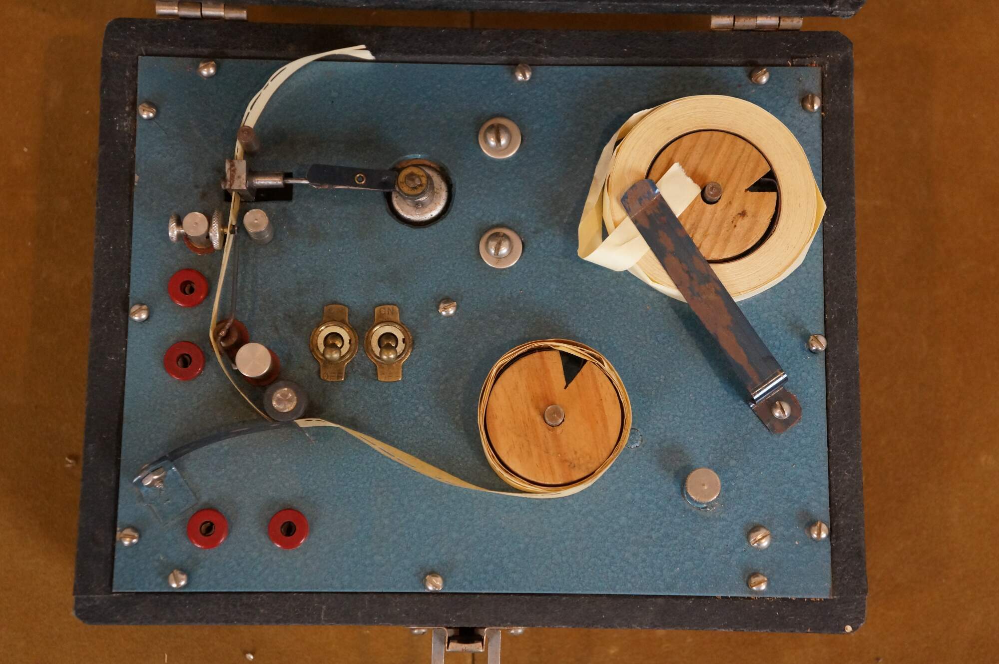 "The Instructograph was a paper tape-based machine used for the study of Morse code. The paper tape mechanism consisted of two reels which passed a paper tape across a reading device that actuated a set of contacts which changed state dependent on the presence or absence of hole punches in the tape. The contacts could operate an audio oscillator for the study of International Morse Code (used by radio), or a sounder for the study of American Morse Code (used by railroads), or a light bulb (Aldis Lamp - used by Navy ship to ship or by Heliograph). The Instructograph was in production from about 1920 through 1983. The first US patent, No. 1,725,145, was granted to Otto Bernard Kirkpatrick, of Chicago, IL, on August 20, 1929. Most of them would be wound by hand or be plugged into a wall outlet. Most plugin outlet based instructographs would have a set of knobs that can control the speed and volume. The latest version of the Instructograph was the model 500 which included a built in solid state oscillator. This model was available to be purchased as new through at least 1986." (Source: Wikipedia)
