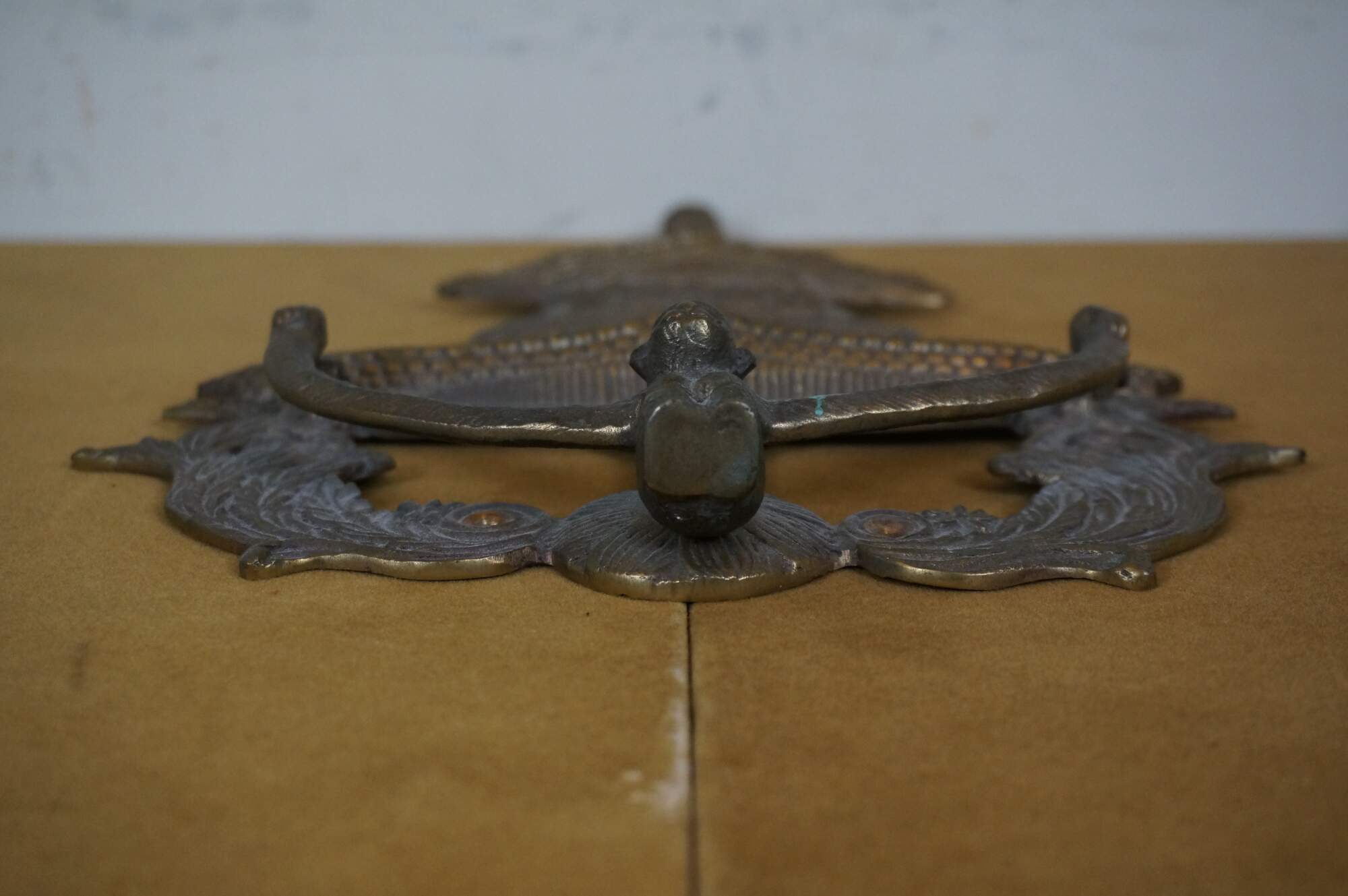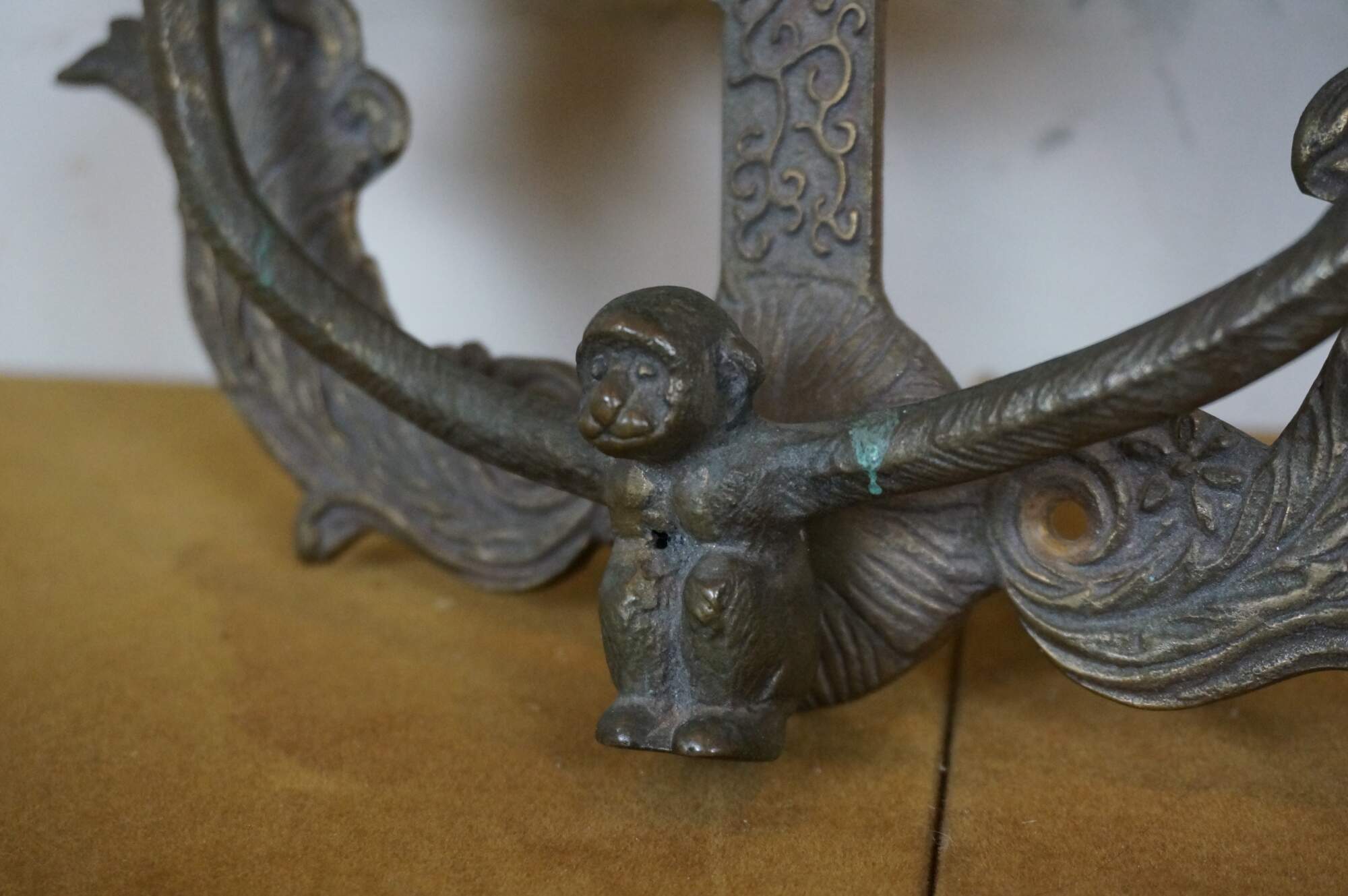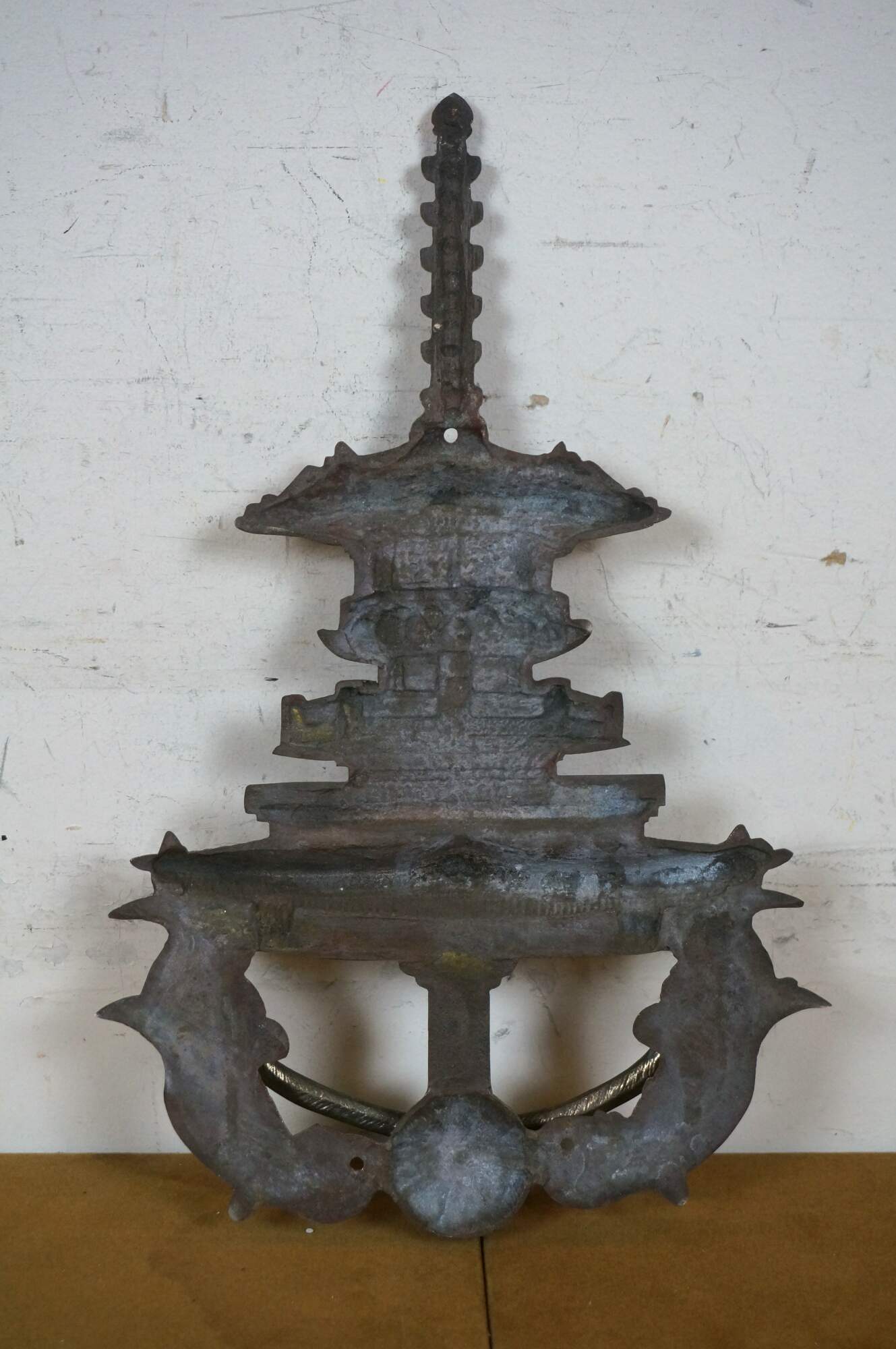 Circa mid 20th century large brass door knocker in the shape of a tall Chinese pgoda and a monkey with long arms.