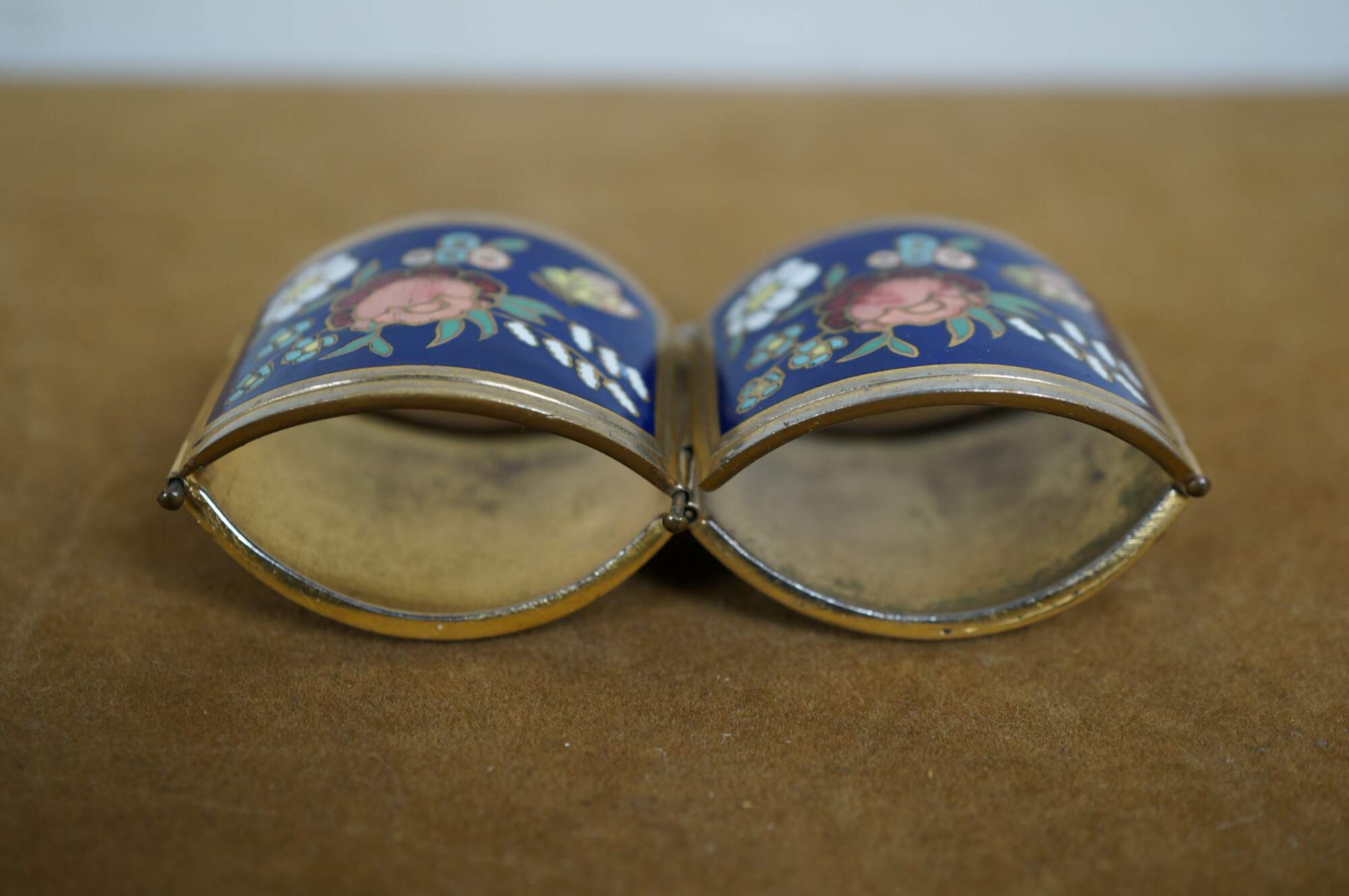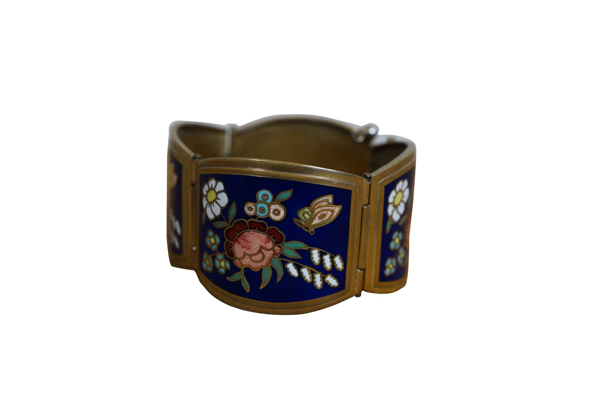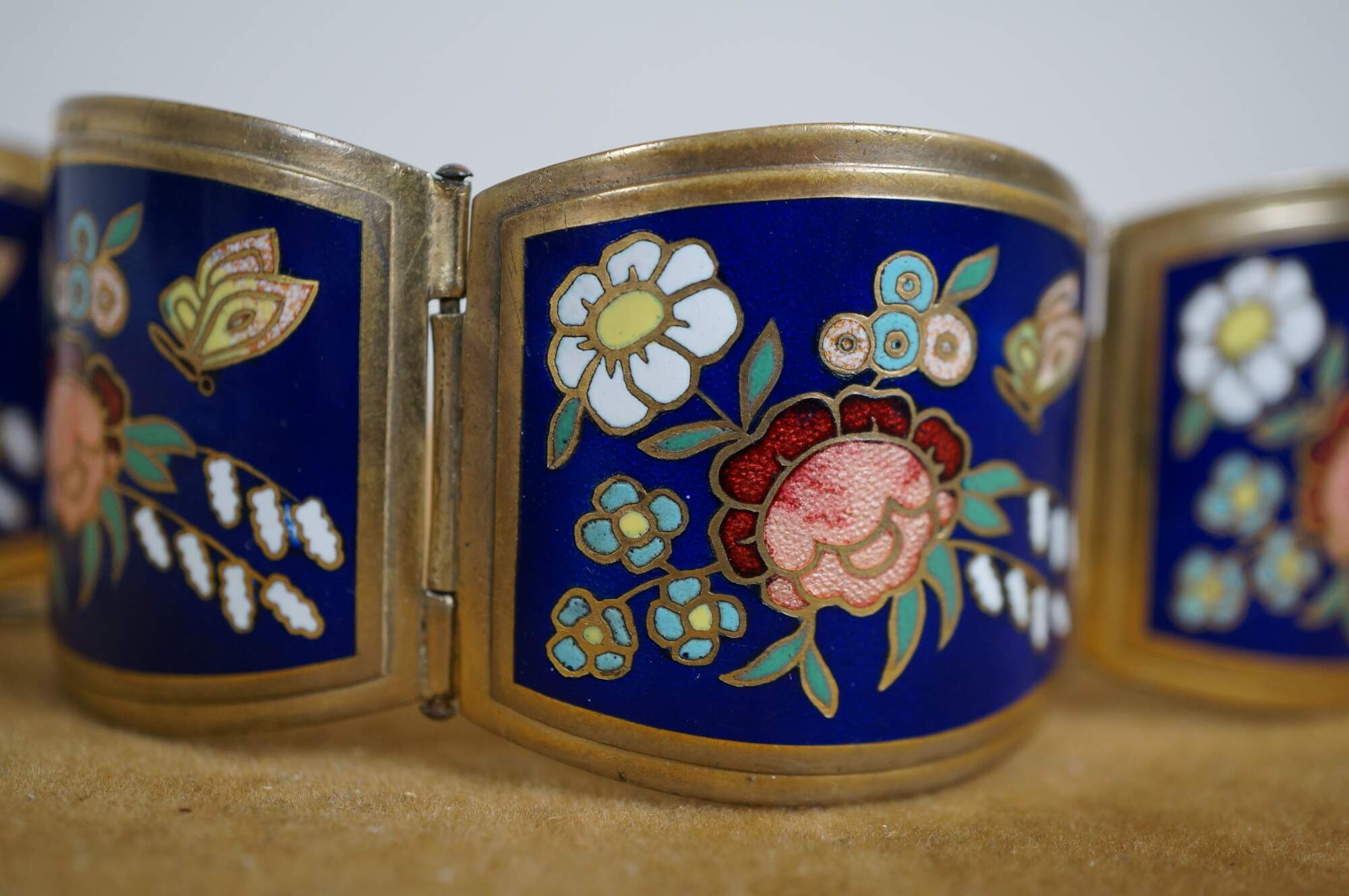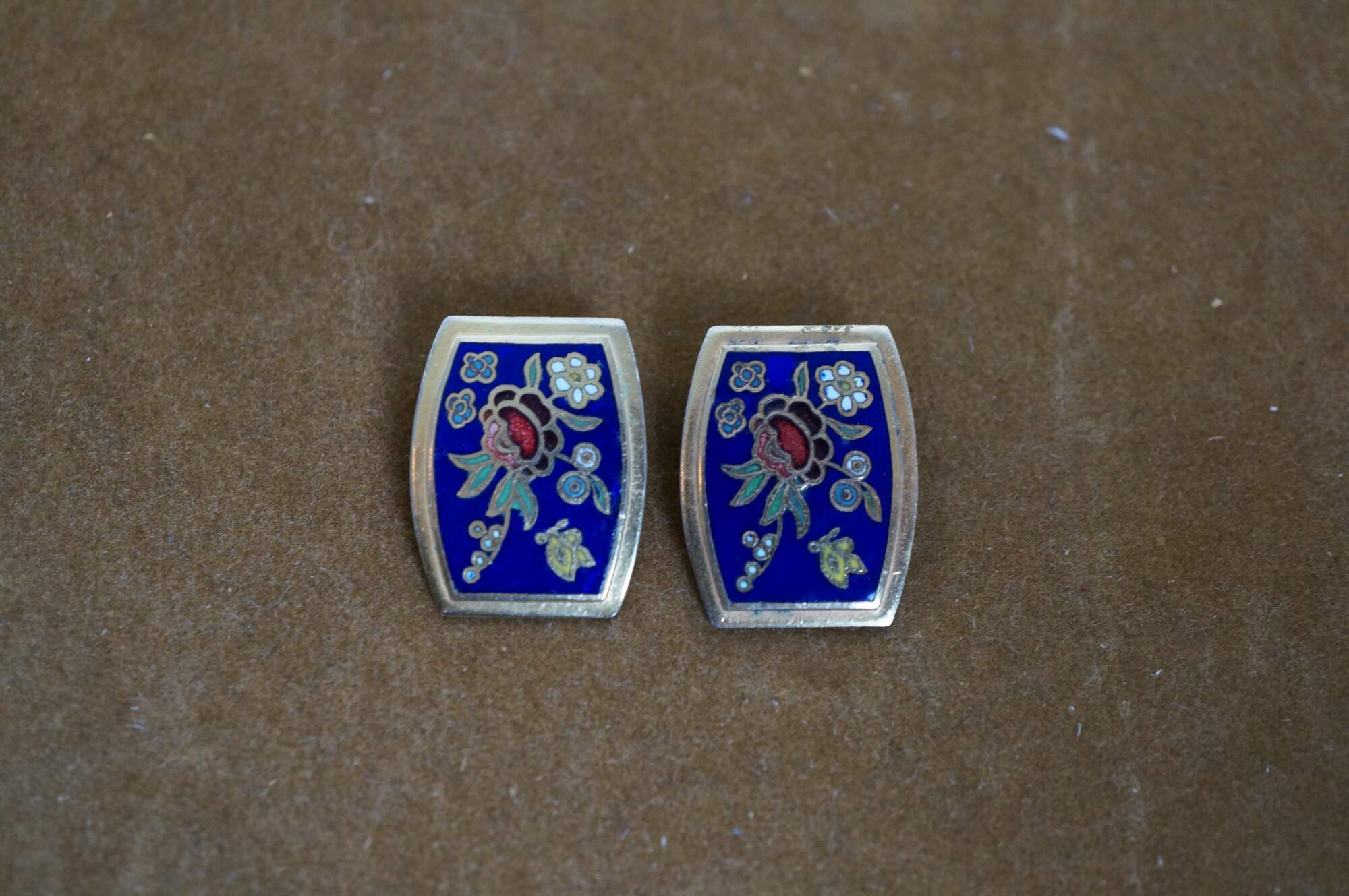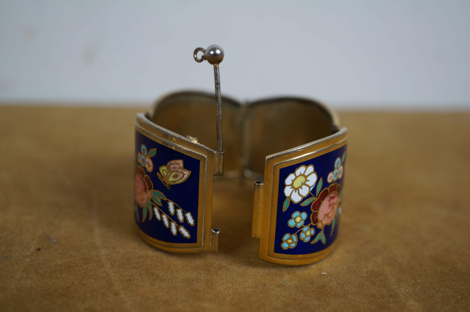 Vintage 20th century set of cloisonne enamel on brass jewelry including a bangle bracelet, pin / brooch, and pair of clip on earrings. Design features a rose and other assorted flowers with a yellow butterfly on a blue background.