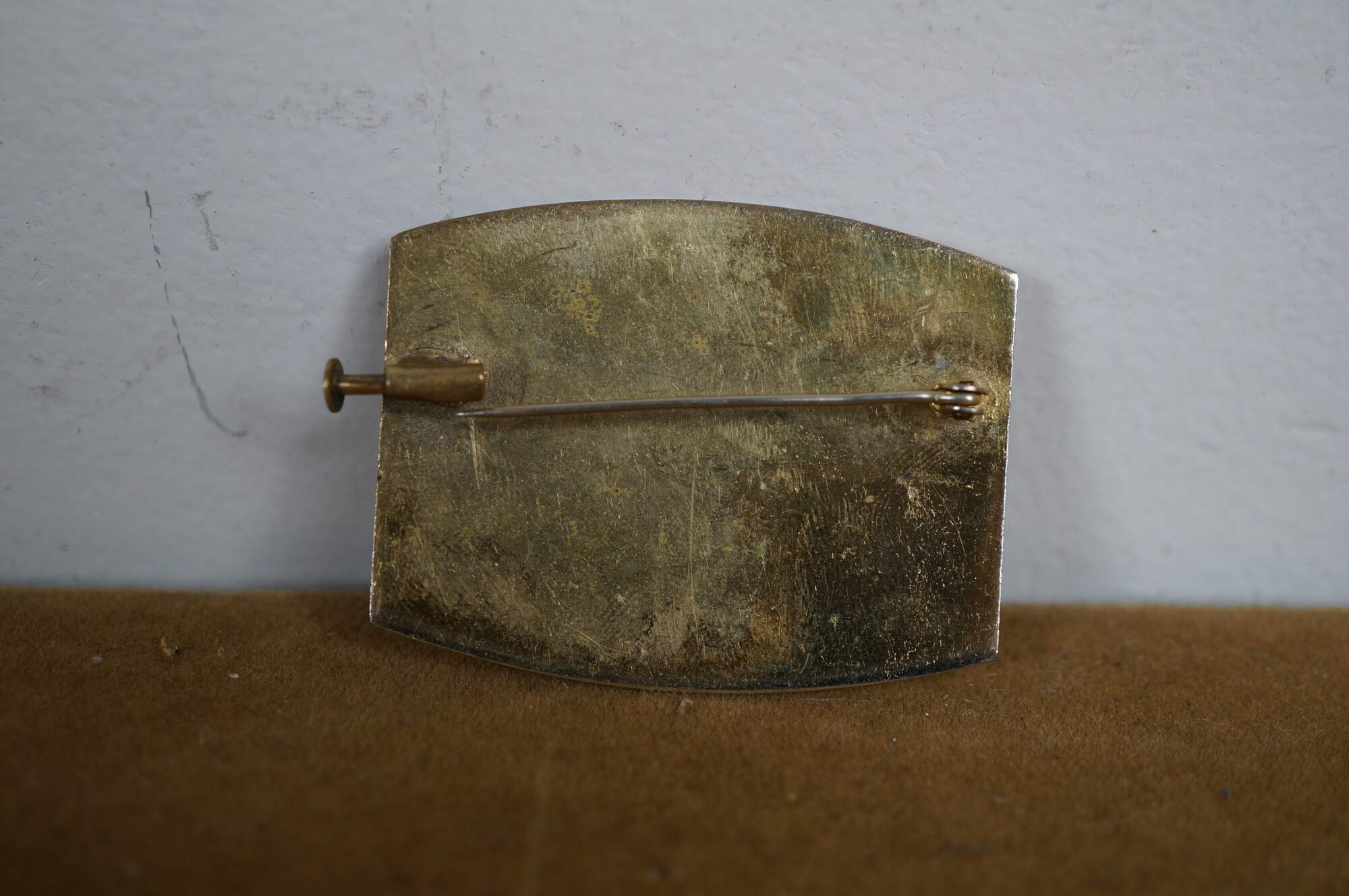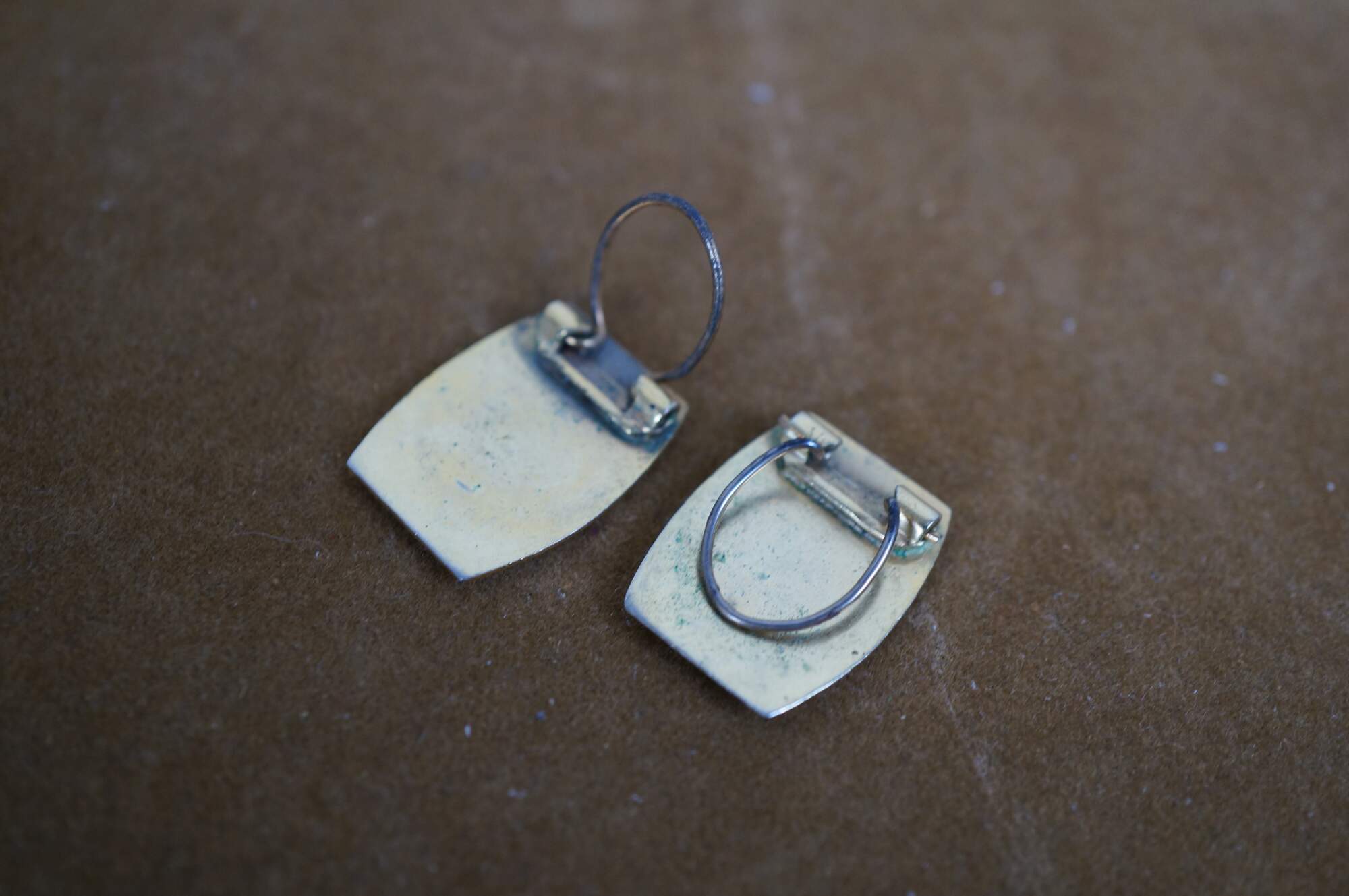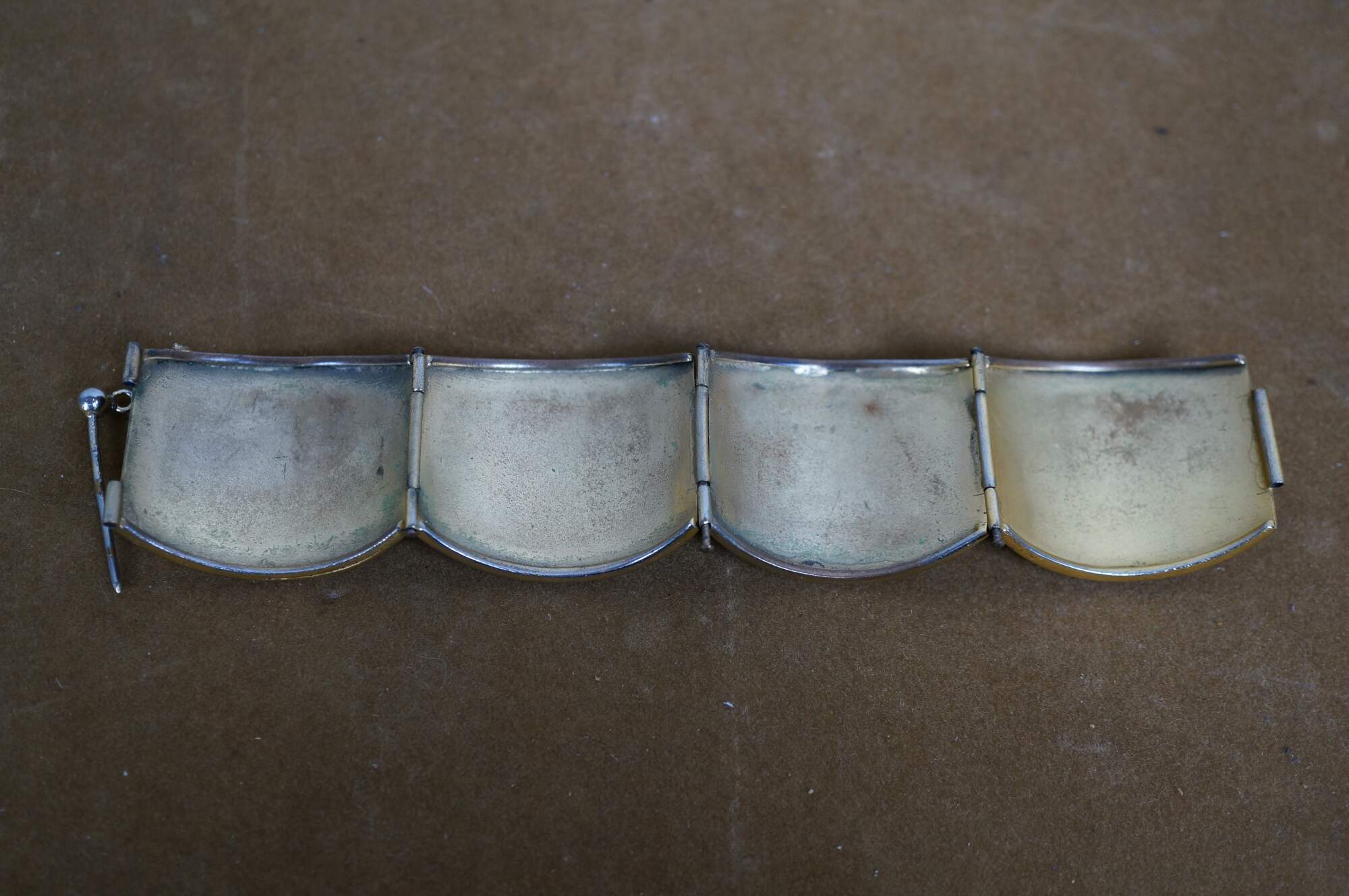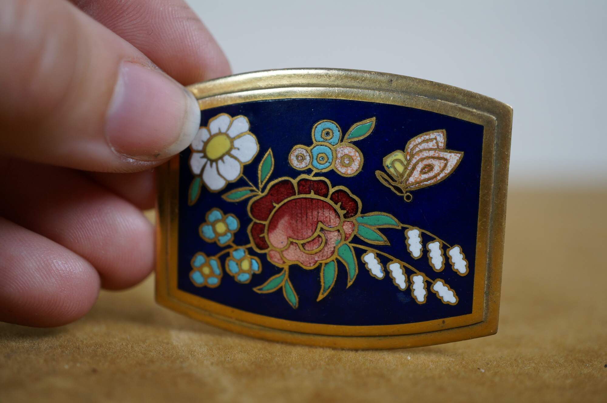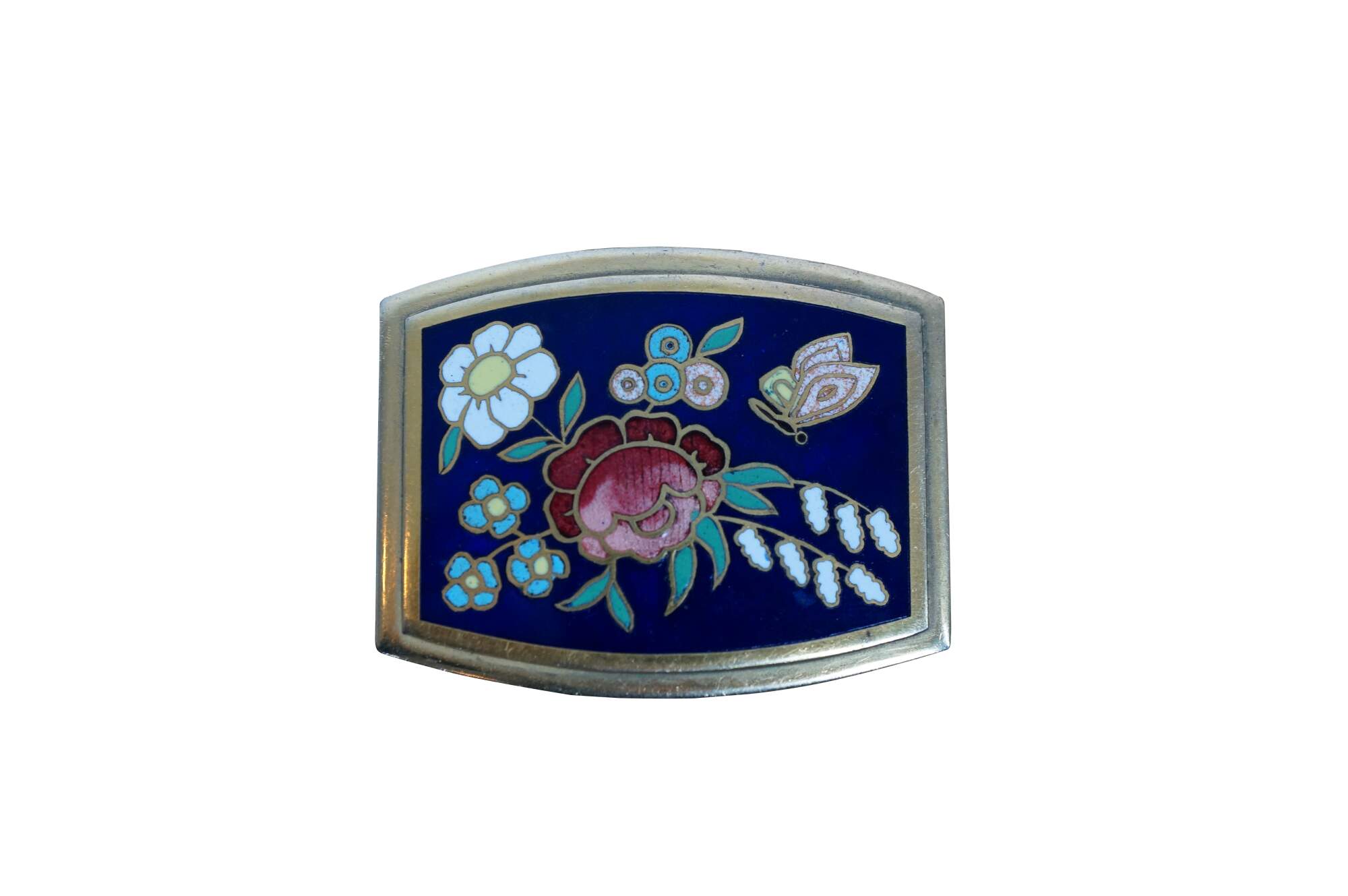 Vintage 20th century set of cloisonne enamel on brass jewelry including a bangle bracelet, pin / brooch, and pair of clip on earrings. Design features a rose and other assorted flowers with a yellow butterfly on a blue background.