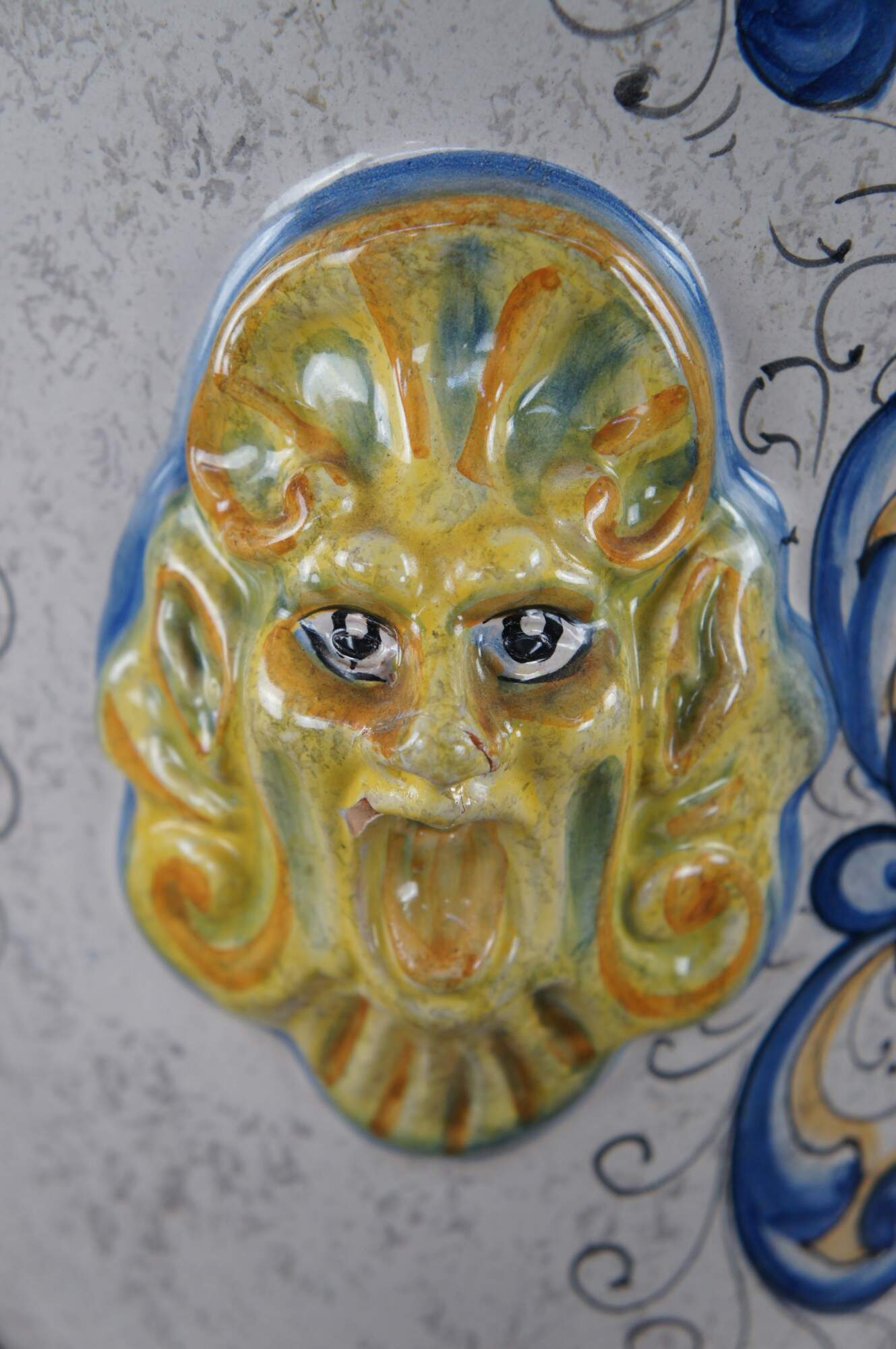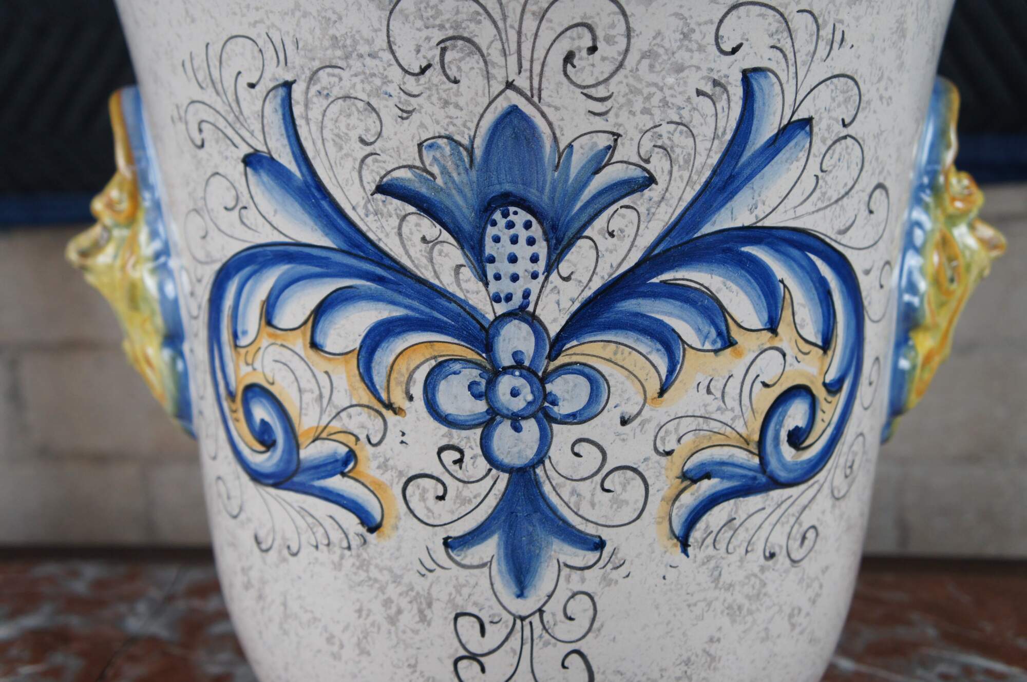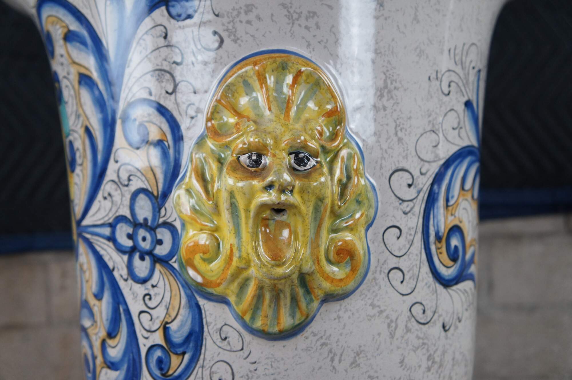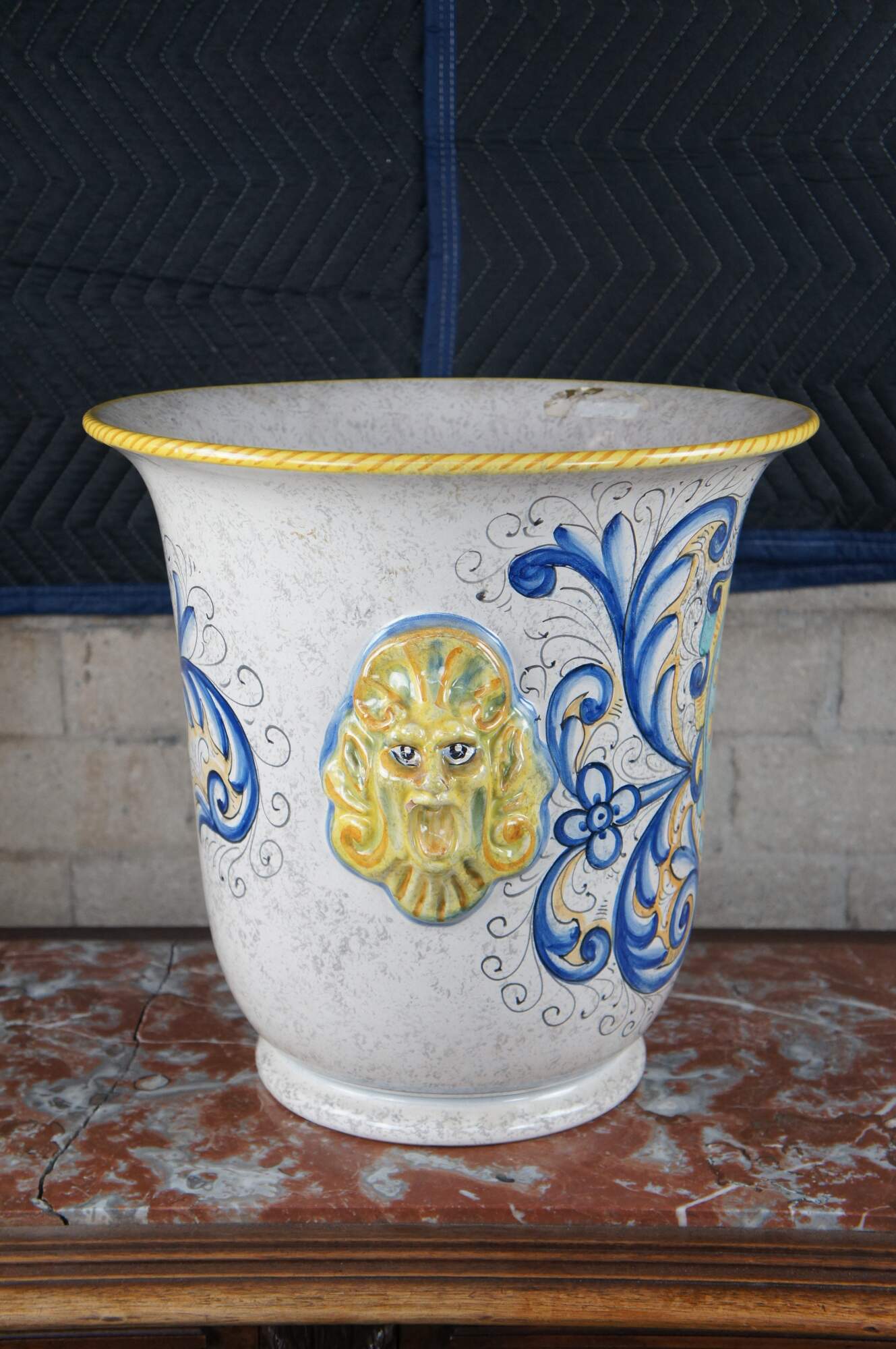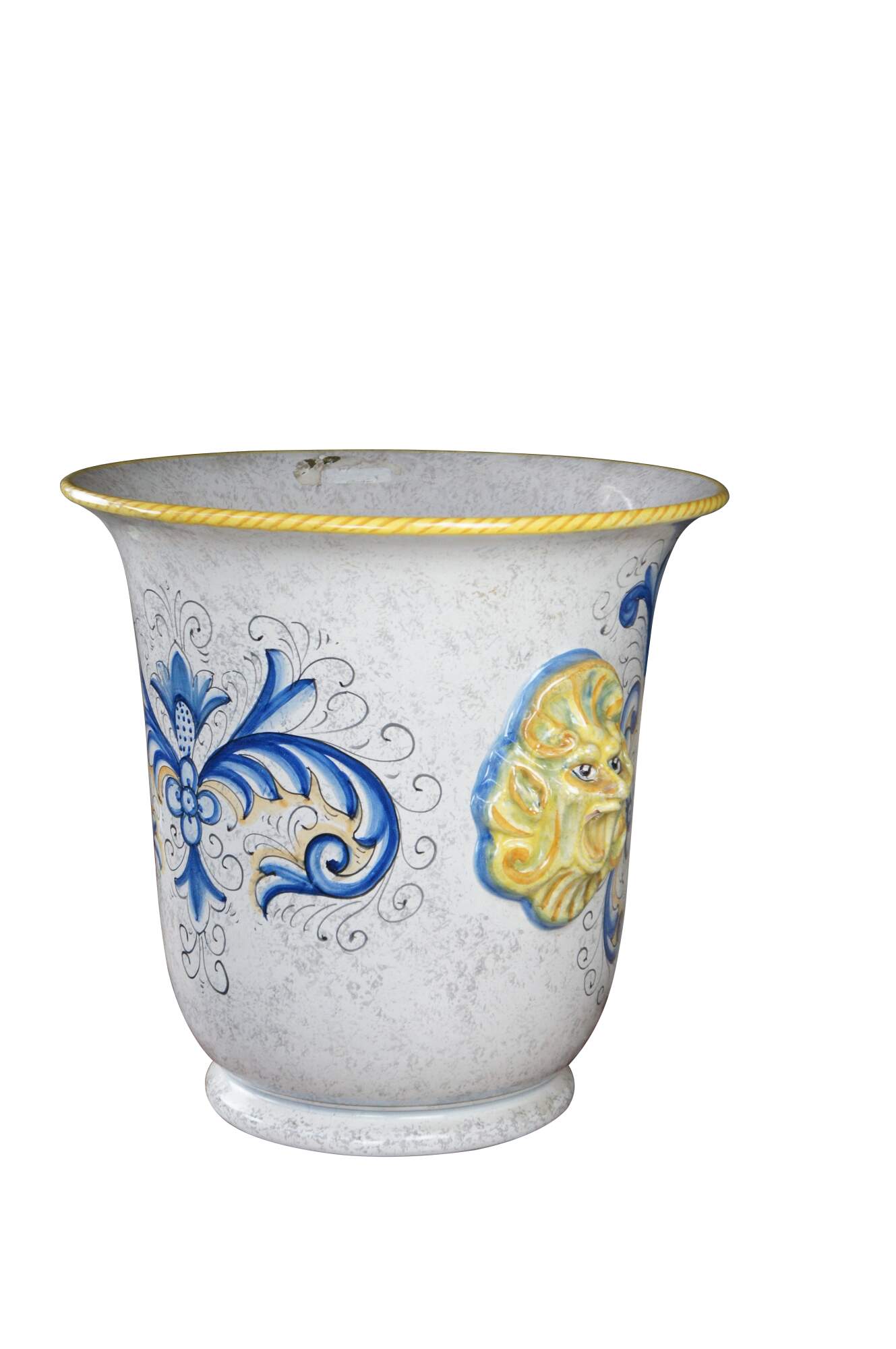 A beautiful 20th-century jardiniere by Deruta pottery. Features a hand-painted polychrome finish with elegant scrolling foliate motifs, figural northwind faces, and a shield or crest along the front.