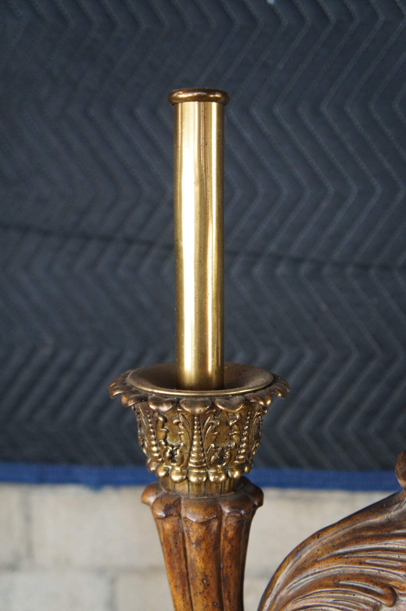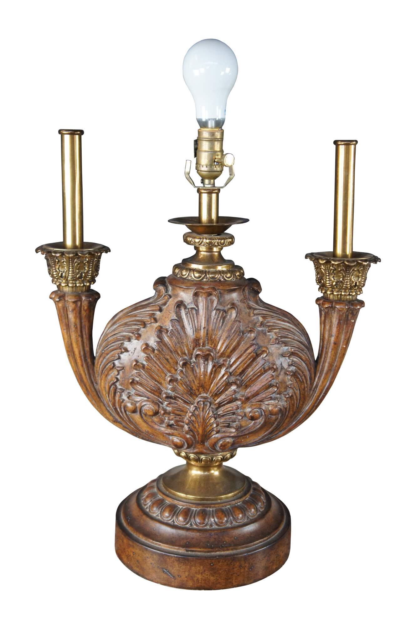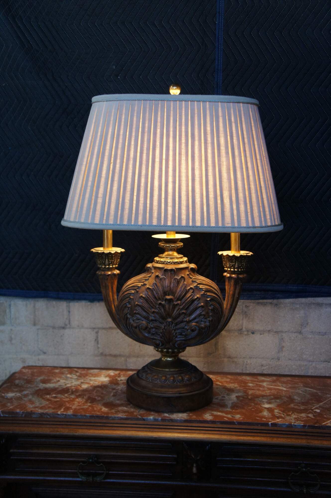 Vintage Maitland Smith carved acanthus brass candlestick / candelabra banquet / buffet / table lamp. Includes large oval pleated shade.