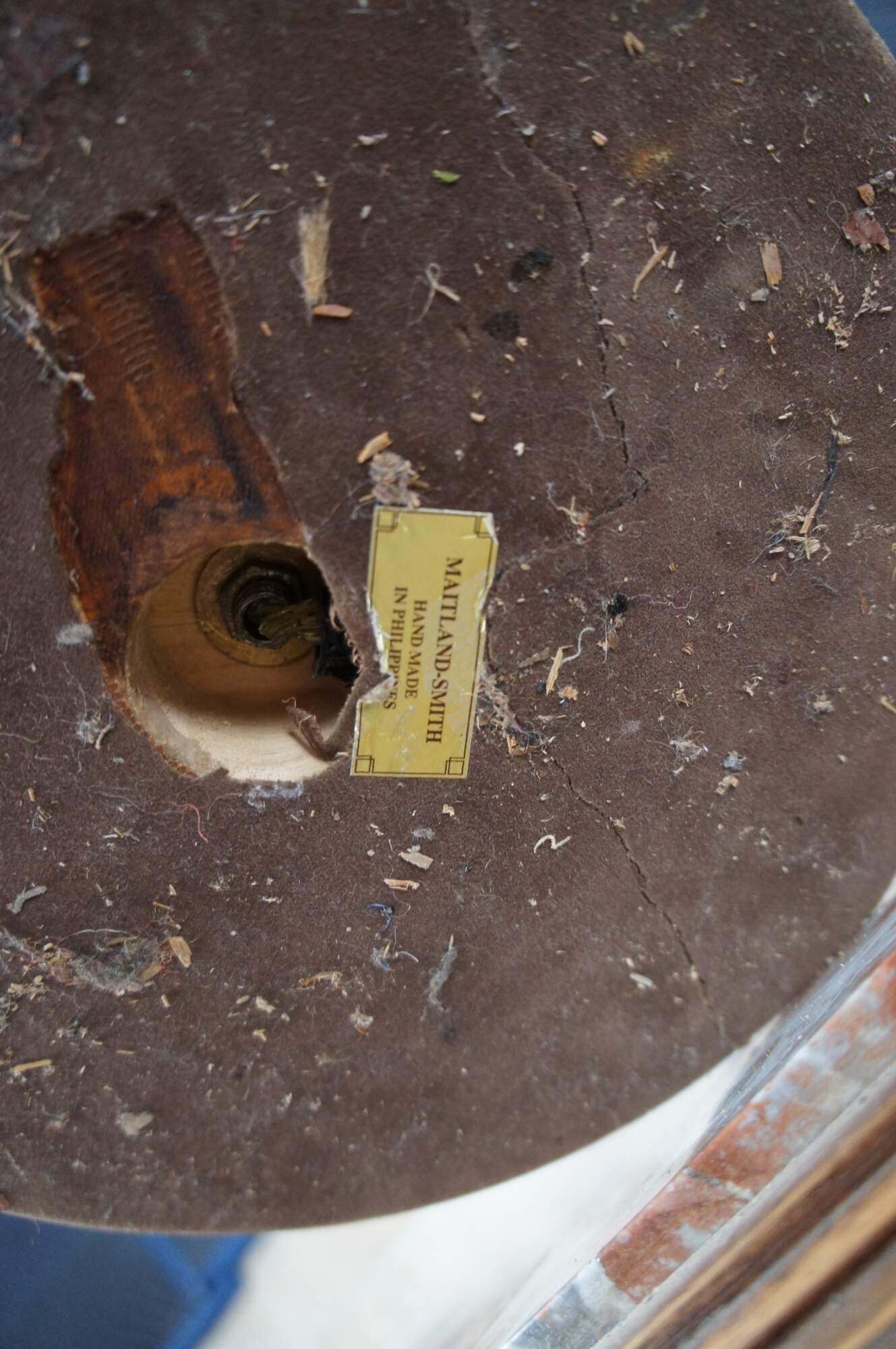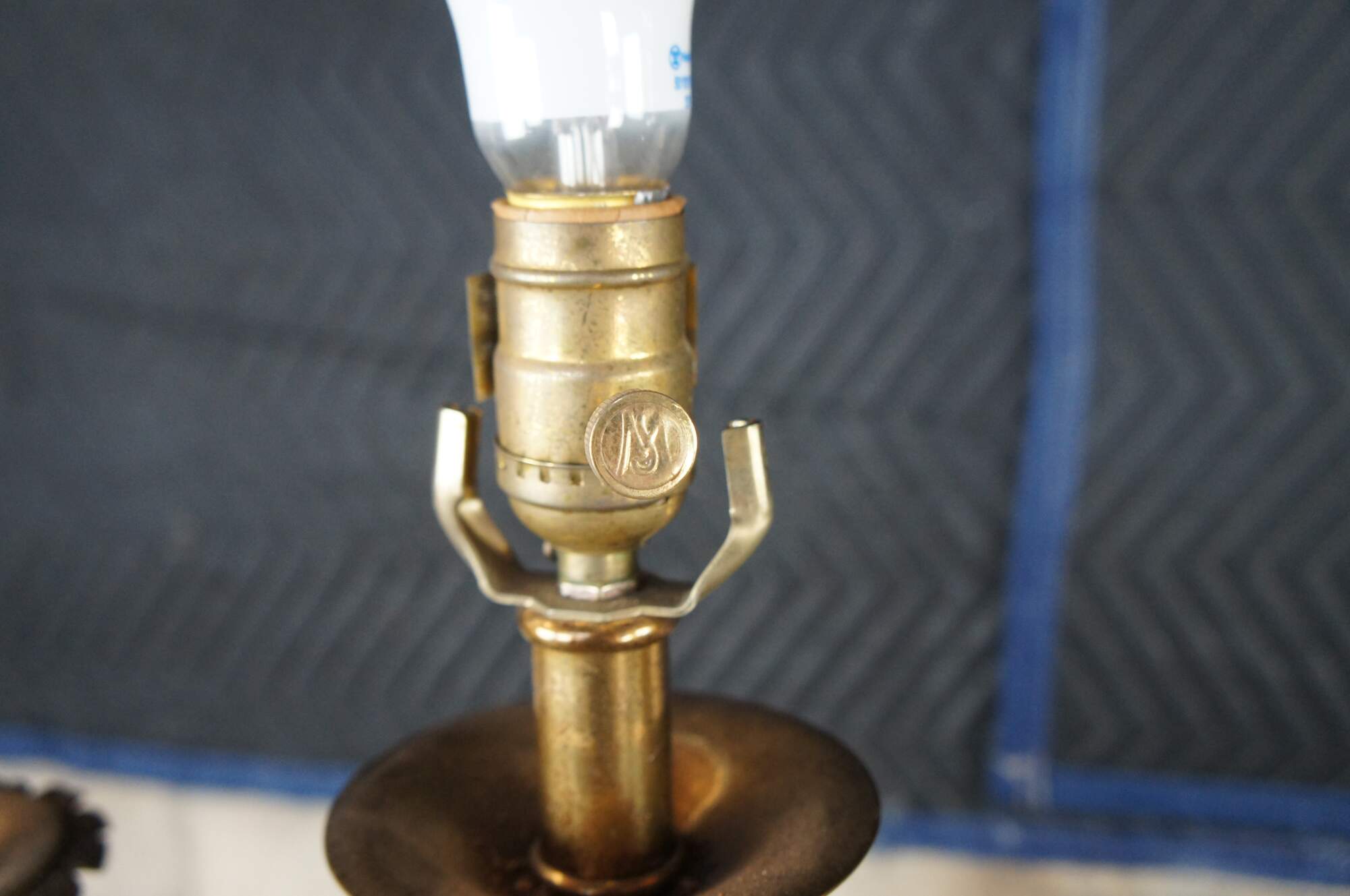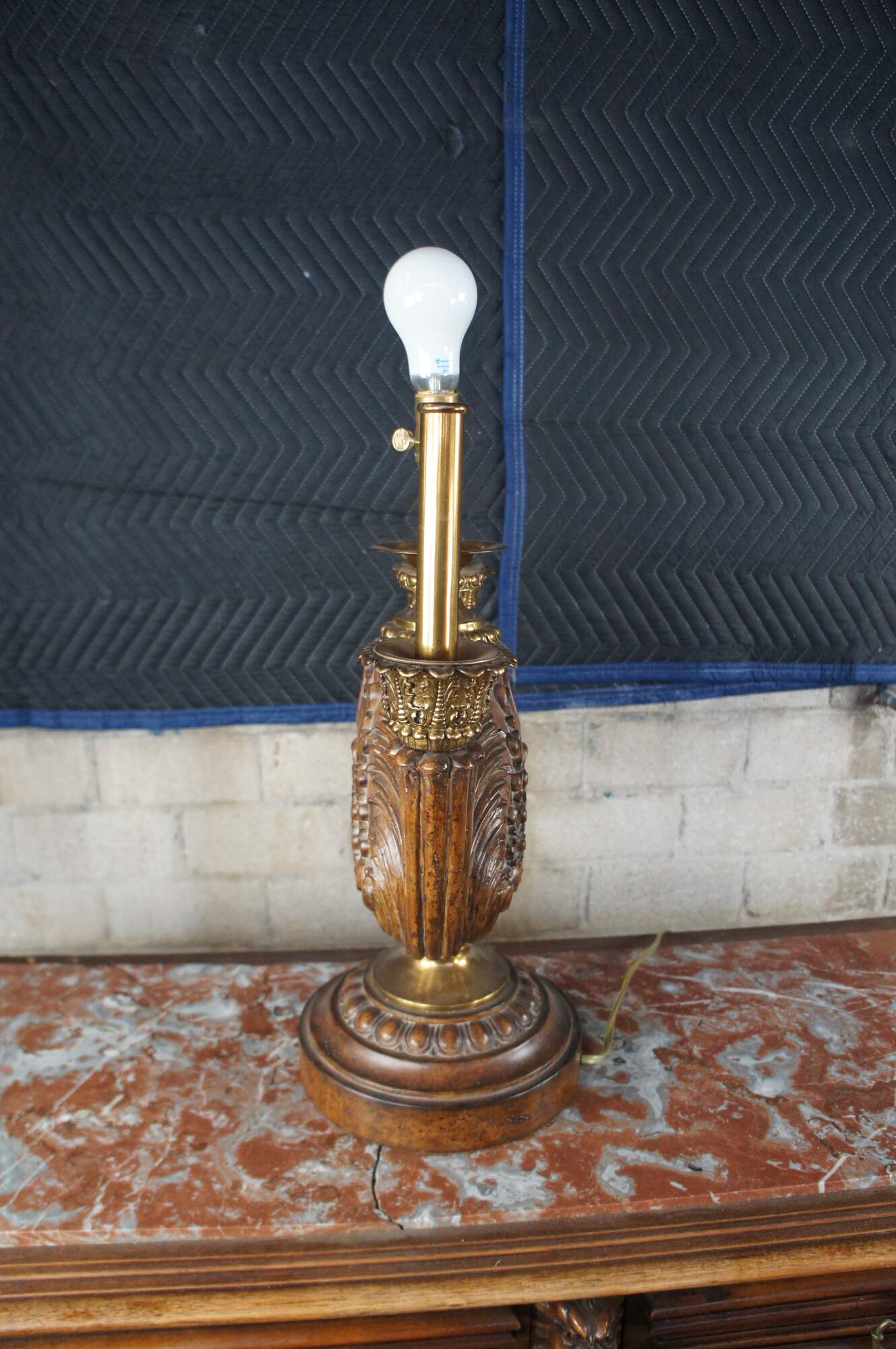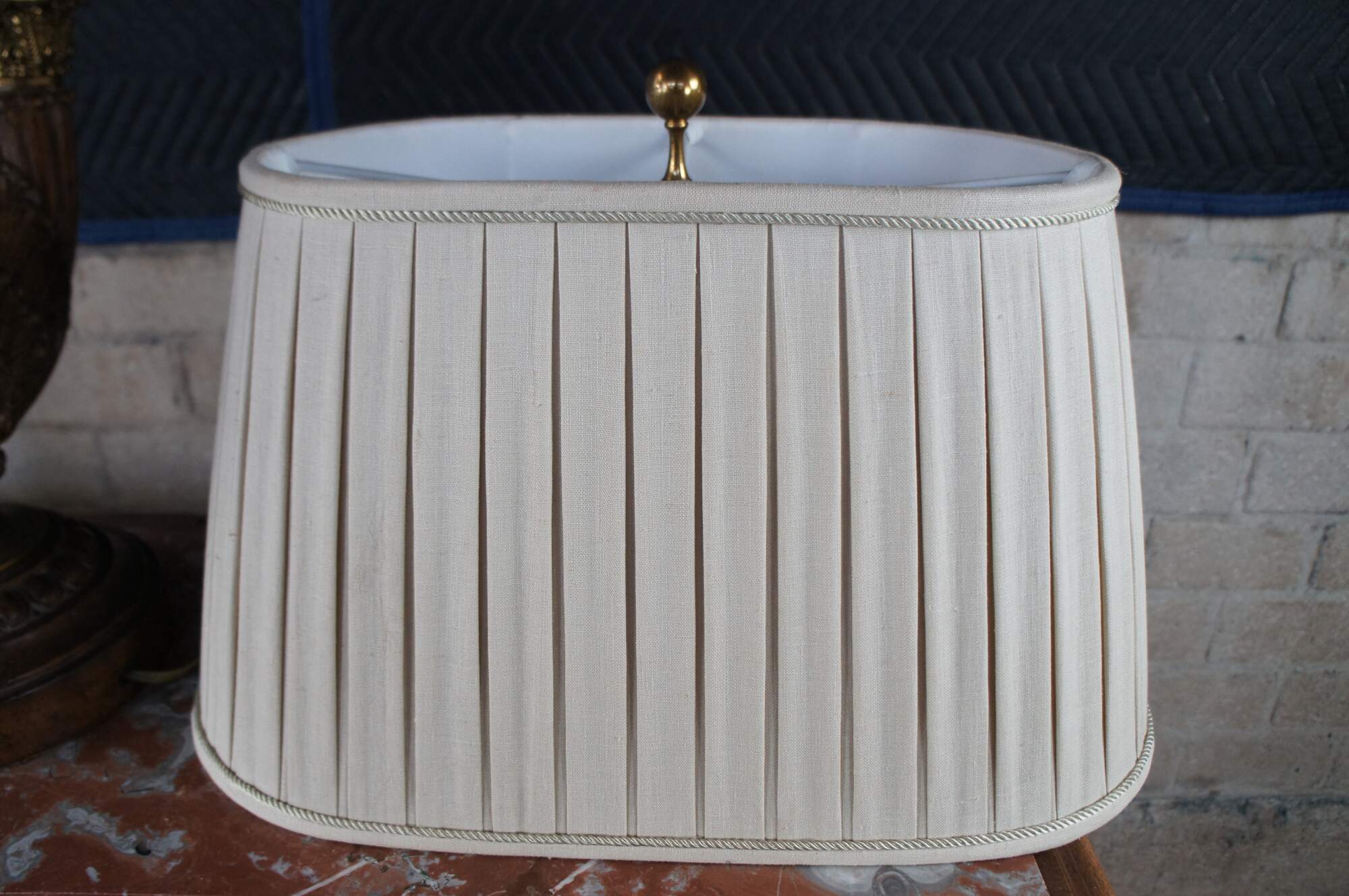 Vintage Maitland Smith carved acanthus brass candlestick / candelabra banquet / buffet / table lamp. Includes large oval pleated shade.
