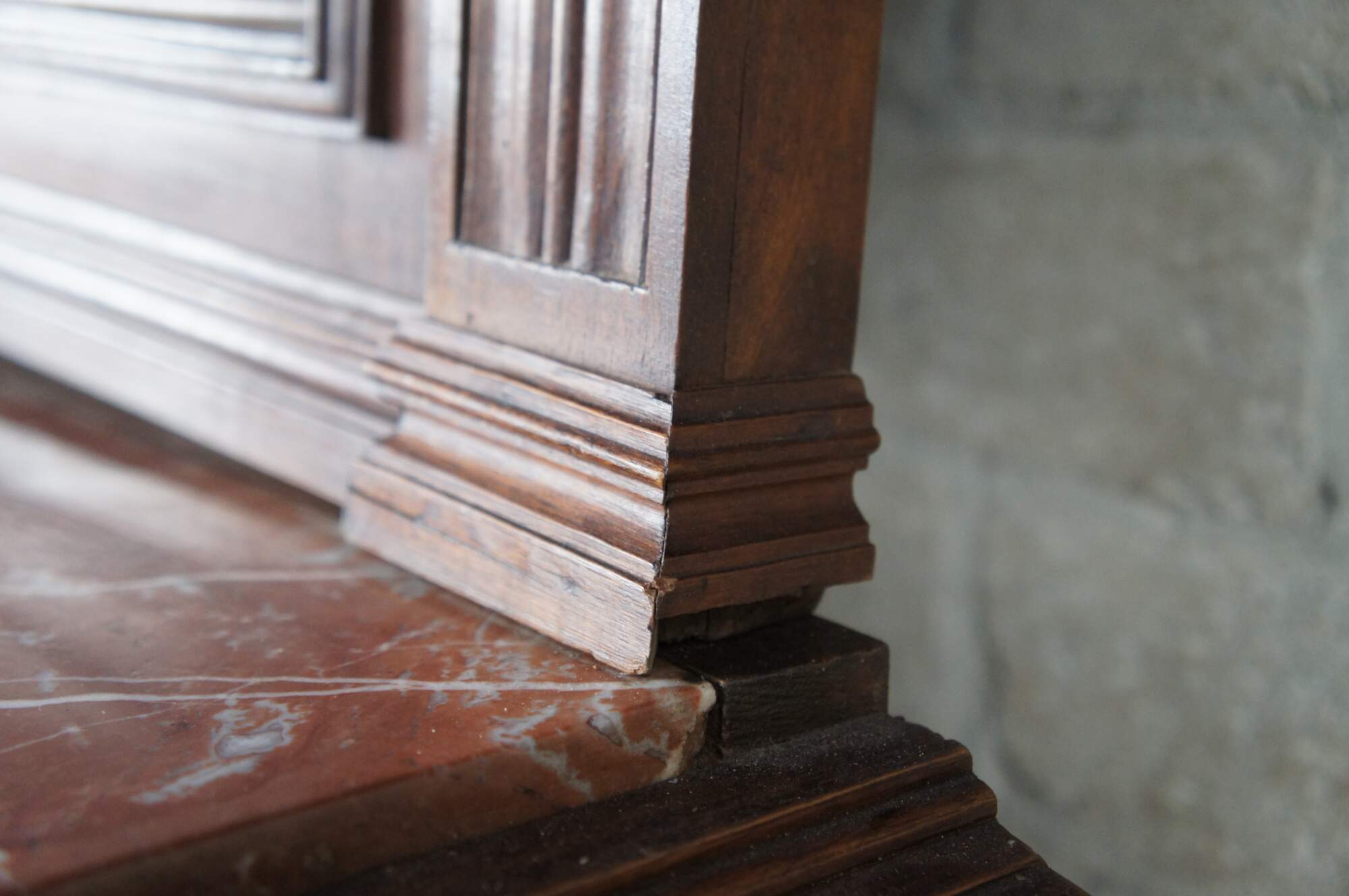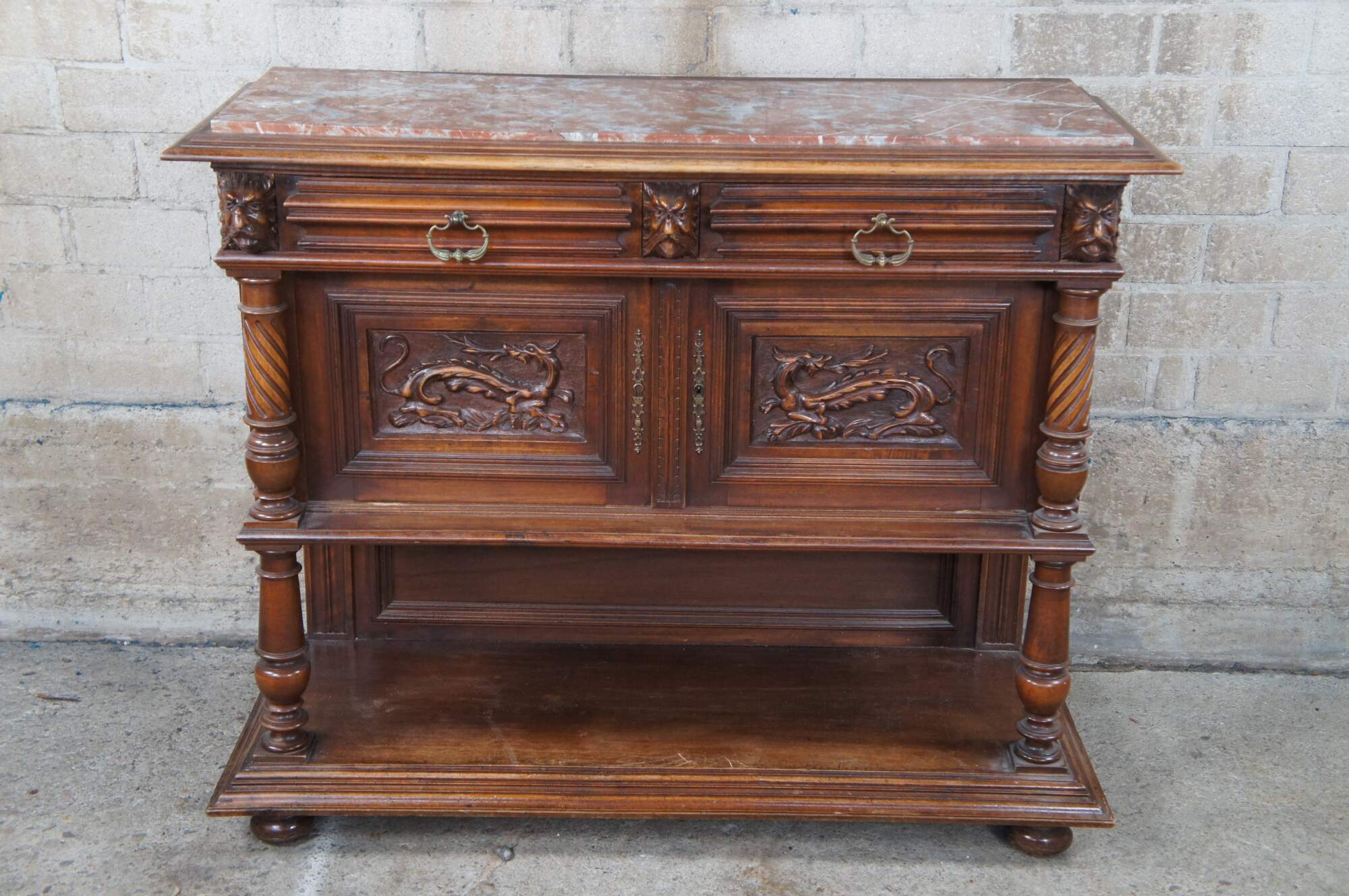 Antique French Renaissance / Gothic Revival cabinet / sideboard / buffet / bar / server. Made of walnut featuring Rouge marble top with paneled backsplash over two drawers and lower cabinet supported by turned columns, and accented by carved Northwind faces and dragons/ serpents.