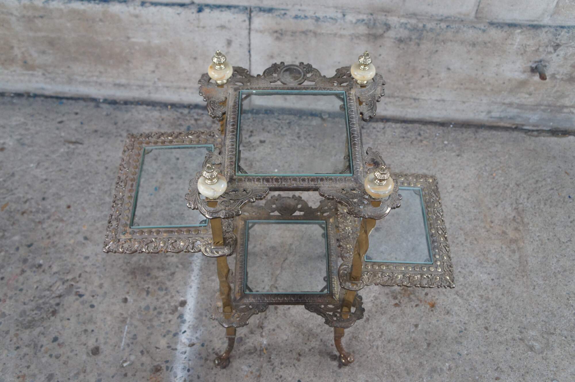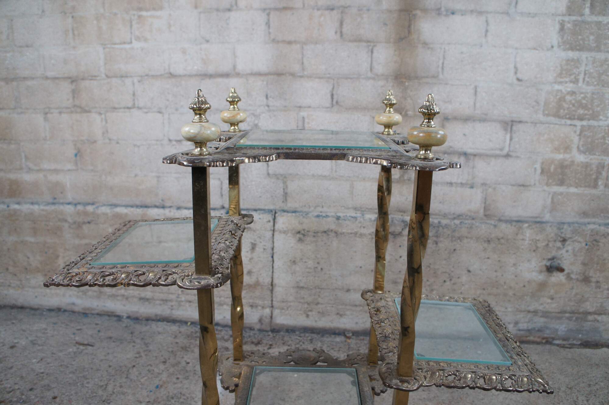 Antique Victorian tiered etagere curio display stand / side table. Made of cast and twisted brass featuring pierced shelves with glass inserts and carved onyx finials. Assembly required.
