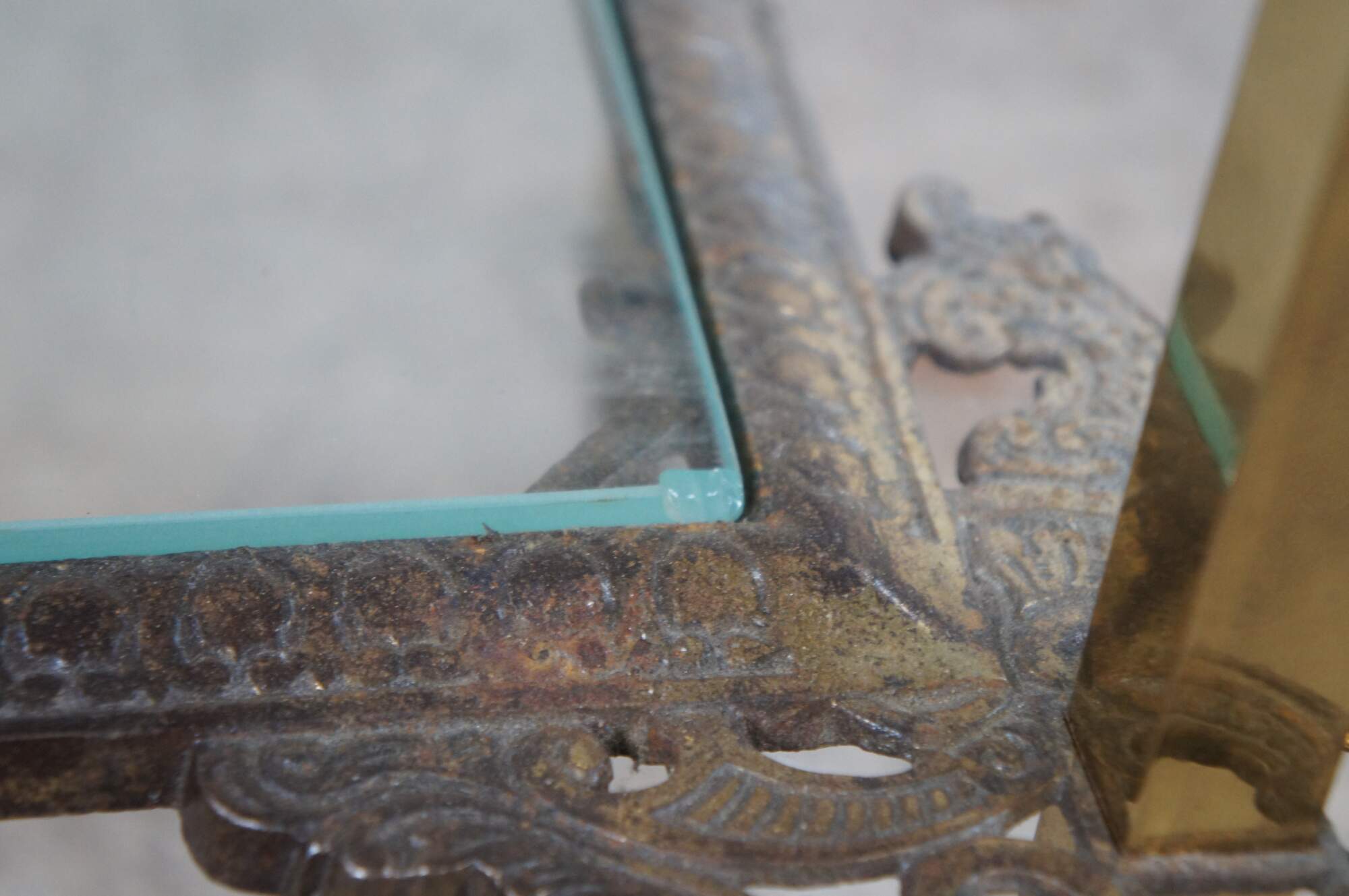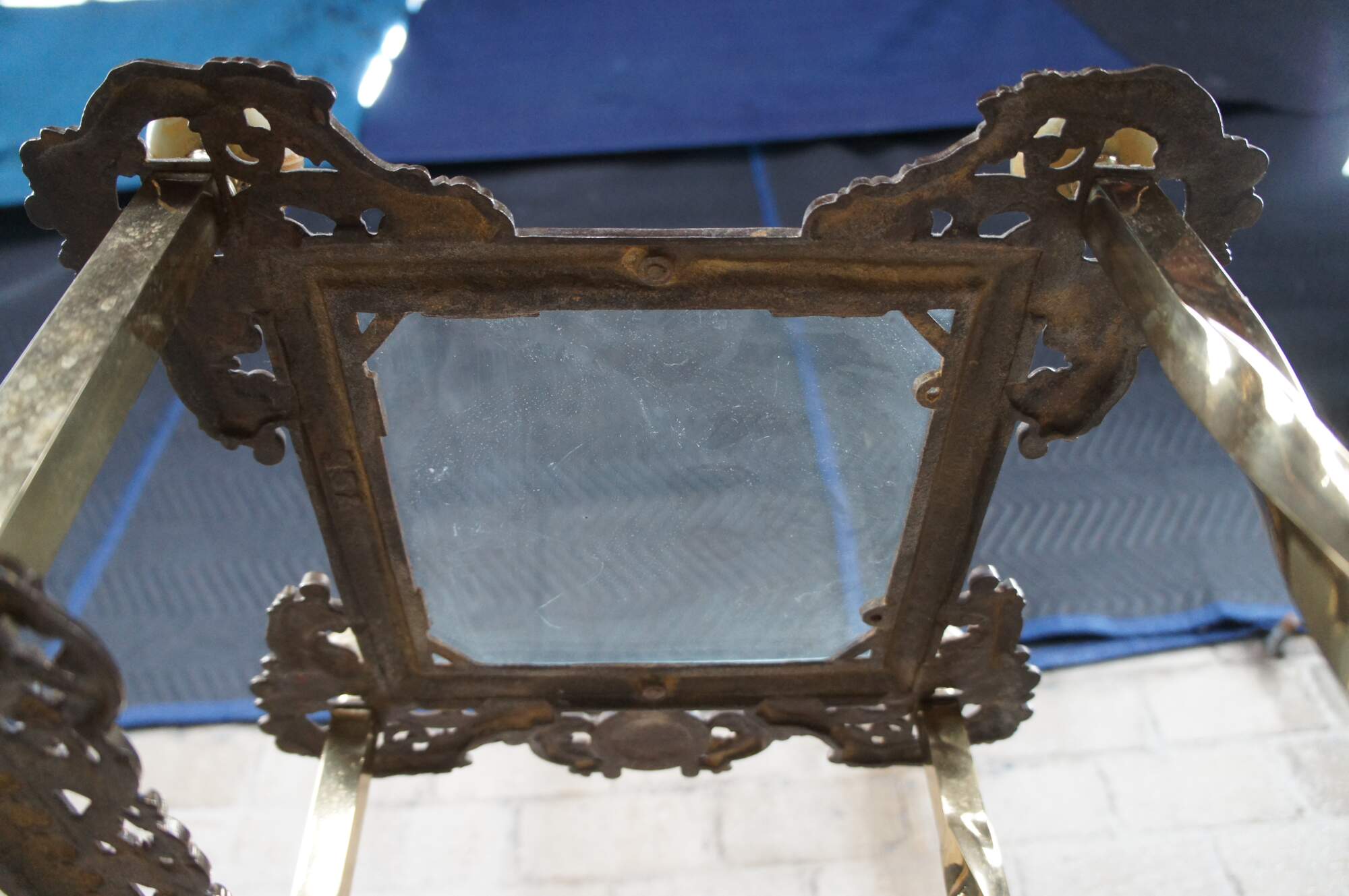 Fair condition, wear and distressing from age and use, slight leaning to shelves, pitting / oxidation to brass. Assembly required for safe shipping.
