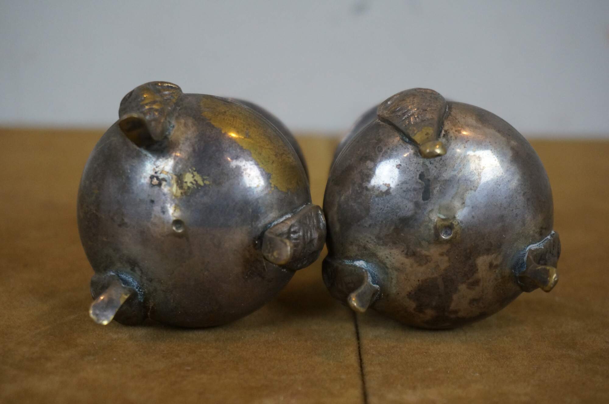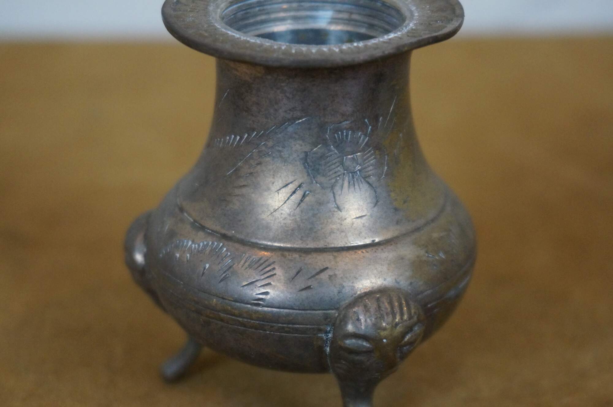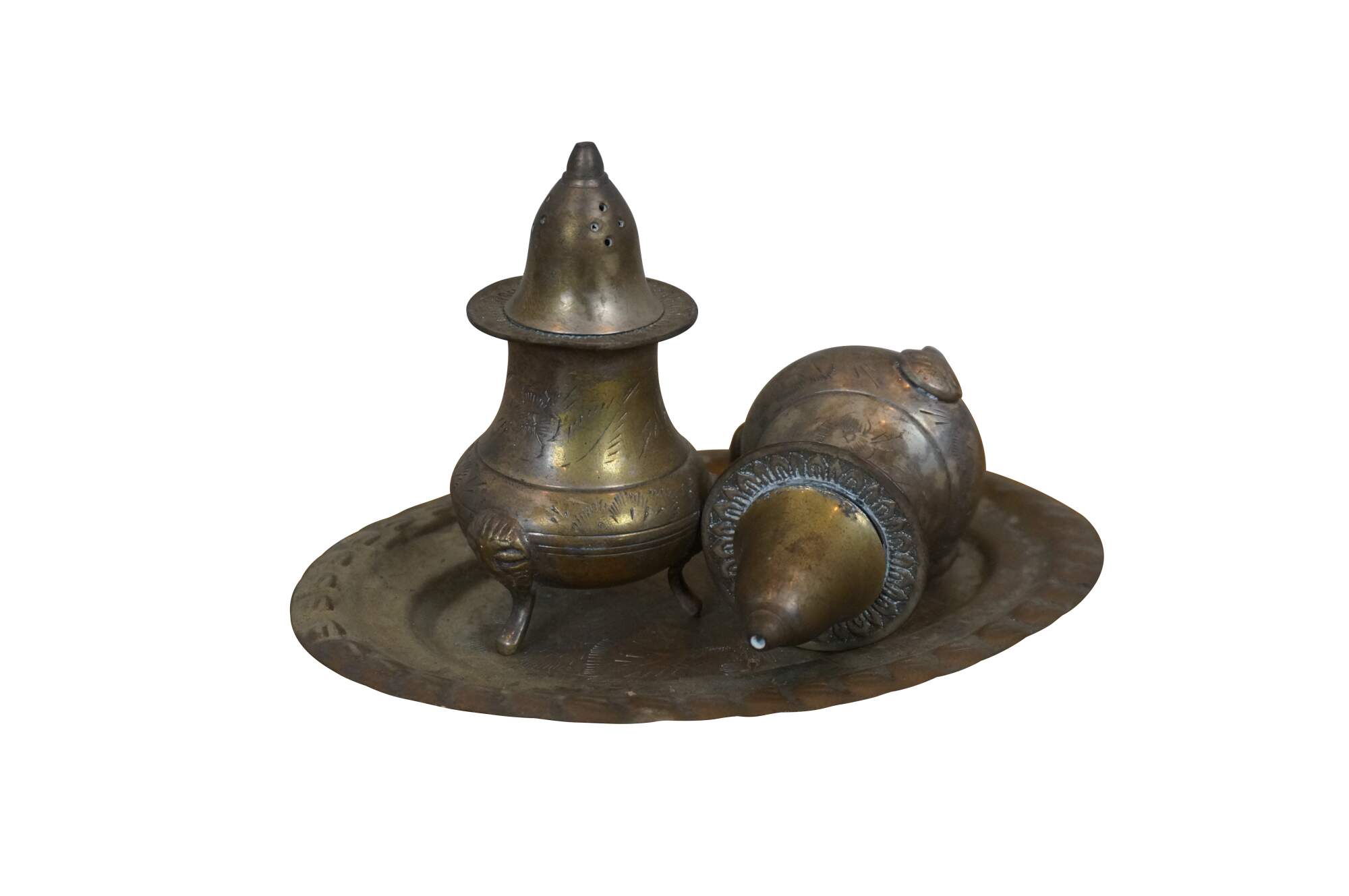 Charming 20th century three piece silverplate cruet set, including a pair of footed, screw top salt and pepper shakers with lions head feet and an oval underplate, etched with a simple Indian floral design. Brass finish. Marked EPNS on base.