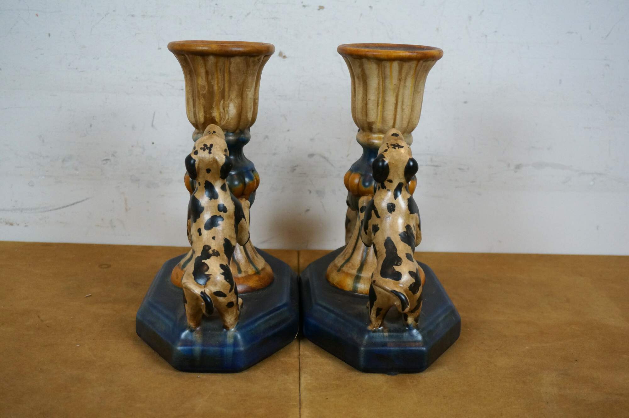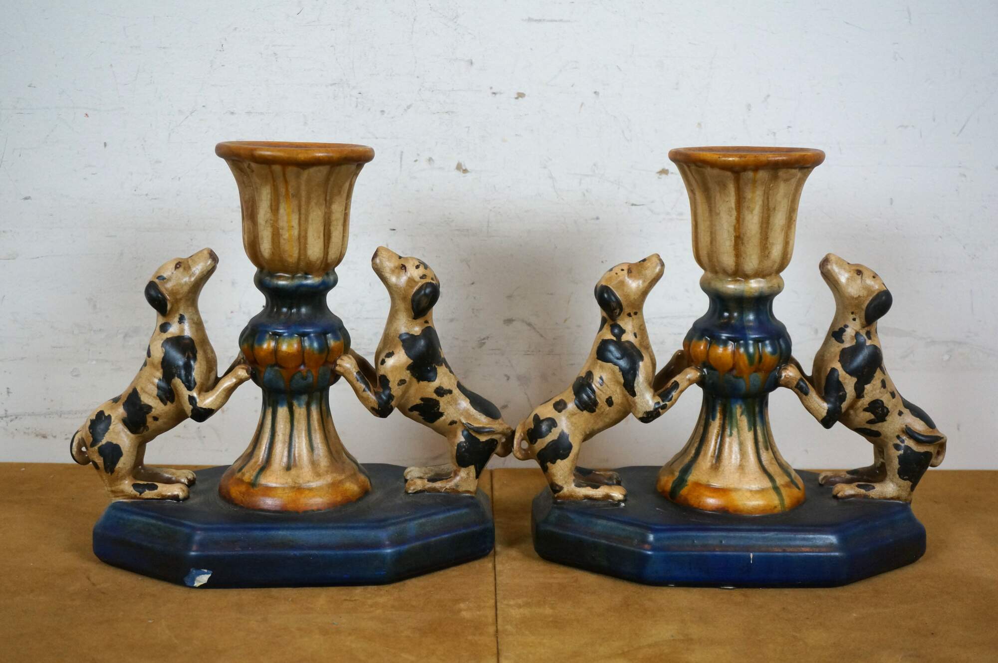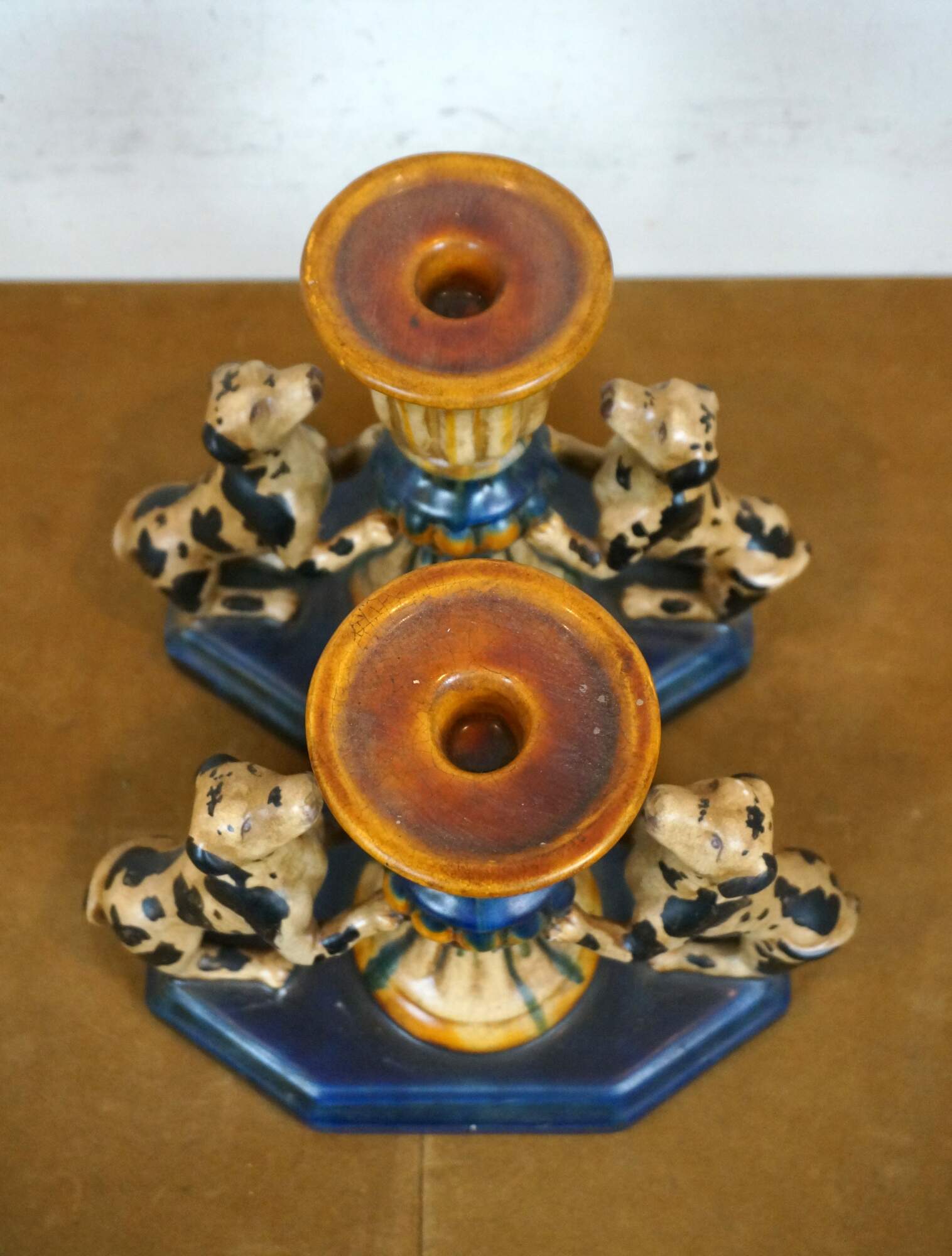 Pair of late 20th century ceramic Staffordshire-style candle holders featuring fluted blue and golden brown drip-glazed candle cups, flanked by a pair of black spotted dalmations / dogs on blue octagonal bases.