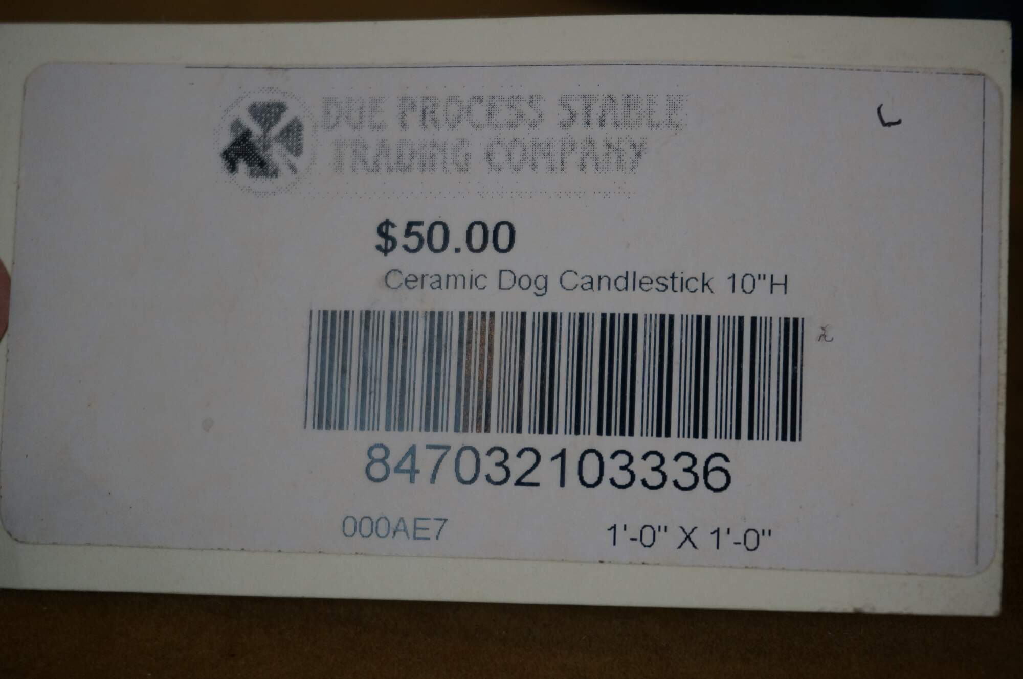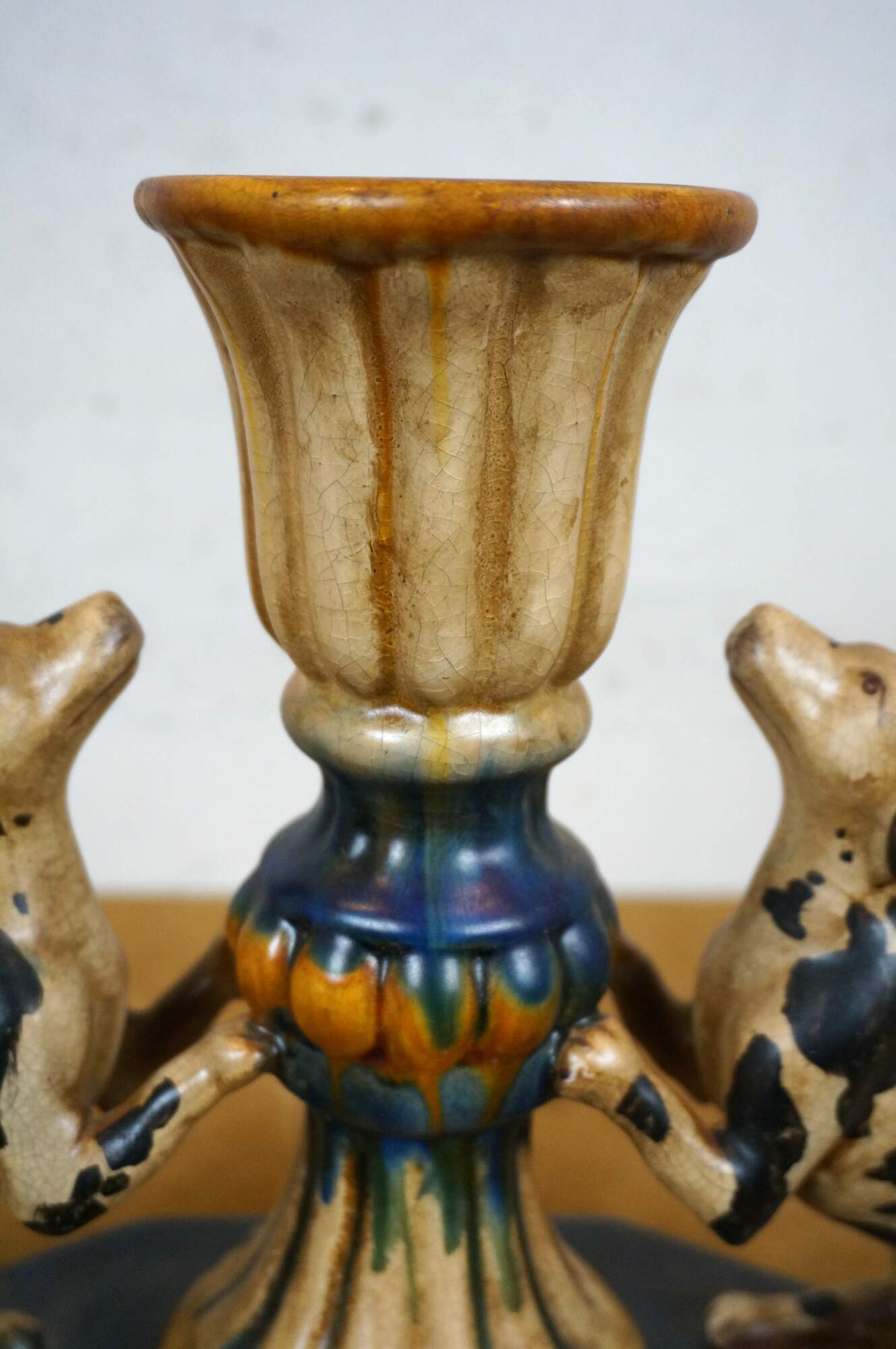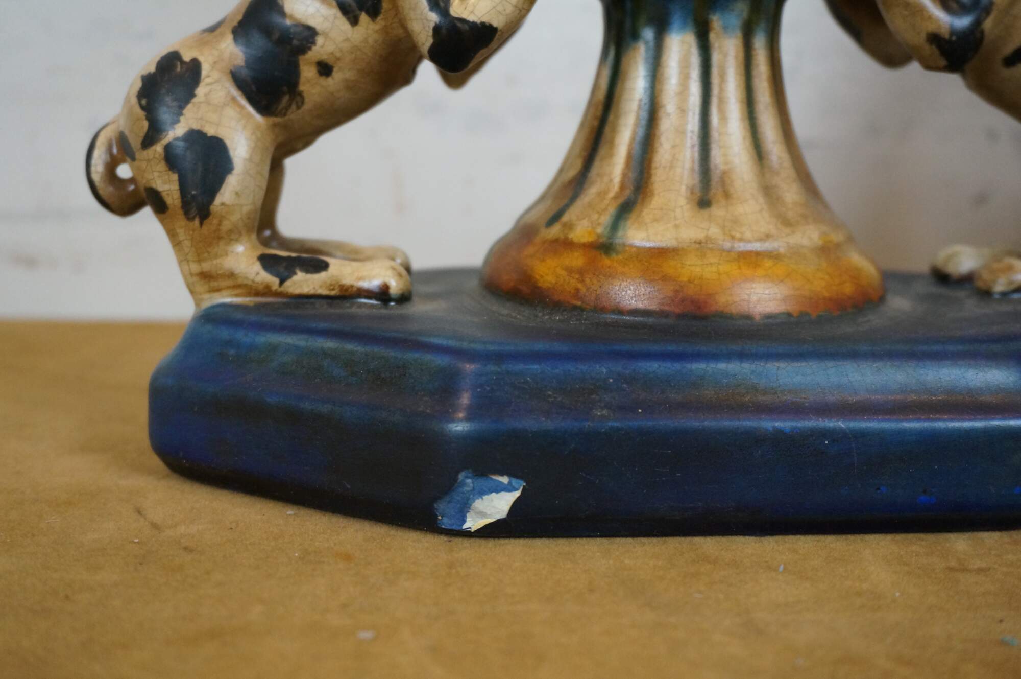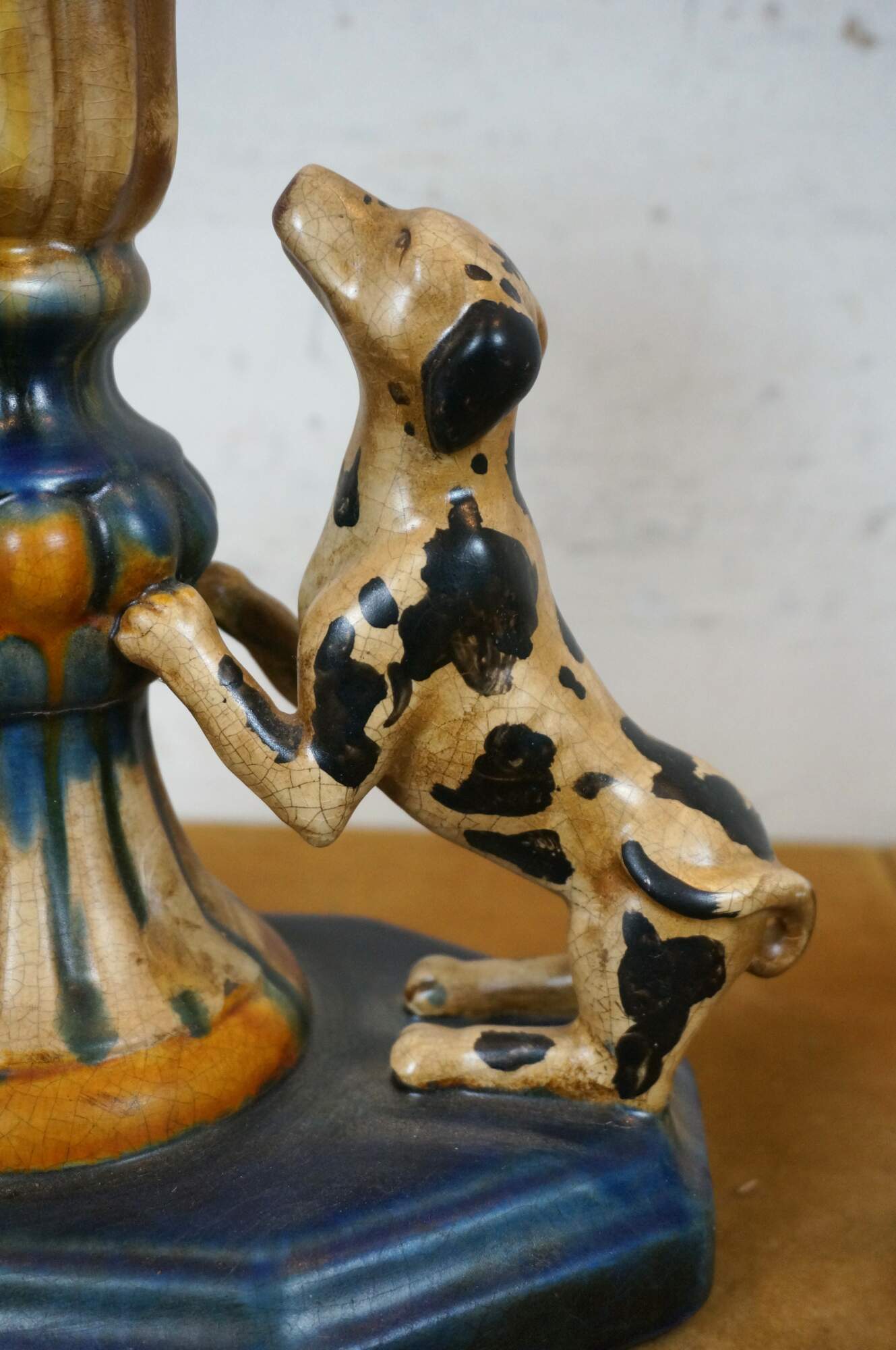 Pair of late 20th century ceramic Staffordshire-style candle holders featuring fluted blue and golden brown drip-glazed candle cups, flanked by a pair of black spotted dalmations / dogs on blue octagonal bases.