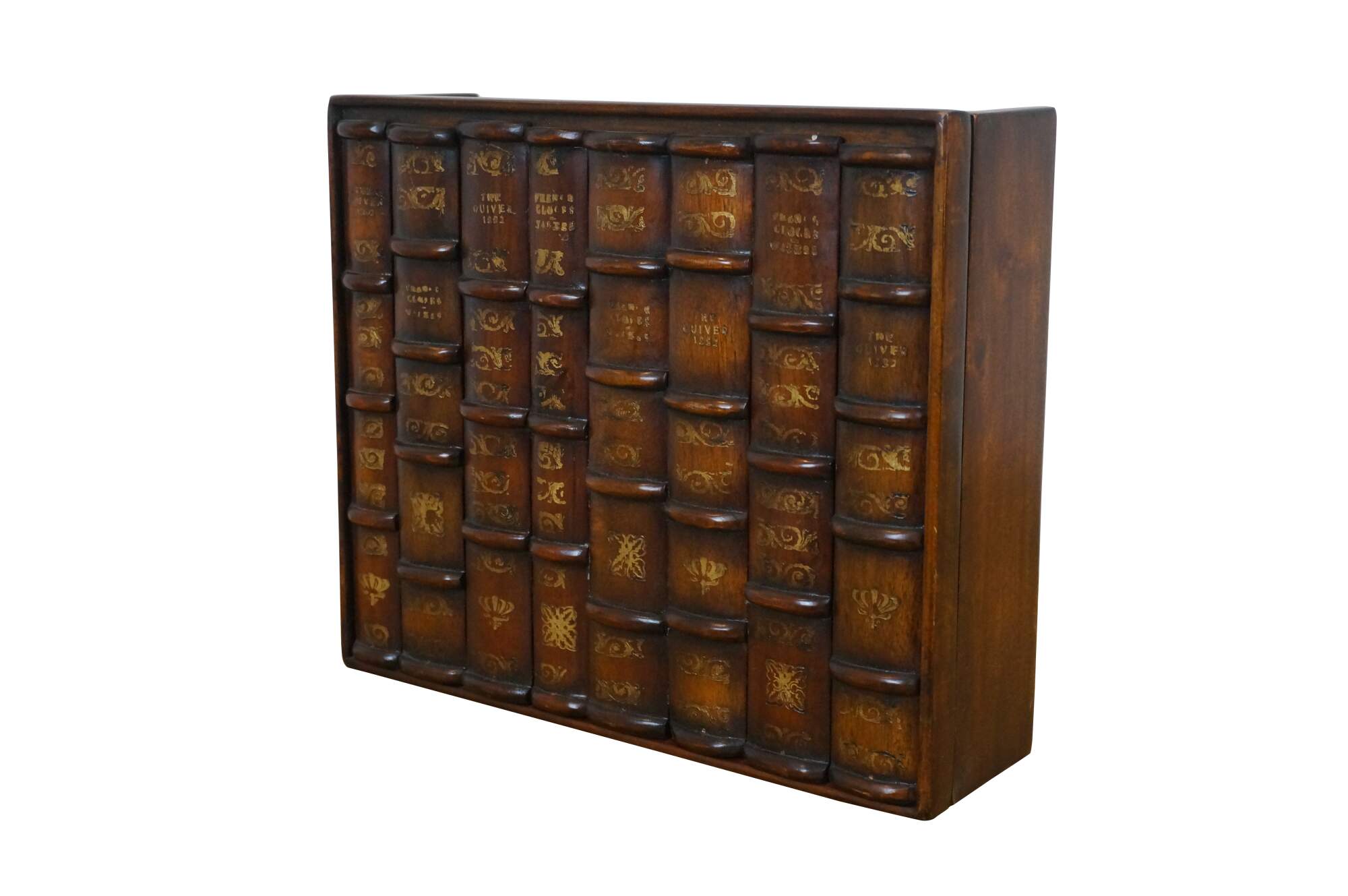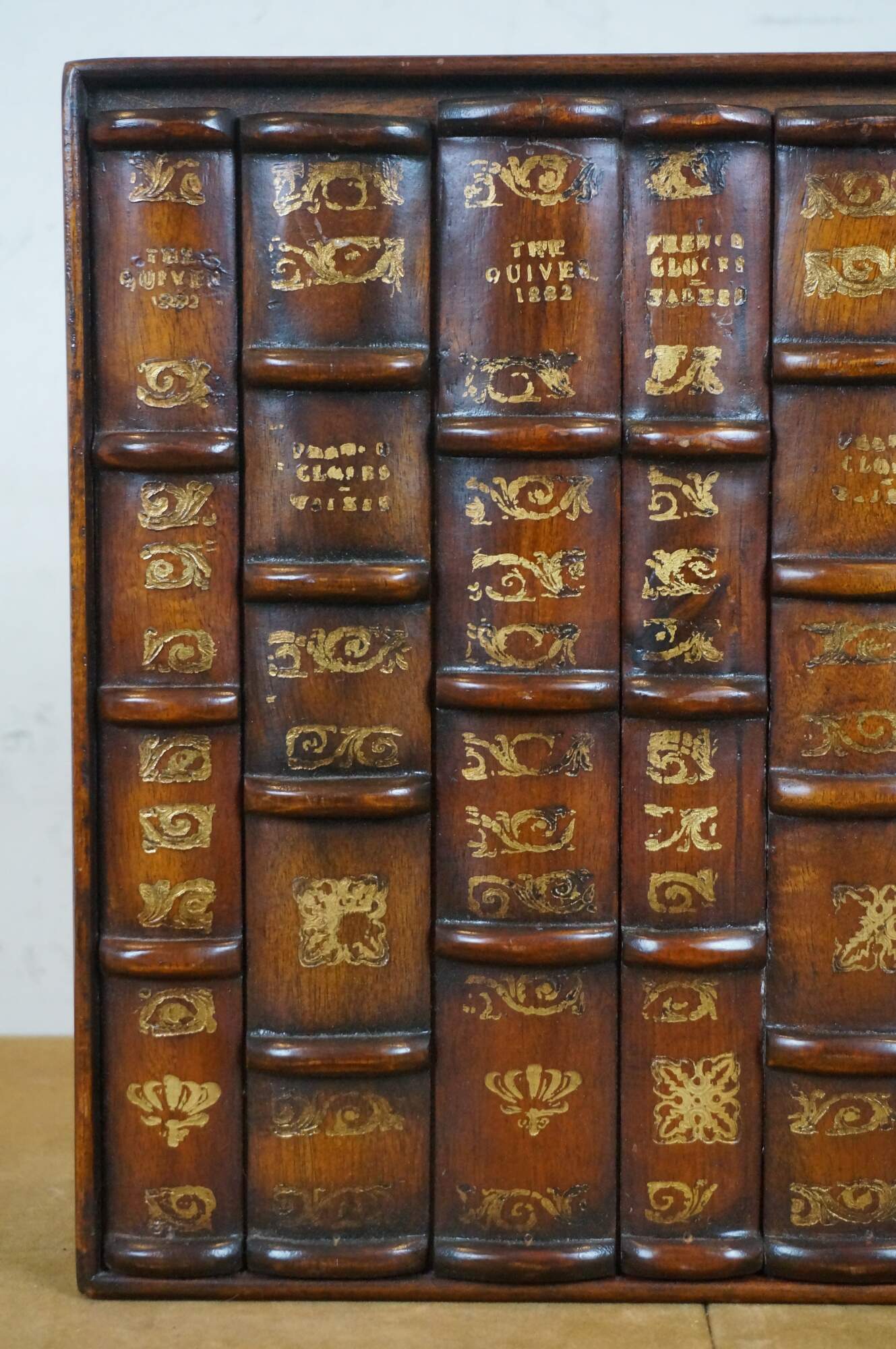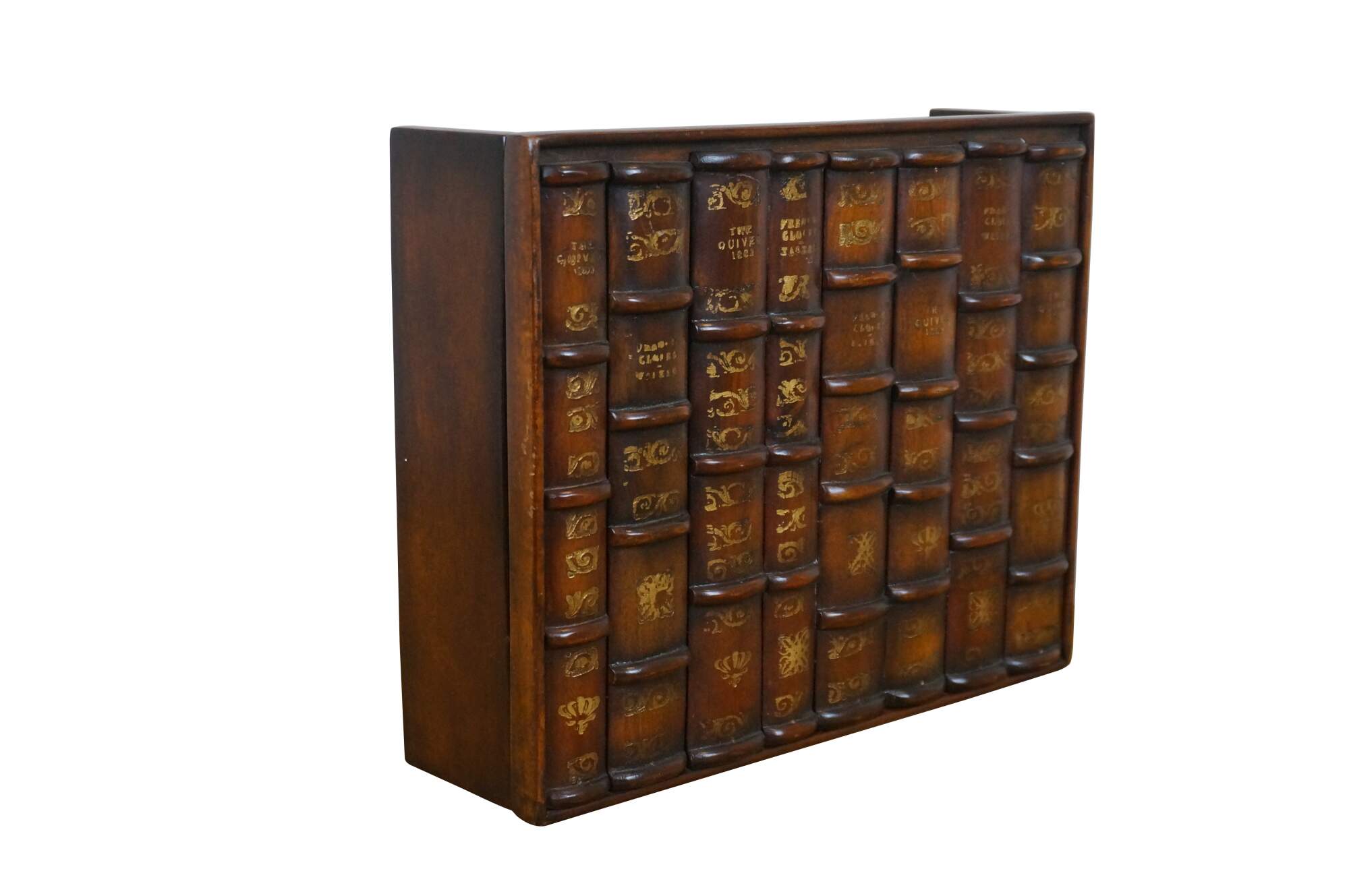 Vintage Theodore Alexander walnut panel with two folding sides supports, carved to resemble a row of old books, with stamped gilt details. Made in Vietnam.