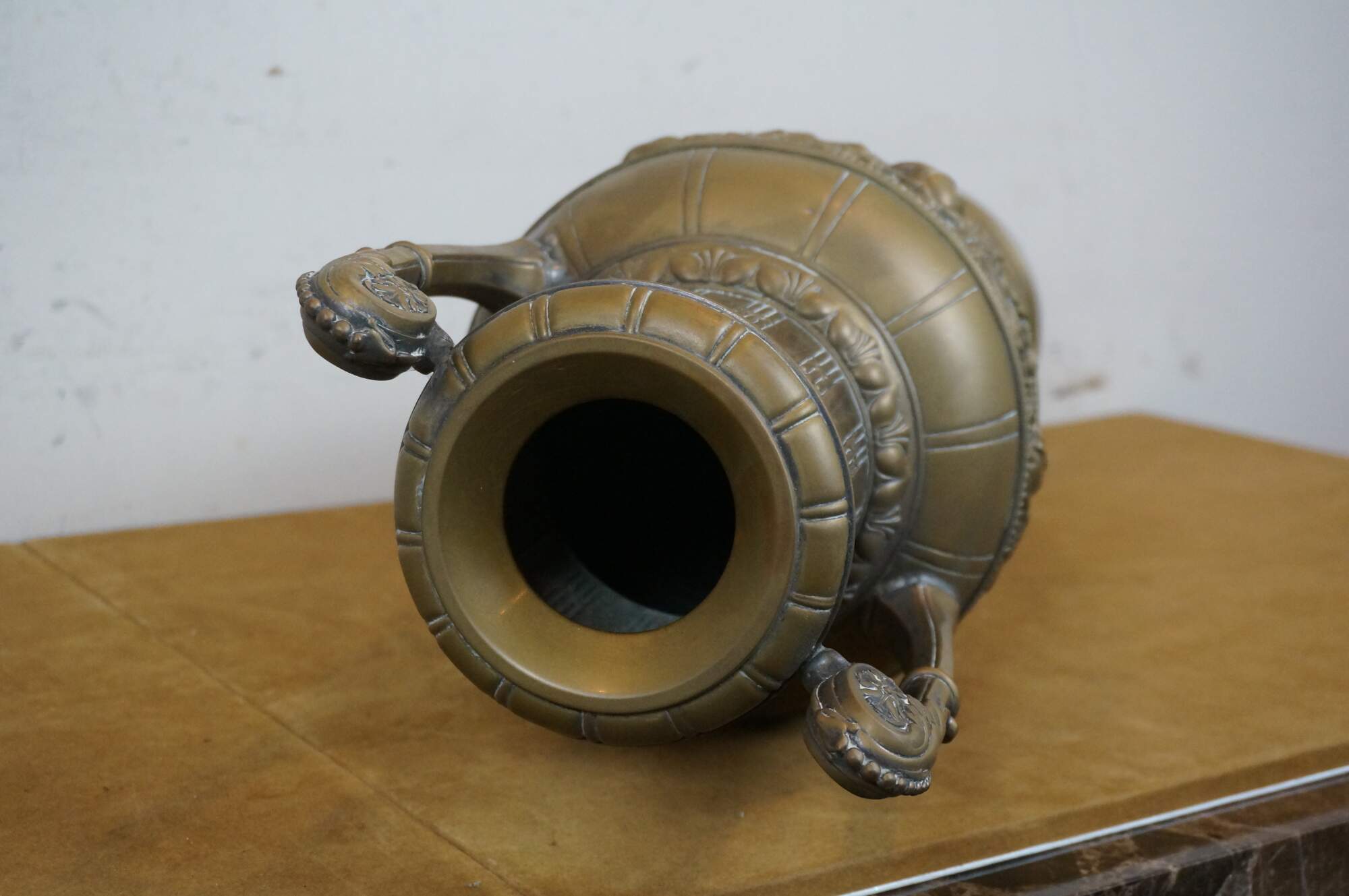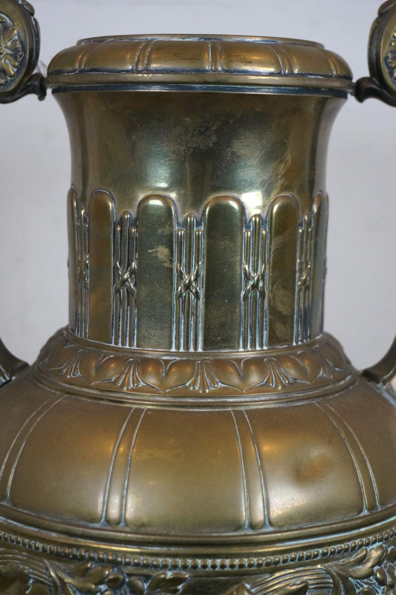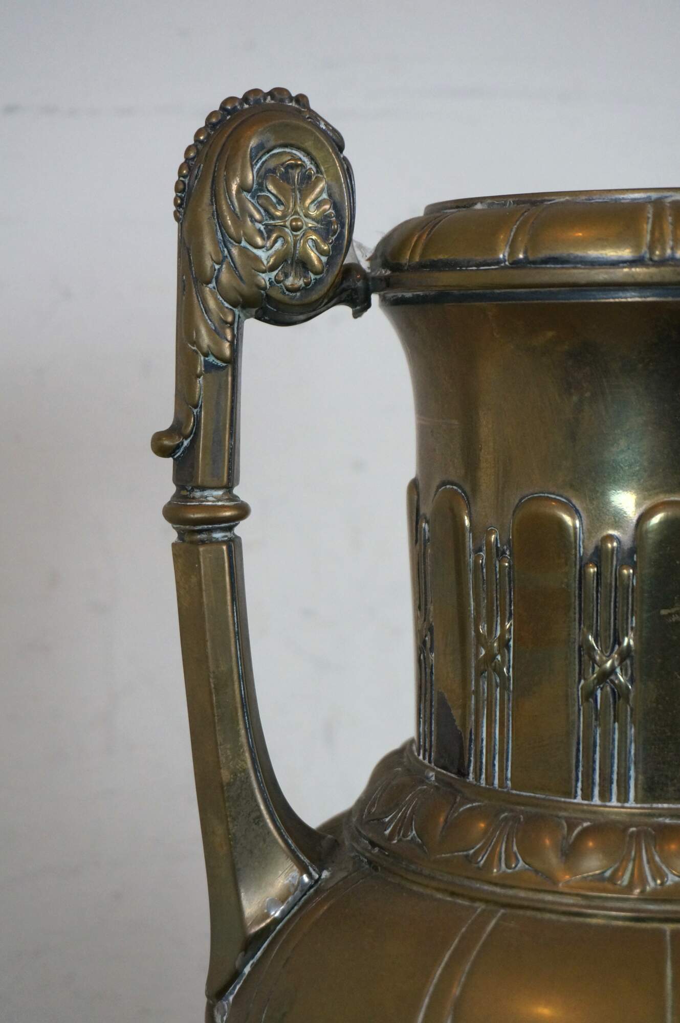 Vintage Neoclassical Empire-style tall brass urn / cassolette / amphora vase with scrolled handles and a repousse band showing a vine of roses and small blossoms winding around bundled staves.
