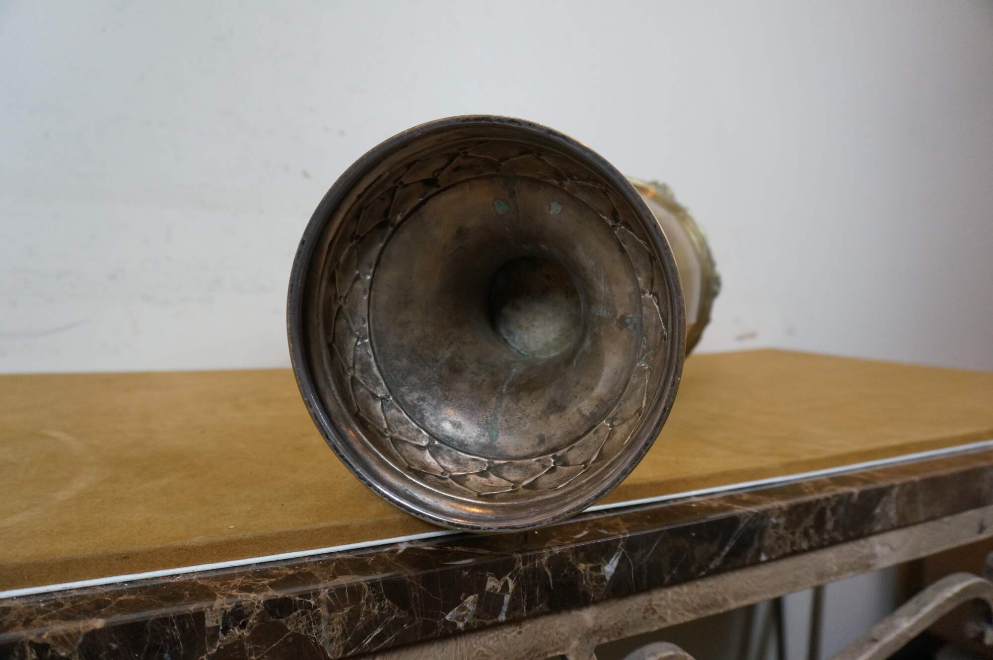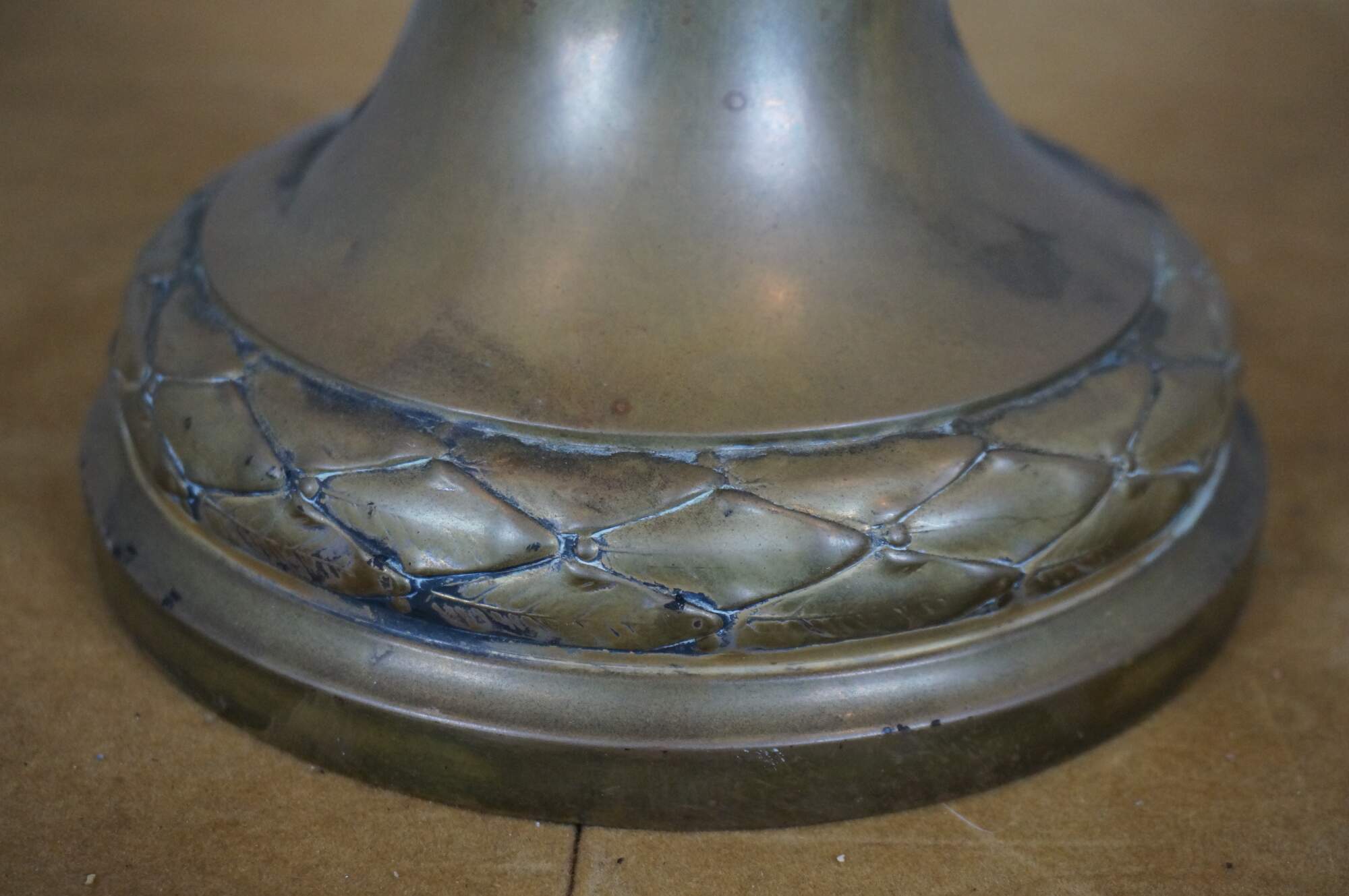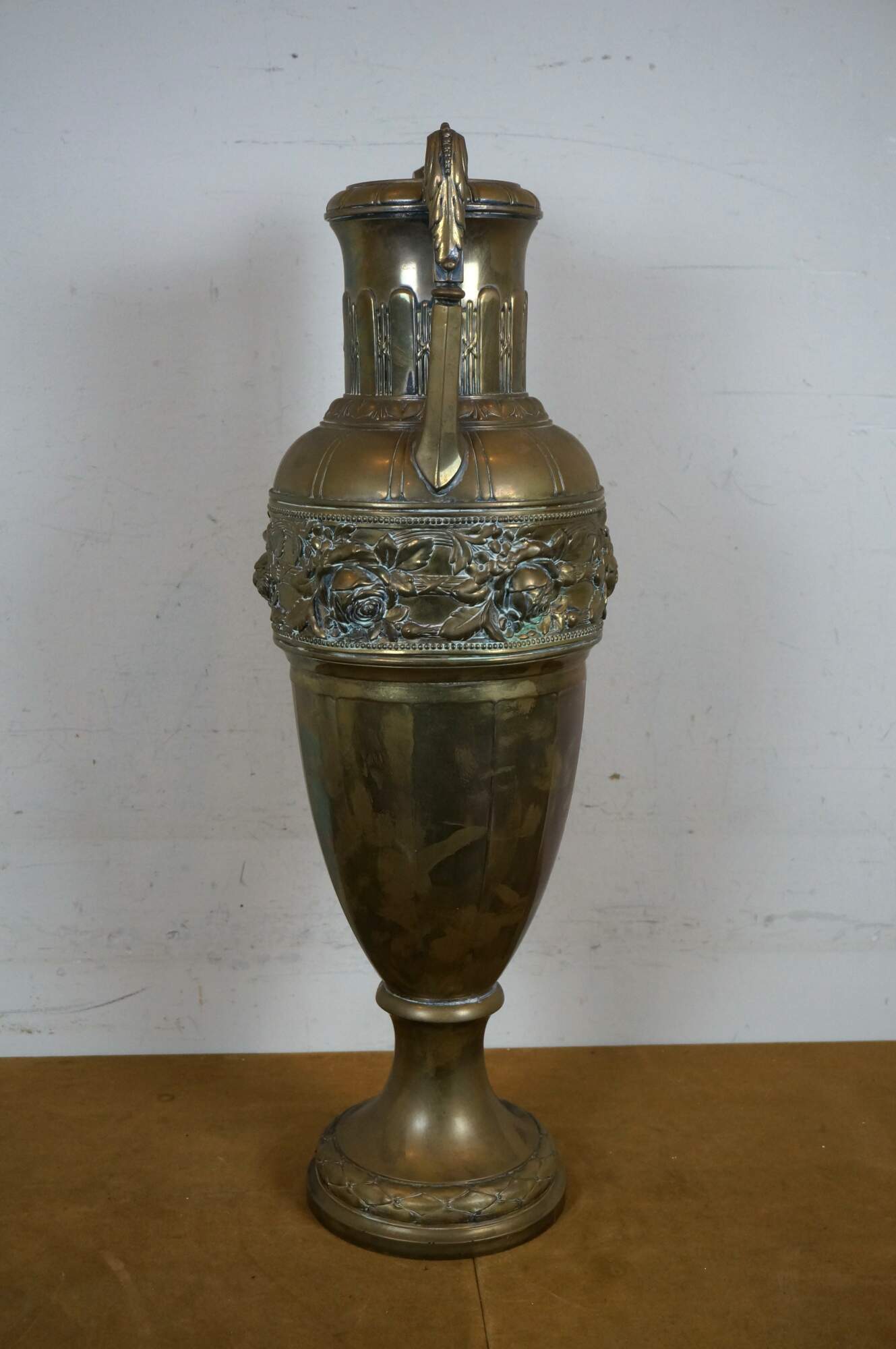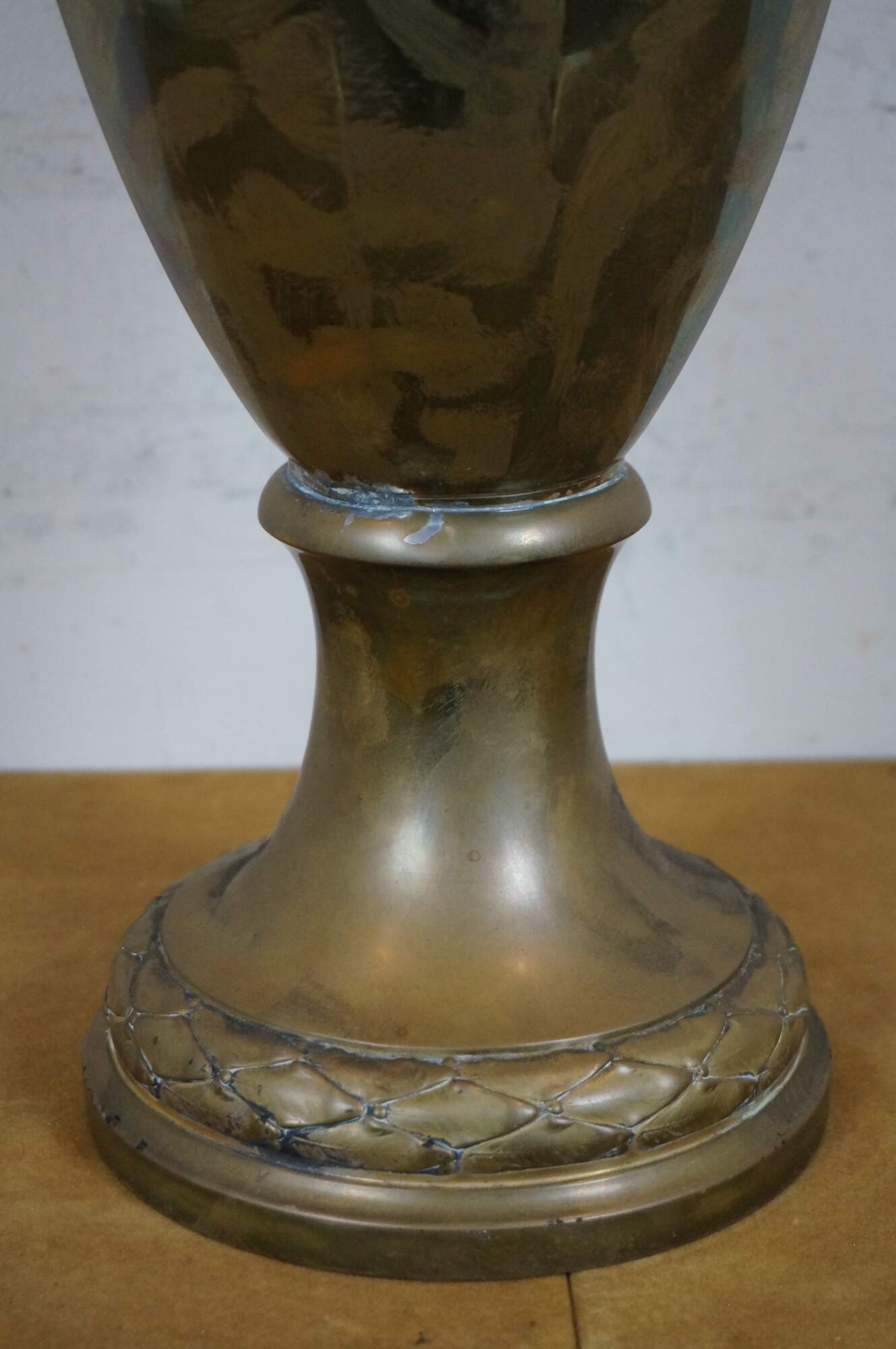 Vintage Neoclassical Empire-style tall brass urn / cassolette / amphora vase with scrolled handles and a repousse band showing a vine of roses and small blossoms winding around bundled staves.