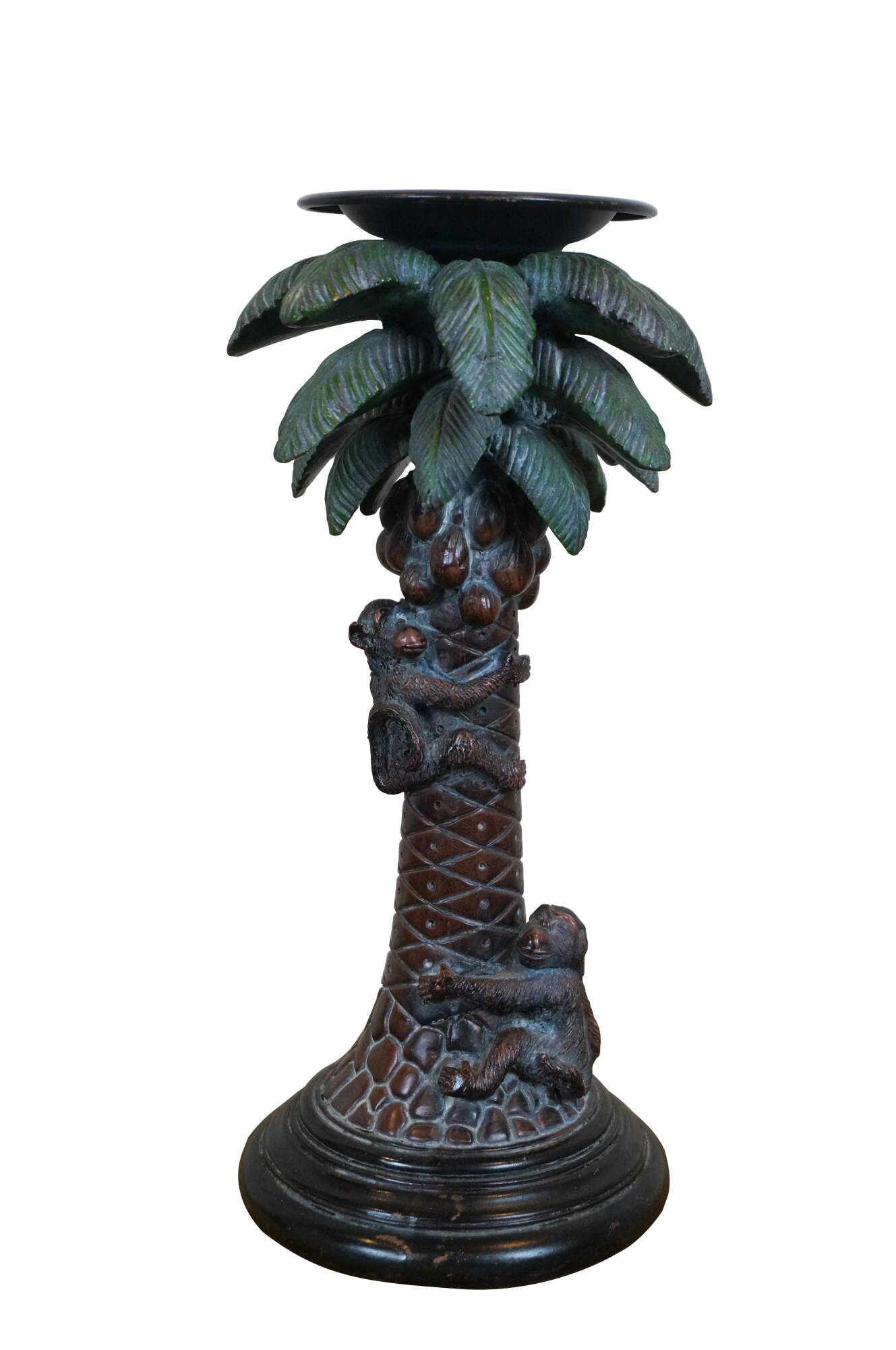 Pair of late 20th century resin candle holders in the shape of palm trees full of coconuts and two climbing monkeys, set on round-tiered bases. Metal candle cups on top feature a single spike for a pillar candle.