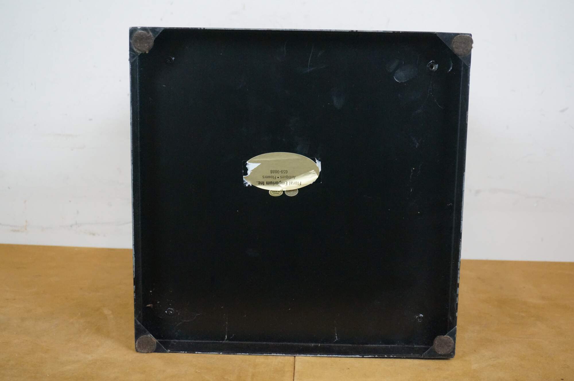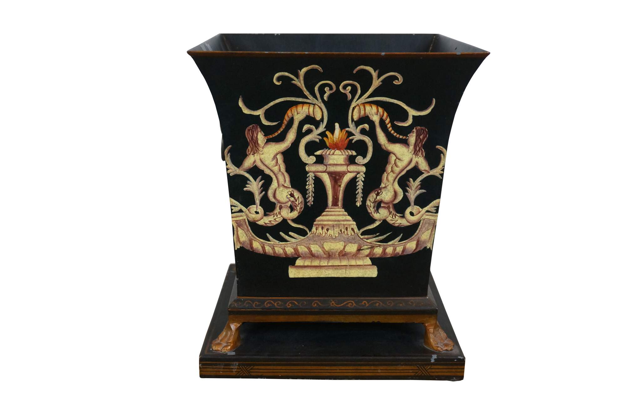 Late 20th-century tableware bin/ planter/ jardiniere - square shape with flared mouth and double ring handles, paw feet and square base, painted in black with a neoclassically inspired motif in gold of eagles, mermen blowing horns and flaming urns.