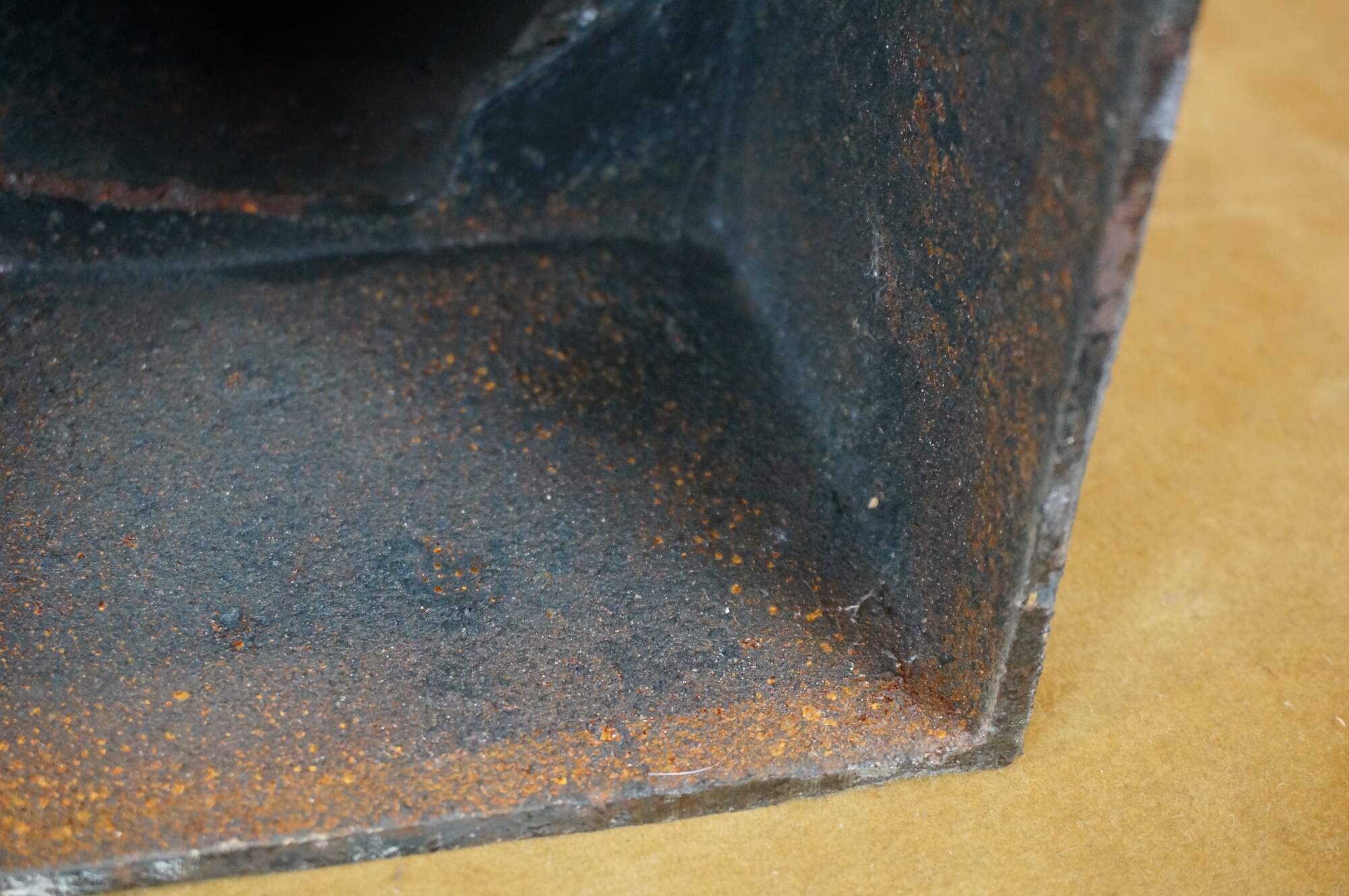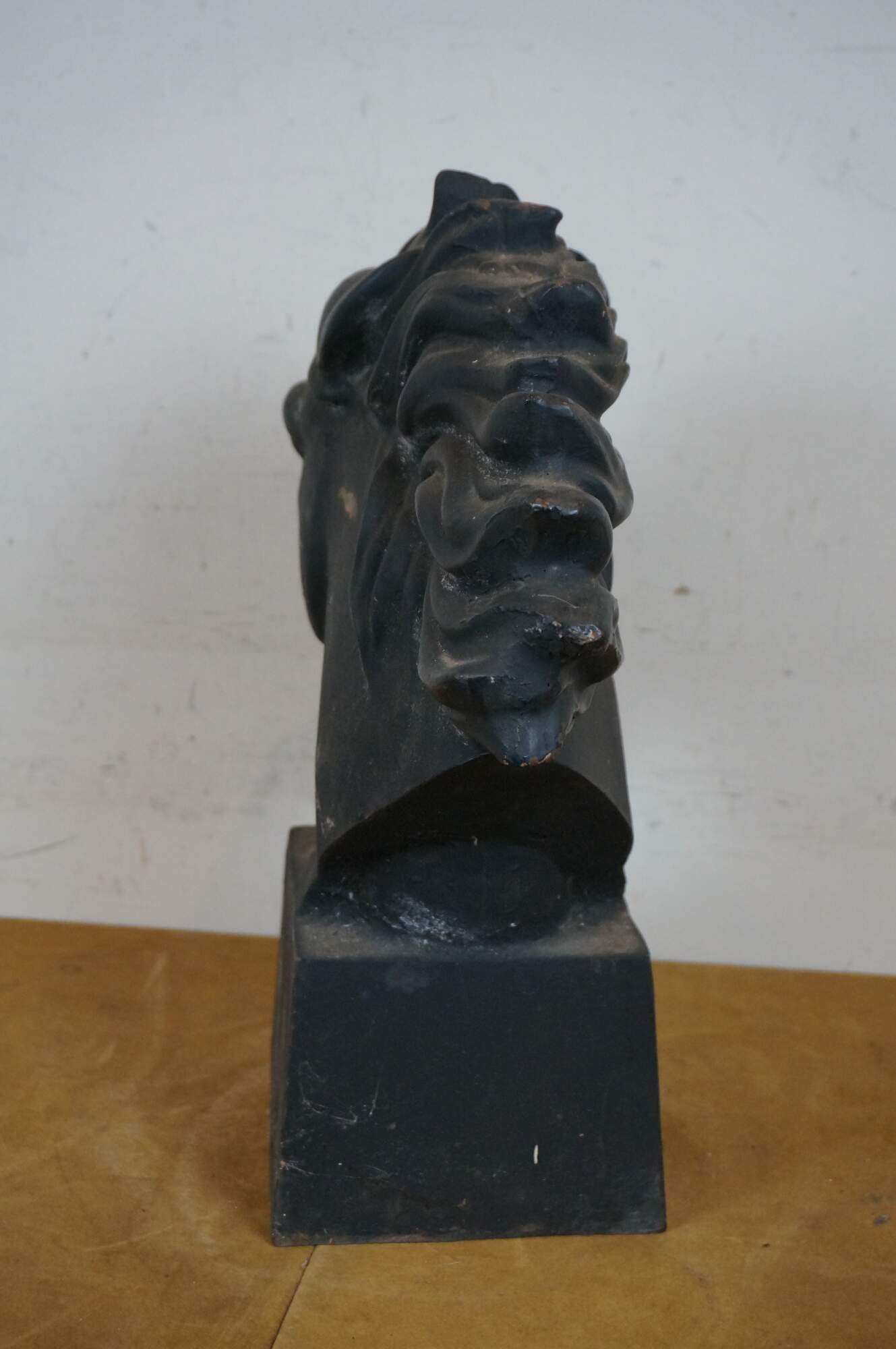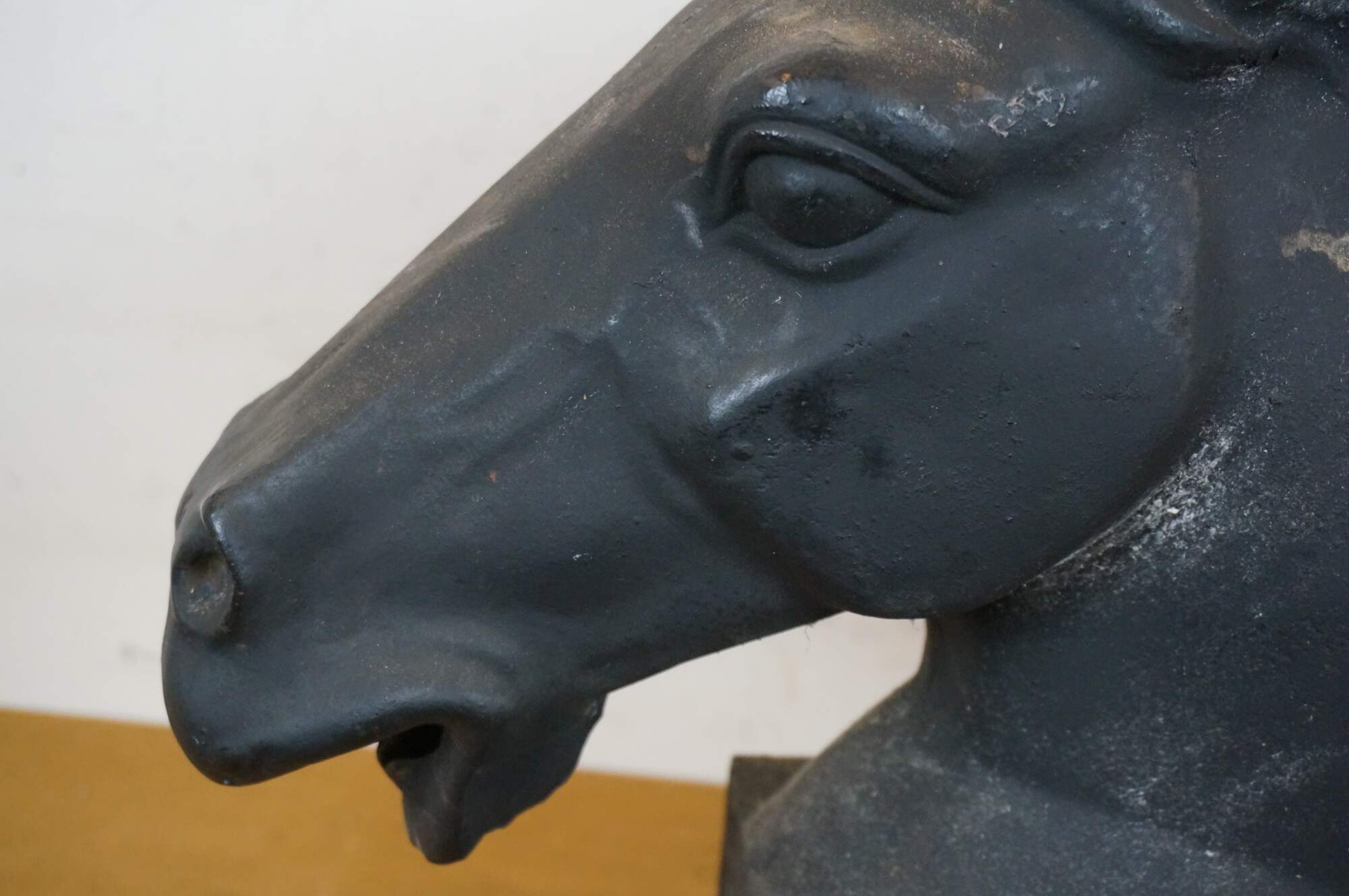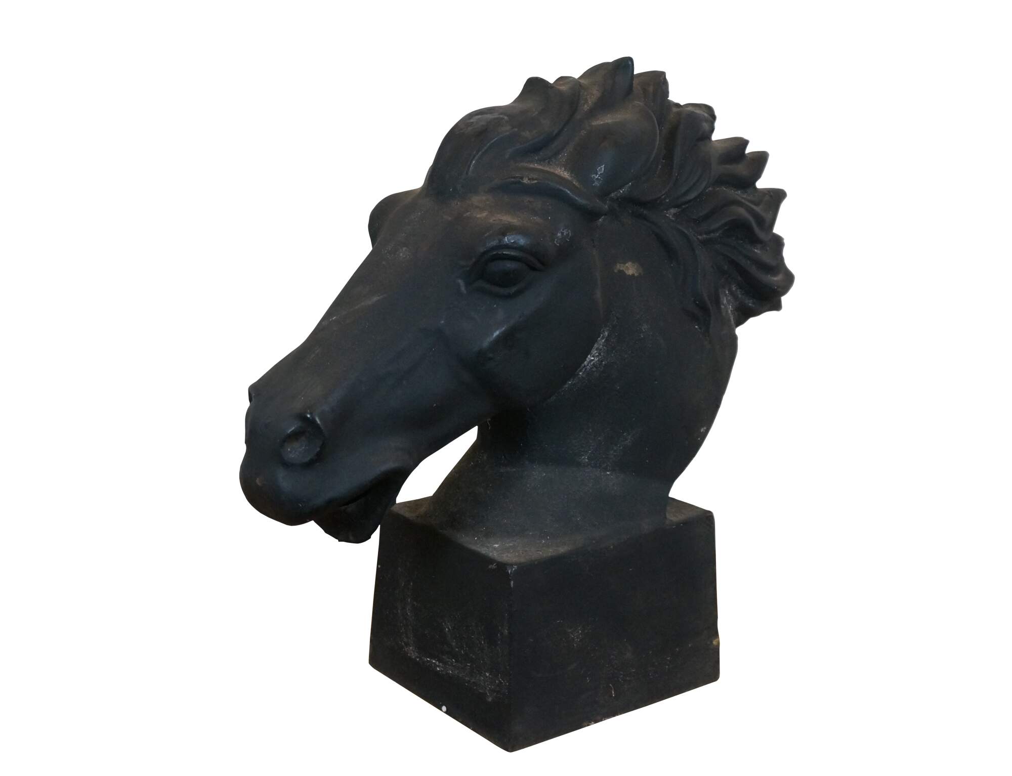 Vintage cast iron garden sculpture depicting the bust / head of a galloping horse / bronco / mustang, mane blowing in the wind, mounted on a square base, painted with a matte black finish.