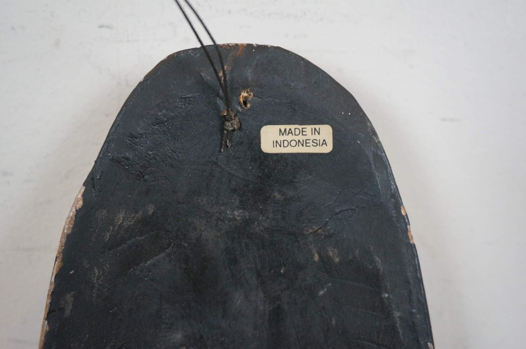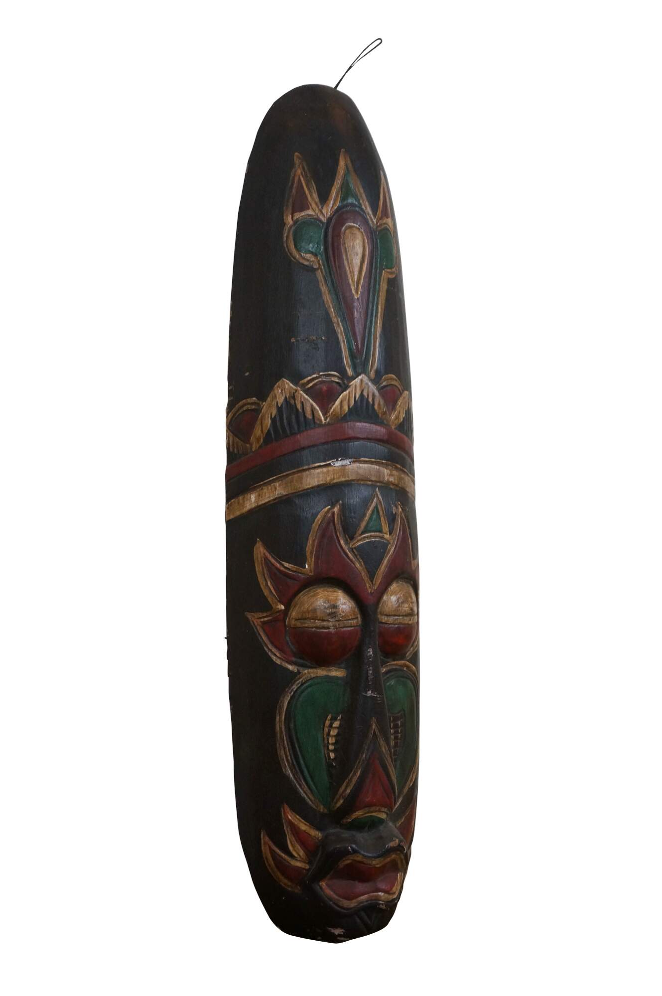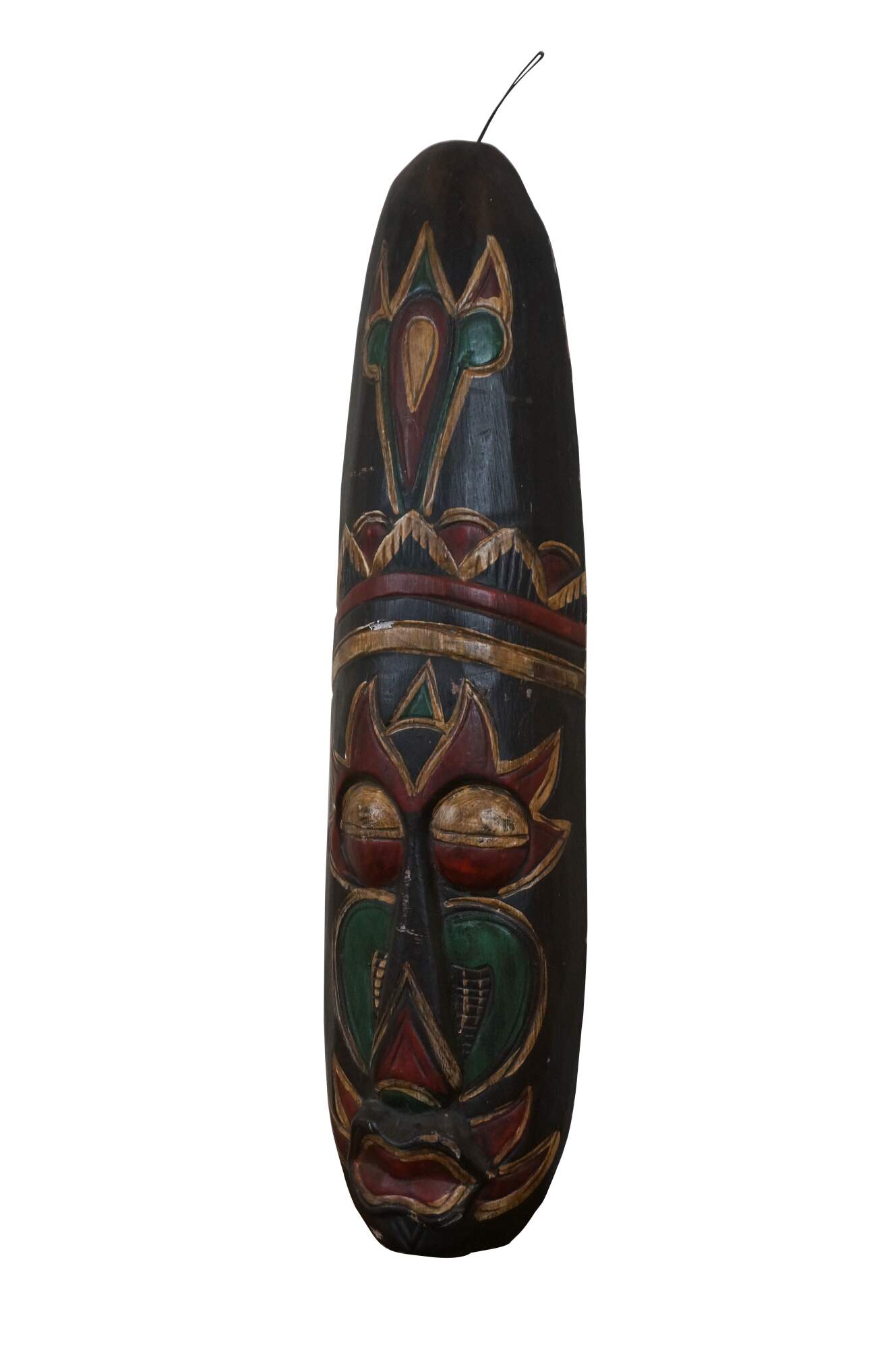 Vintage 20th century carved folk art mask featuring an elongated oval face with high forehead, painted with designs evoking flames and a crown of flowers, green, red, and gold on black. Made in Indonesia.