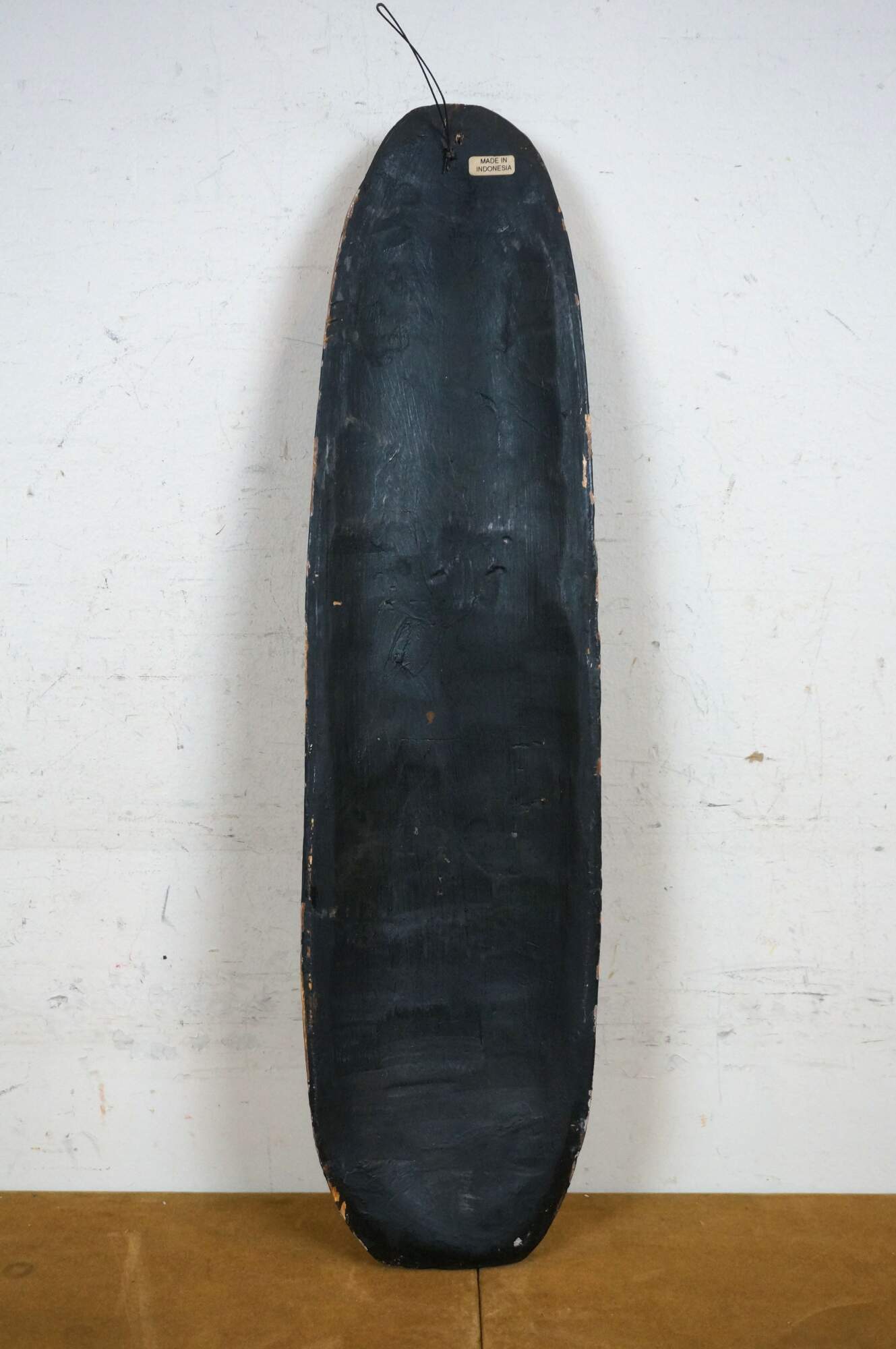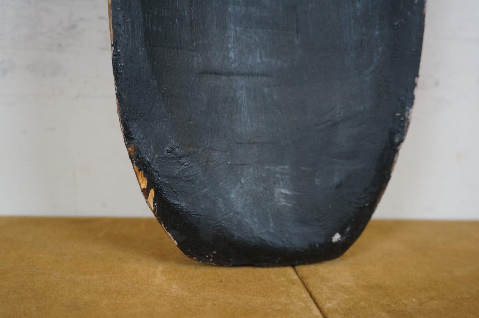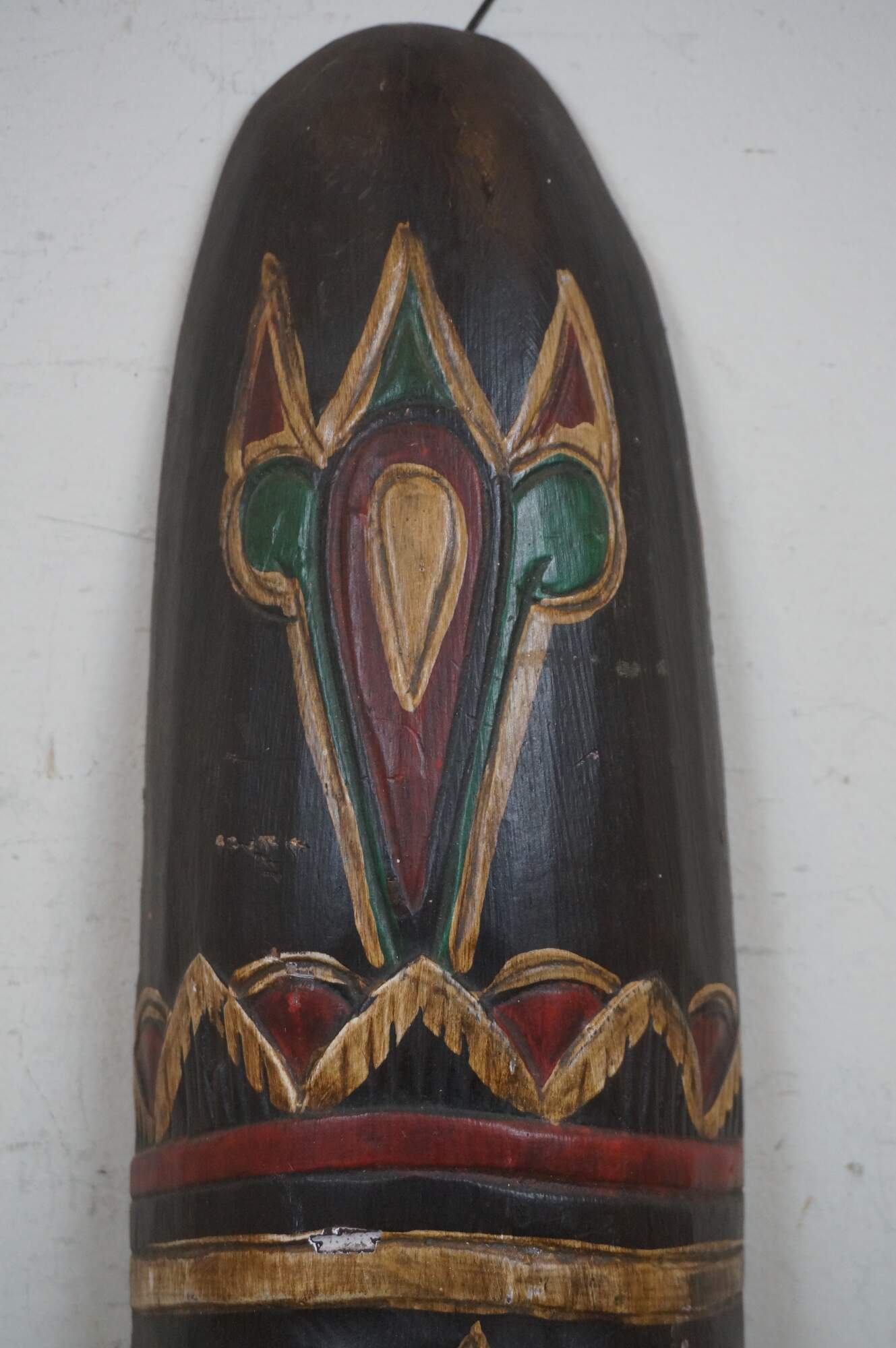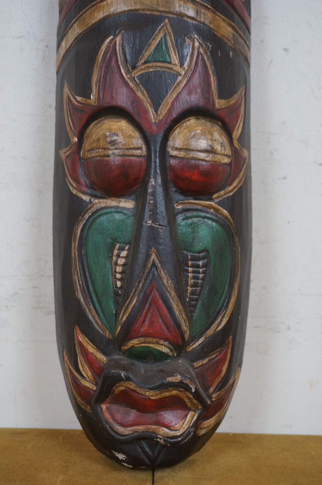 Vintage 20th century carved folk art mask featuring an elongated oval face with high forehead, painted with designs evoking flames and a crown of flowers, green, red, and gold on black. Made in Indonesia.