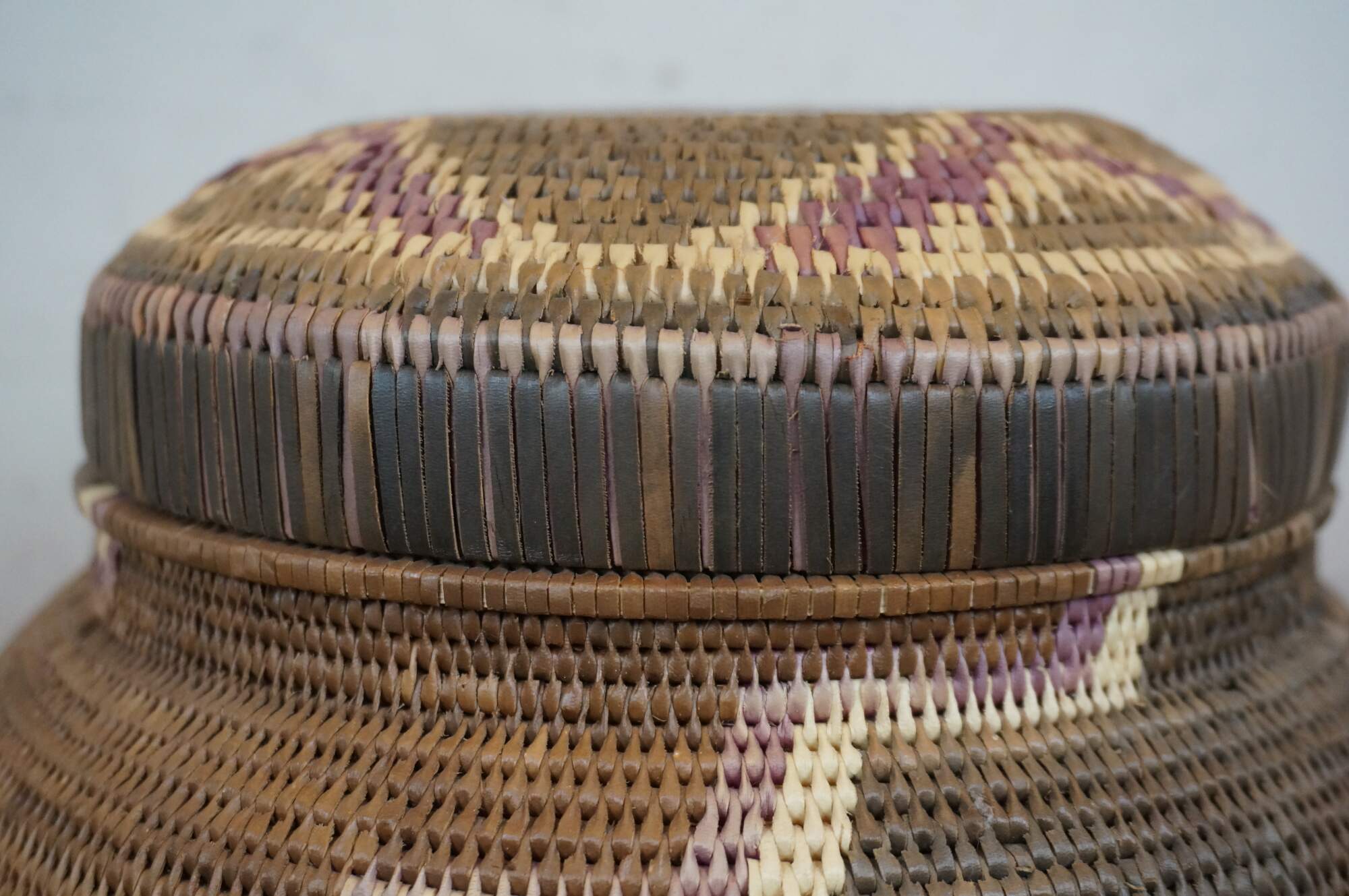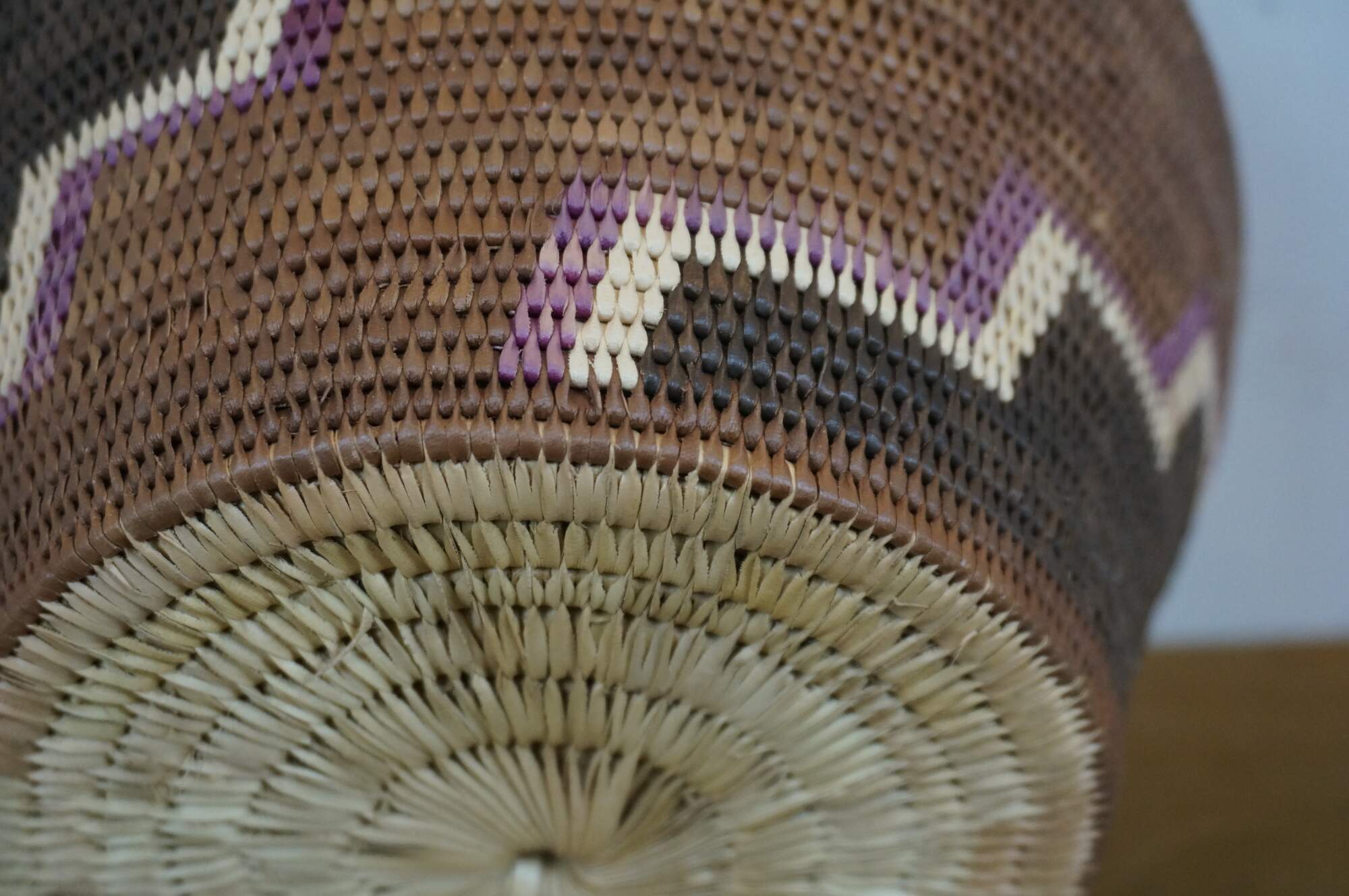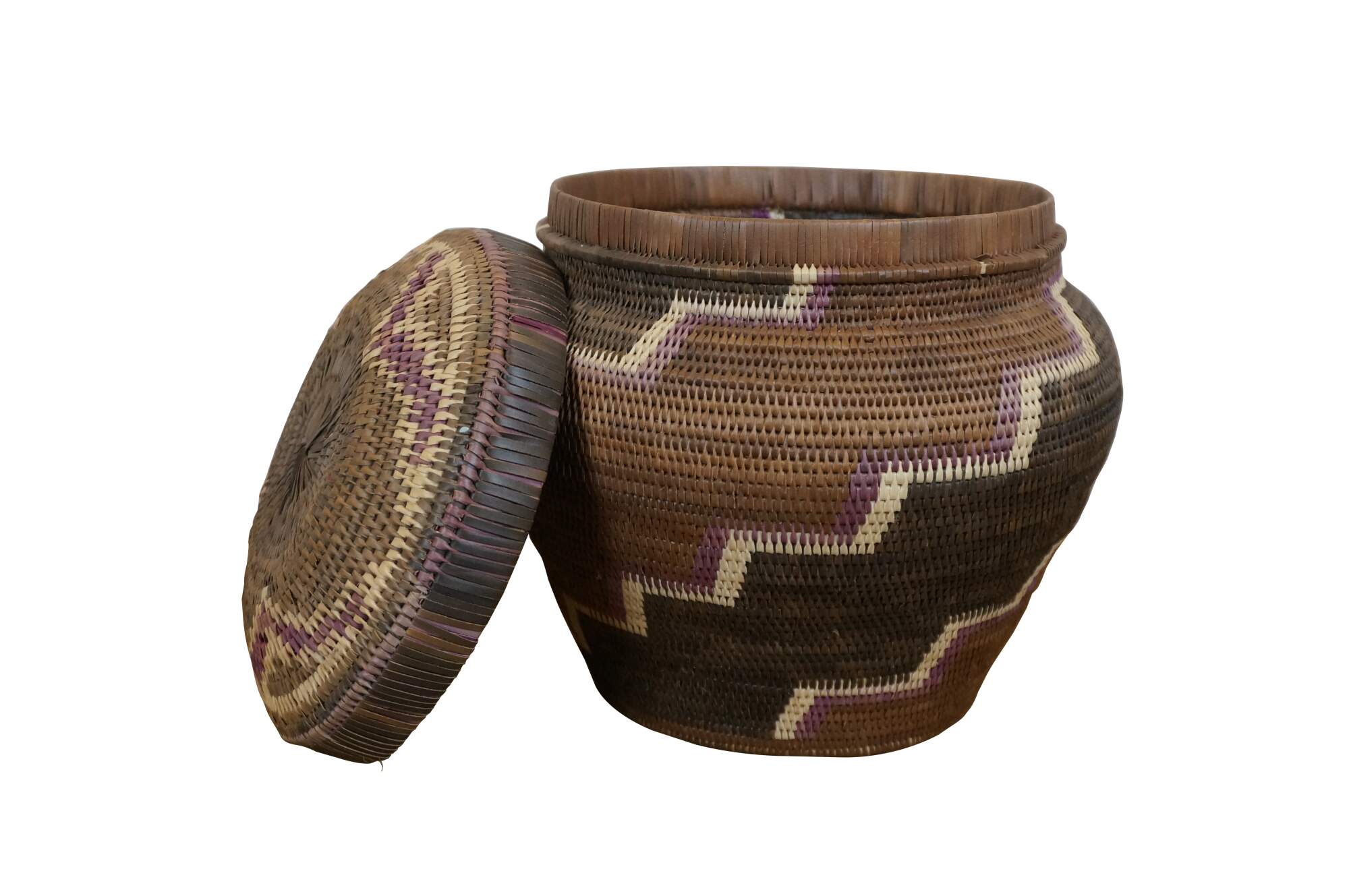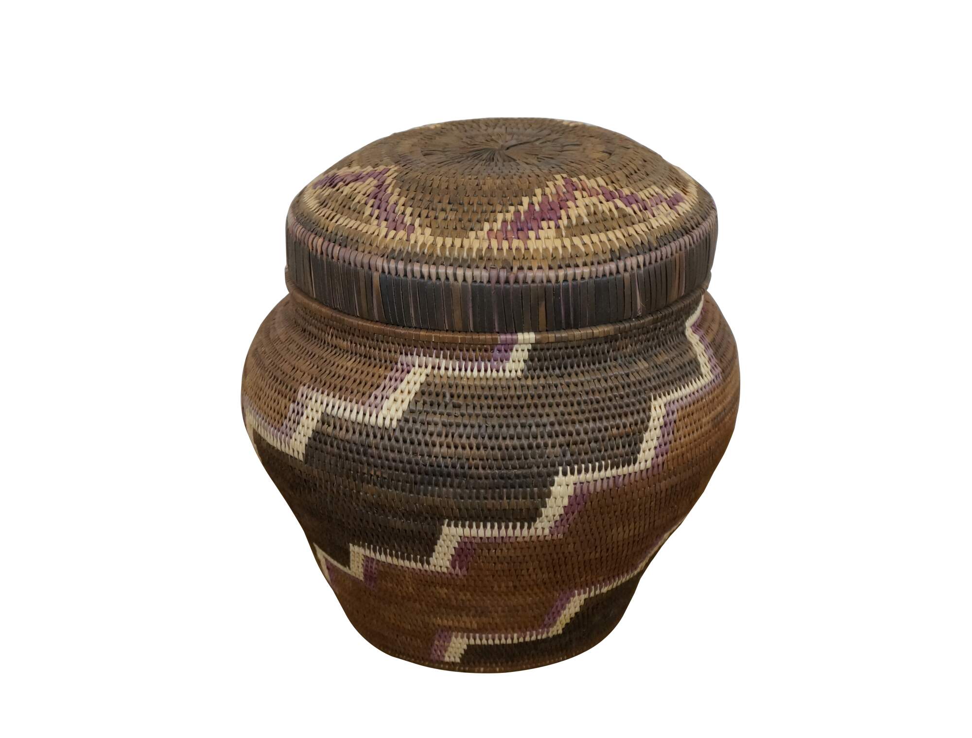 Late 20th century hand woven lidded basket - urn shape featuring a broad zip-zag pattern in white, purple, and shades of brown with domed top accented with chevrons.
