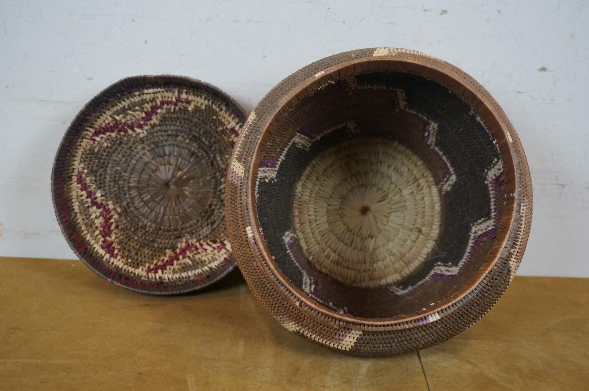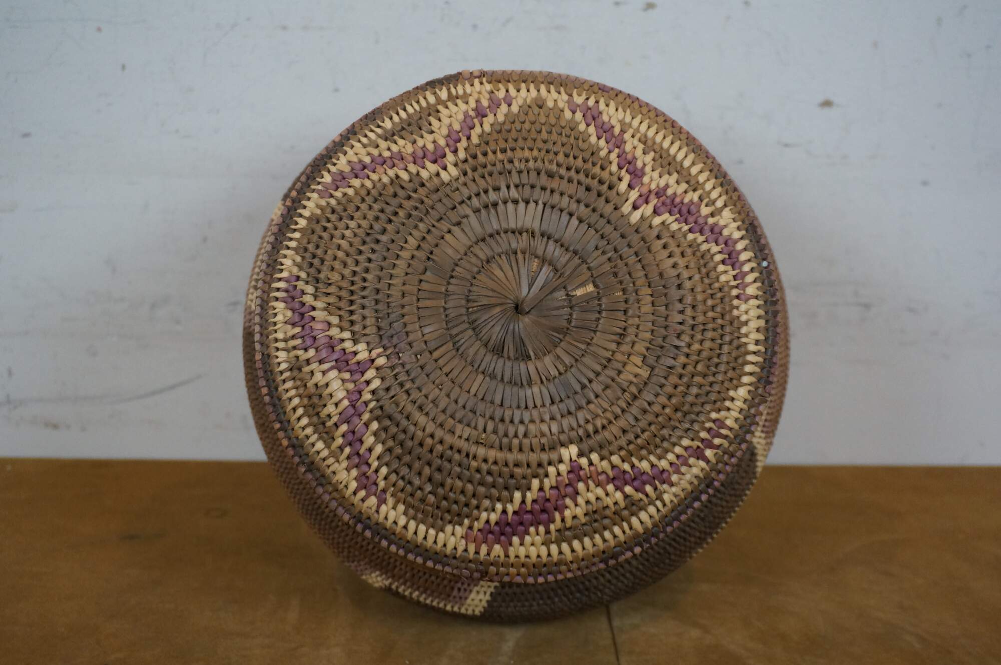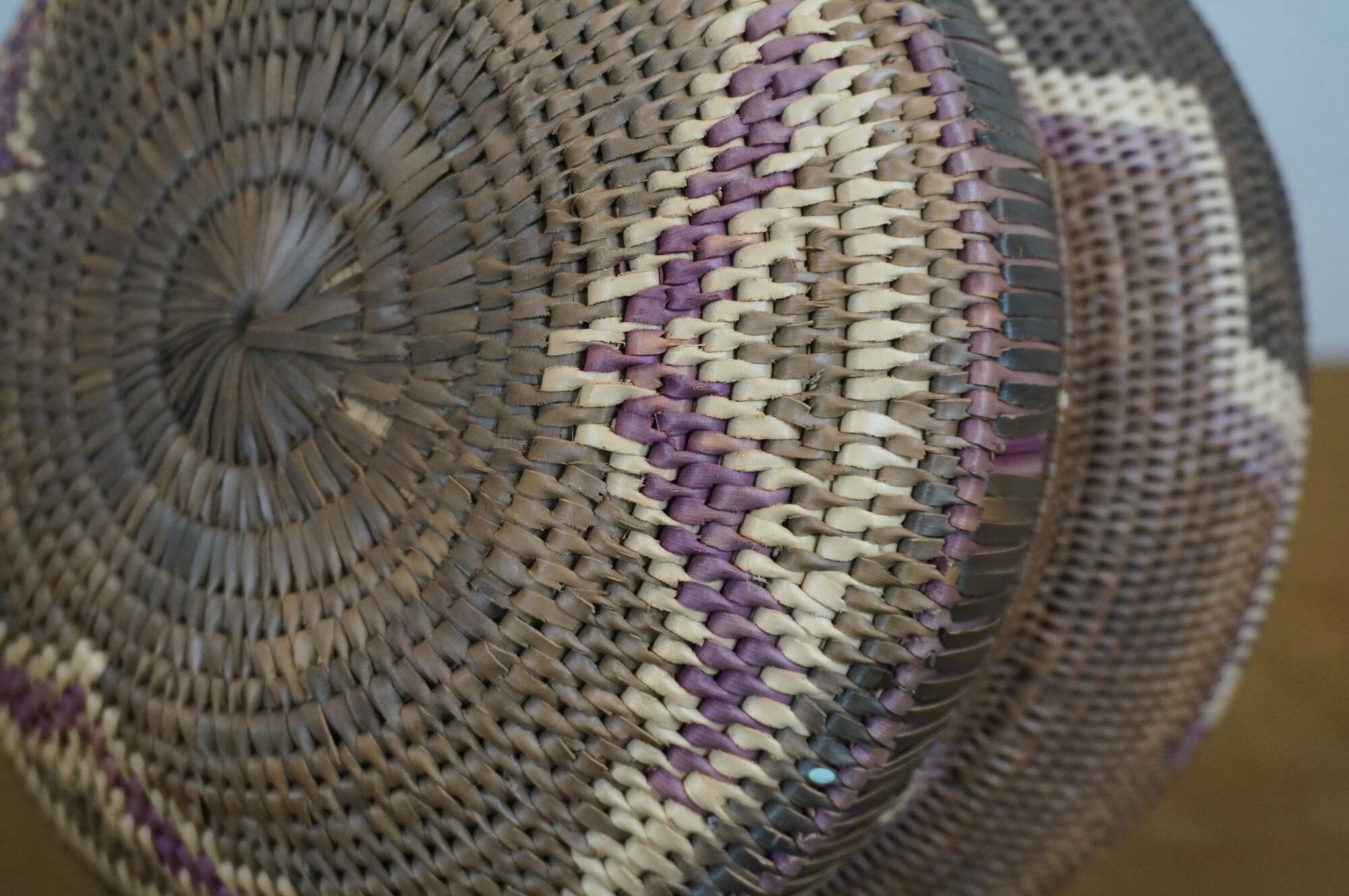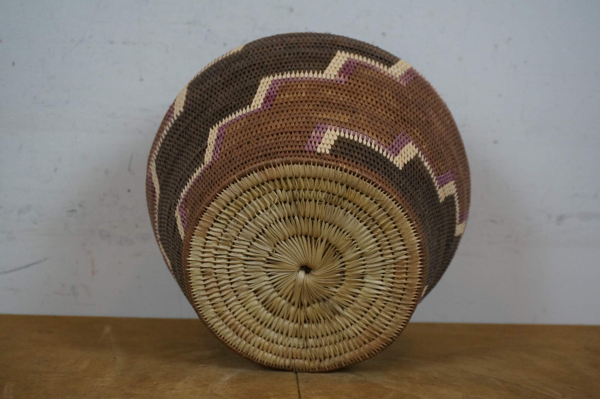 Late 20th century hand woven lidded basket - urn shape featuring a broad zip-zag pattern in white, purple, and shades of brown with domed top accented with chevrons.