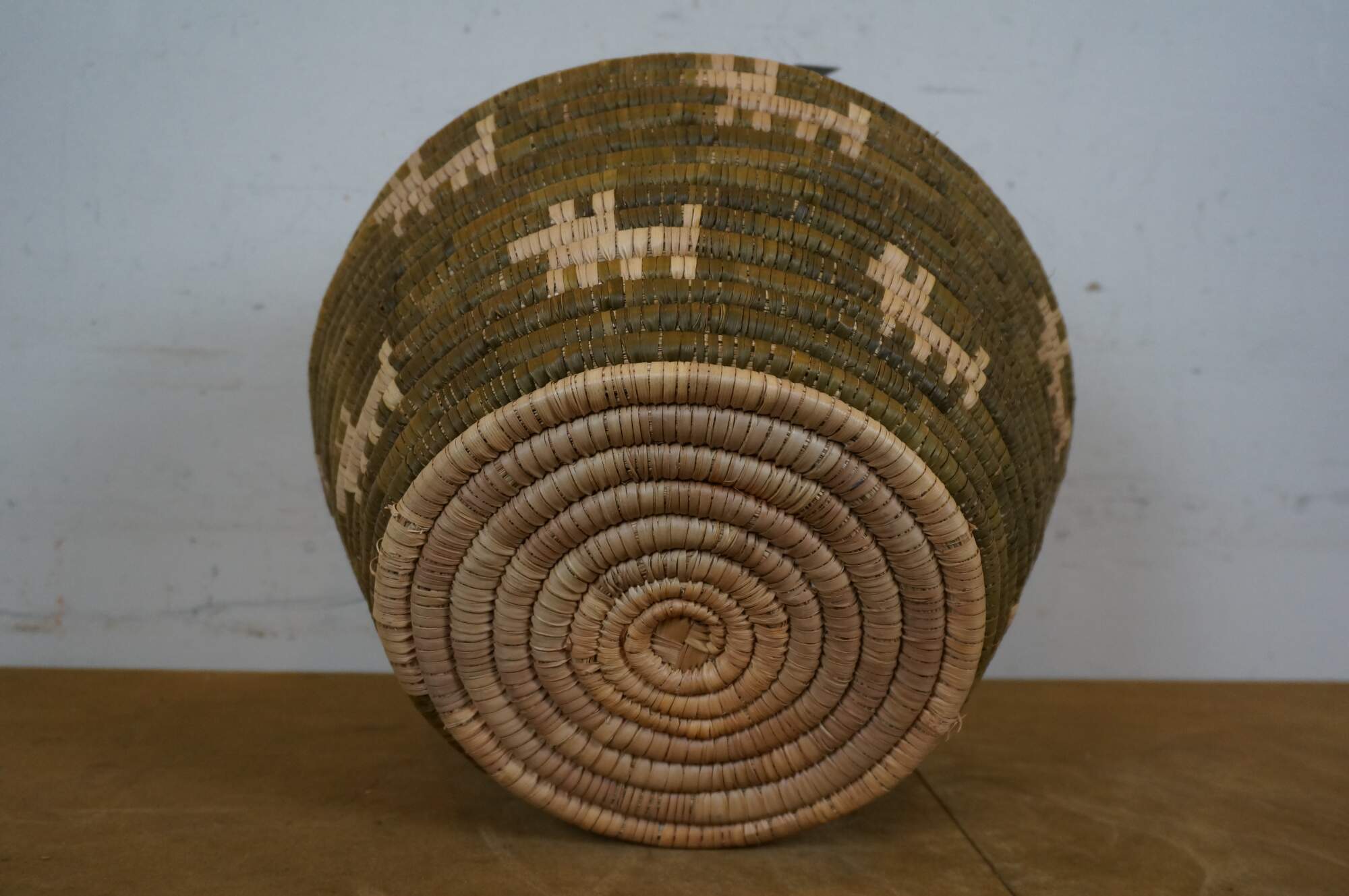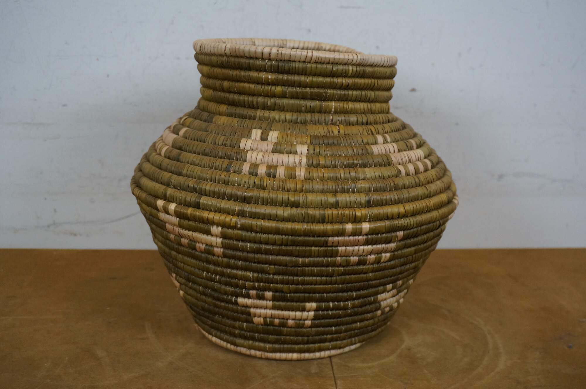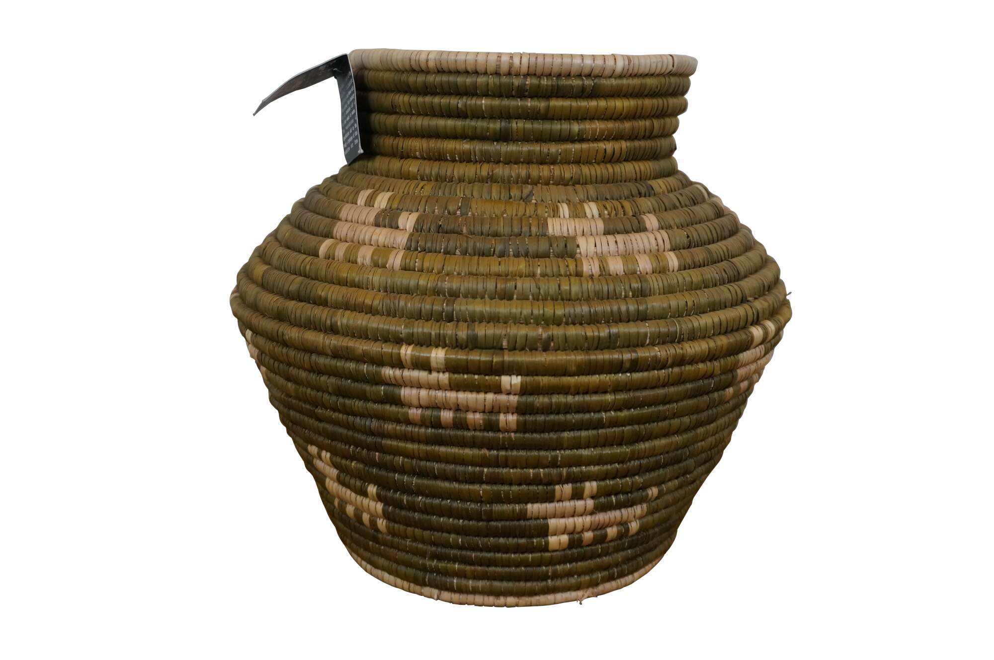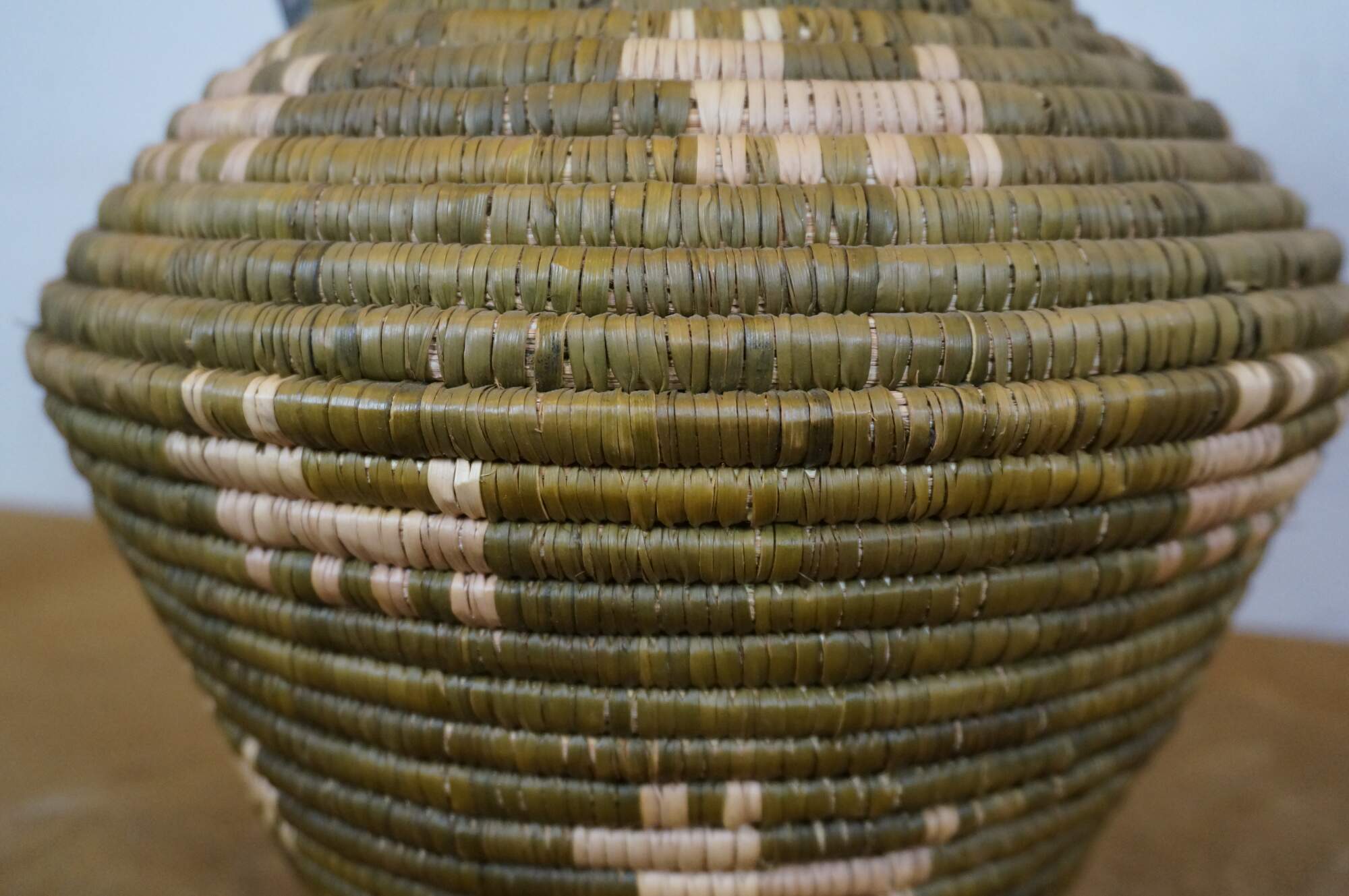 Late 20th century Shalimar Collection hand woven, coiled palm leaf basket vase. Olive green with light beige rim and a pattern of animals. Made in Pakistan.