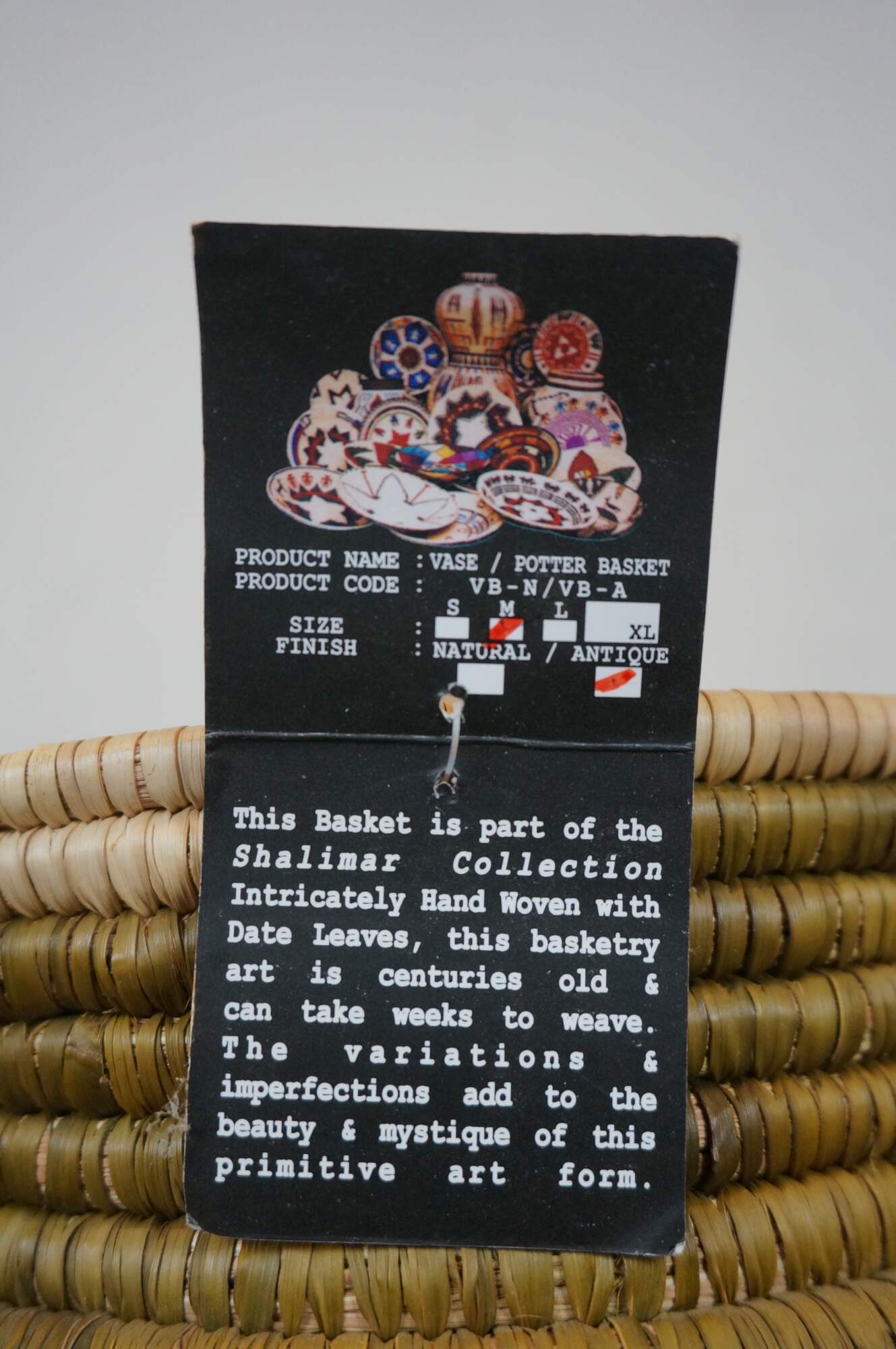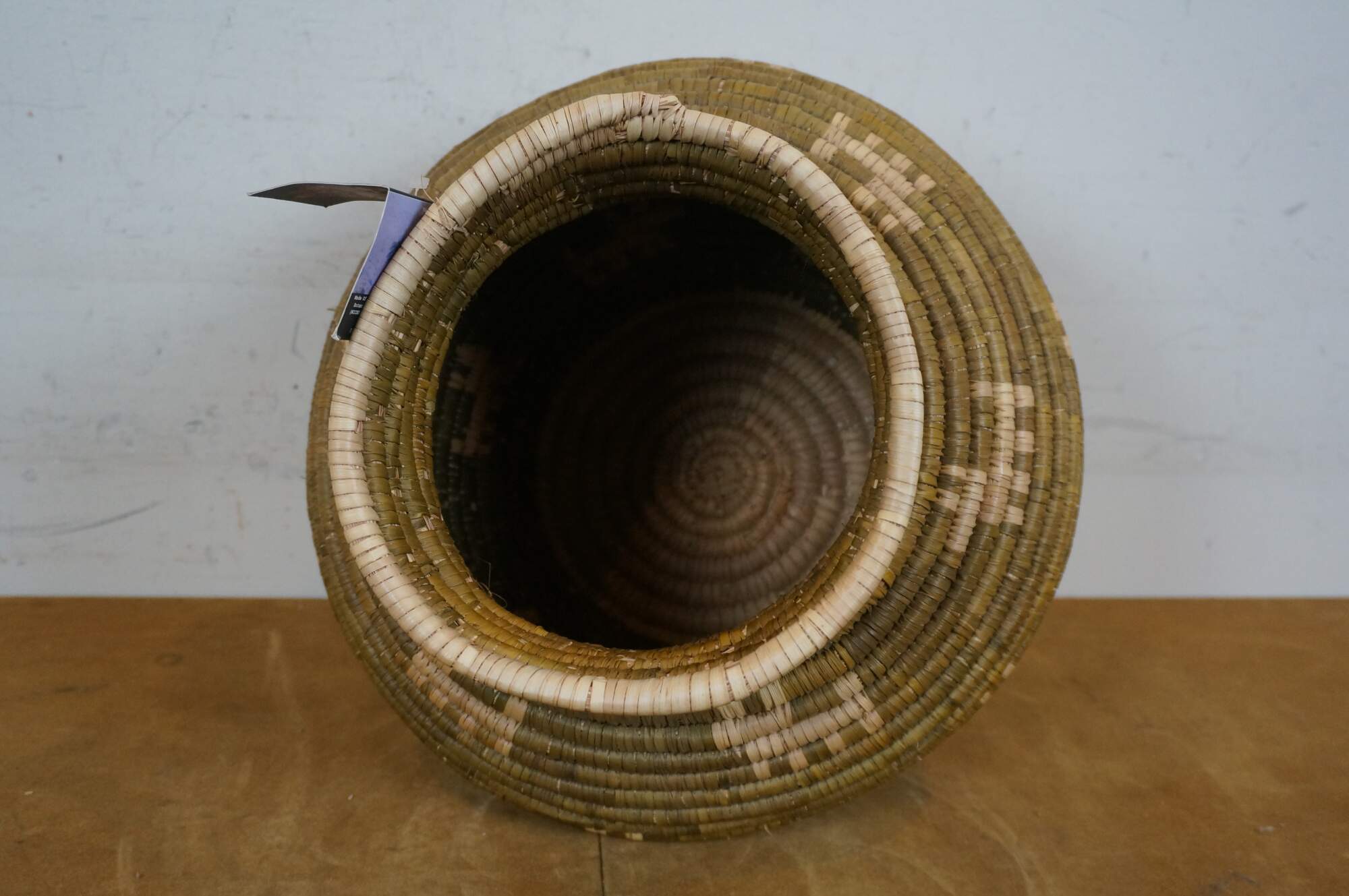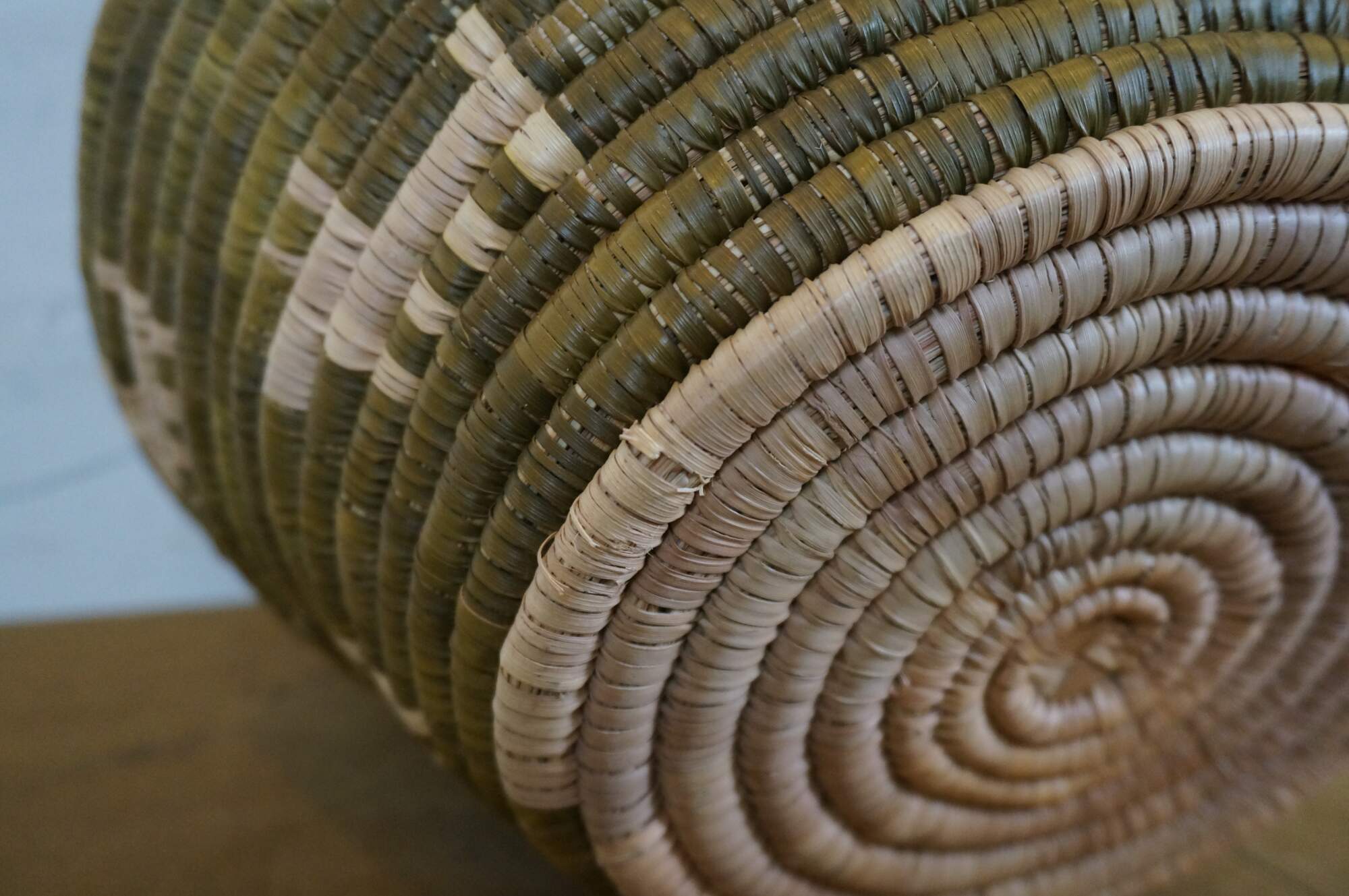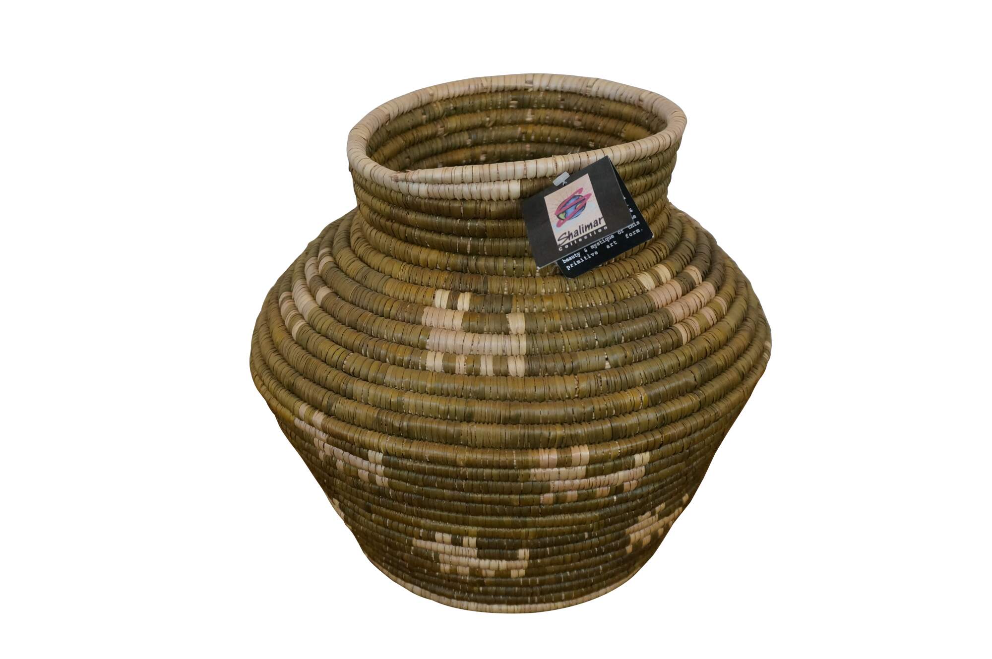 Late 20th century Shalimar Collection hand woven, coiled palm leaf basket vase. Olive green with light beige rim and a pattern of animals. Made in Pakistan.