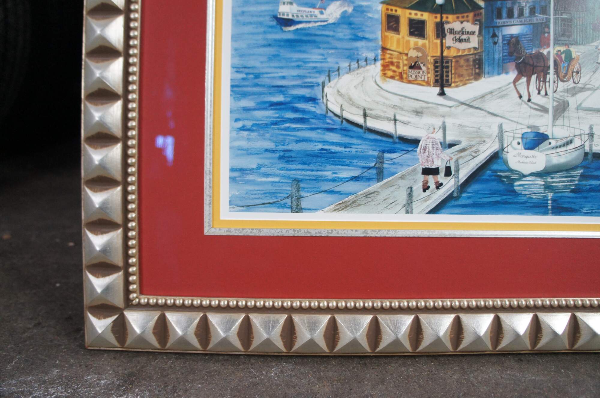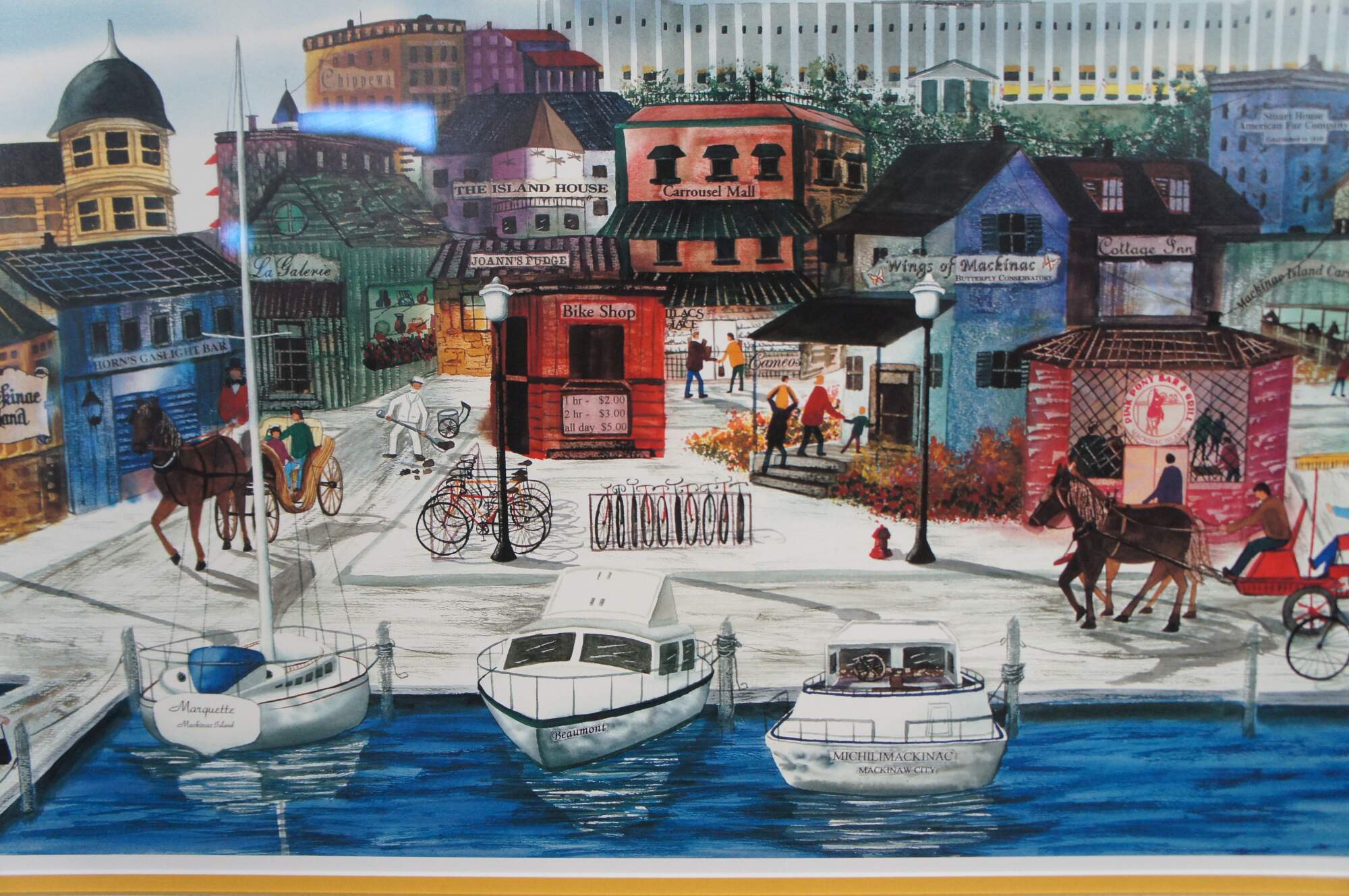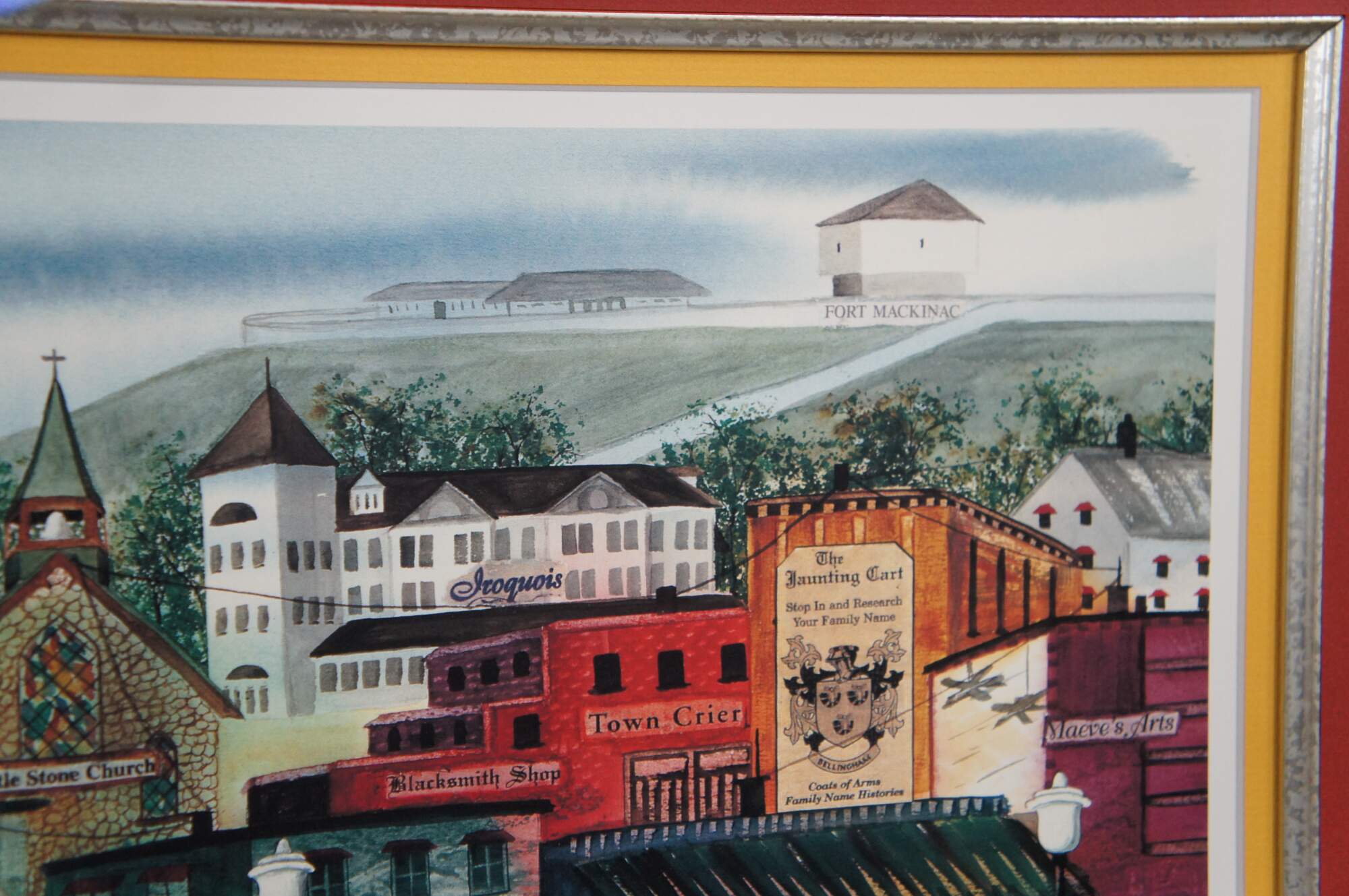 Vintage Kathy Boltz Phillips lithograph print titled Mackinac Island. It featurings a charming view of the famous car free Michigan town off Lake Huron known for its Victorian architecture, fudge and historic landmarks. Signed in stone and by hand lower right, edition 19 of 500.
